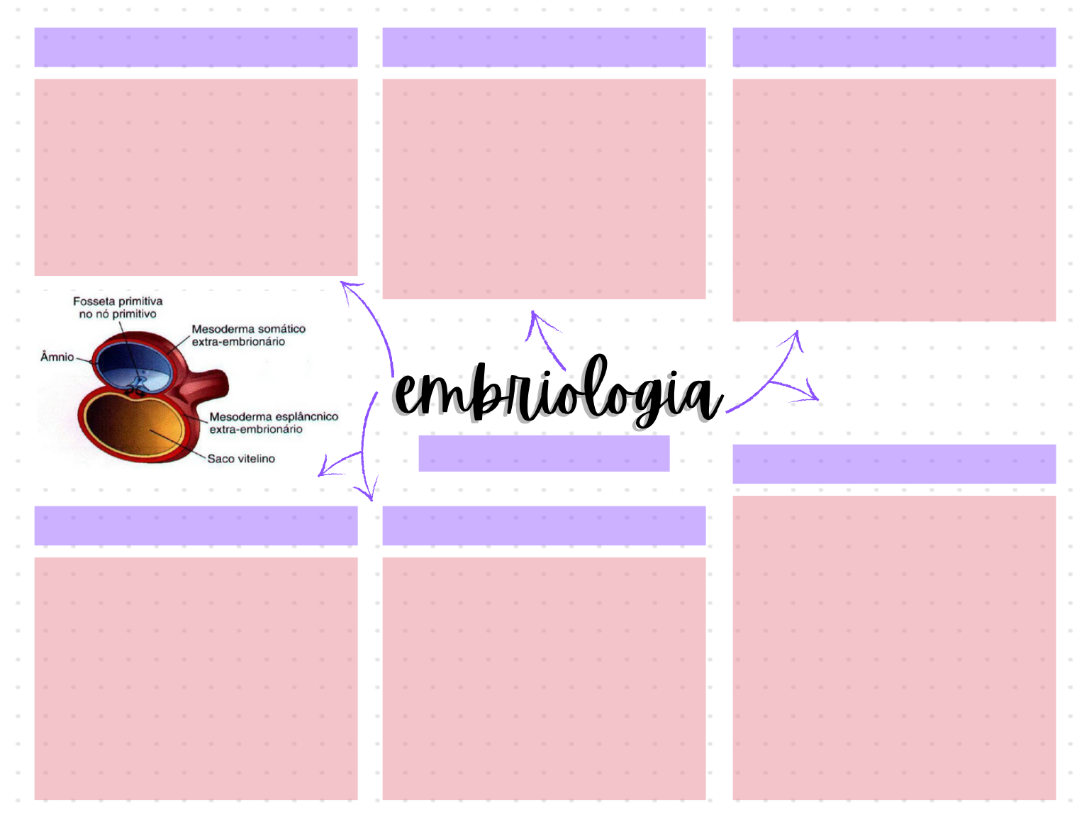 As células pré-notocordais que invaginam na região da fosseta primitiva se deslocam para a região cefálica até alcançarem a placa precordal. A placa se desprende do endoderma e forma notocorda. As partes cefálica e caudal do embrião são estabelecidas antes que a linha primitiva tenha se formado. Assim, as células do hipoblasto (endoderma) na margem cefálica do disco formarão o EVA, que expressa genes de formação da cabeça. As células epiblásticas que se movem pelo nó e pela linha primitivos são predeterminadas por suas posições a se tornarem tipos específicos de mesoderma e de endoderma. Assim, é possível elaborar um mapa de destino do epiblasto mostrando seu padrão. A expansão do disco embrionário ocorre principalmente na região cefálica. O crescimento e o alongamento da parte cefálica do disco são causados por migração contínua de células da região da linha primitiva no sentido cefálico. As vilosidades primárias adquirem um centro mesenquimatoso, no qual surgem pequenos capilares. Quando esses capilares fazem contato com os capilares da placa coriônica e do pedúnculo embrionário, o sistema viloso está pronto para fornecer nutrientes e oxigênio ao embrião. semana 3 Gastrulação É o processo que estabelece as três camadas germinativas (ectoderma, mesoderma e endoderma) no embrião. E essas camadas formam todos os tecidos e órgãos. Notocorda Eixos Corporais Mapa de Destino Discos Embrionários Trofloblasto