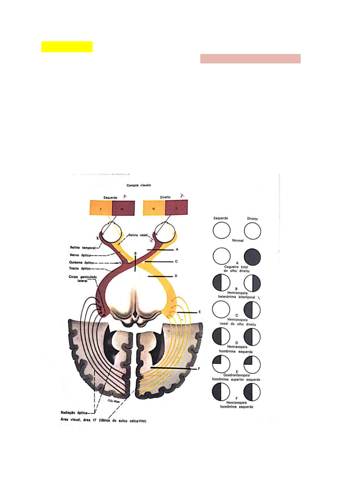 TUTORIA 4 UC 8 Karolina Cabral Machado - P3 2020.2 fonte:Guyton (Cap.51, 52, 53, 54) Porto (Cap.19) Termos desconhecidos: ● Hipoacusia: Redução na acuidade auditiva. ● Anosmia: Perda do olfato. ● Hipogeusia: Redução no paladar . ● Amaurose bilateral súbita: Cegueira bilateral de forma súbita, lesão no nervo óptico. ● Hemianopsia: Perda da metade do campo visual ● Hemianopsia homônima direita:Perda da metade do campo visual referente à retina temporal do olho direito e da retina nasal do olho esquerdo. Provável lesão no trato óptico direito. (a lesão está no lado da retina temporal afetada) Hipóteses: 1. Sr. Aldo possui doenças crônicas – HAS e diabetes- que podem agravar o quadro que ele estava apresentando. 2. Hipoacusia é própria do processo de envelhecimento. 3. O quadro emocional pode ter influenciado no processo saúde-doença do Sr. Aldo. 4. Sr. Aldo foi morar com a neta p/ melhor controle das medicações devido a sua situação (problemas de memórias, doenças crônicas). 5. A infecção de IVAS tá provocando o quadro de alterações dos sentidos (hipogeusia e anosmia). 6. Amaurose bilateral súbita pode ser resultado de um AVE, complicação da HAS. 7. A visão é resultado de uma interpretação em diversas áreas do córtex, lobo occipital sendo a principal área de interpretação da visão e o lobo temporal para a audição. 8. Diferentes lesões no trato óptico afetam de forma diferente a visão. 9. A área afetada pelo AVE está provocando essa alteração nos sentidos, podendo ser uma lesão na porção do tronco onde há a saída dos nervos cranianos. 10. No caso de uma isquemia aguda transitória (no caso de uma circulação colateral), pode haver um retorno nos sentidos, no entanto, apresentando sequelas. 11. AUDIÇÃO: Os sons são transformados em vibrações pelo ouvido interno e a informação é levada ao córtex onde a informação é interpretada. 12. OLFATO: Cheiro > nervo olfatório > estímulo > córtex. 13. PALADAR: Sabores (amargo, doce, salgado) > nervo gustativo > estímulo > córtex. 14. Exames para avaliar a visão: Escala de Snellen (acuidade visual), campo de visão. Objetivos: 1. Descrever a fisiologia da visão (mecanismo de formação e interpretação da imagem); ● VISÃO: A fóvea central, com apenas 0,3 milímetro de diâmetro, é composta quase inteiramente por cones. Esses elementos têm uma estrutura especial que auxilia na detecção de detalhes na imagem visual. A substância fotoquímica, sensível à luz, é encontrada no segmento externo. No caso dos bastonetes, a substância fotoquímica é a rodopsina; nos cones, é uma das três substâncias fotoquímicas “coloridas”, em geral, chamadas simplesmente pigmentos coloridos, que funcionam quase exatamente do mesmo modo que a rodopsina, exceto por diferenças na sensibilidade espectral. A rodopsina e os pigmentos coloridos são proteínas conjugadas. Eles são incorporados às membranas dos discos, sob a forma de proteínas transmembrana. As concentrações desses pigmentos fotossensíveis, nos discos, são tão grandes que os próprios pigmentos constituem cerca de 40% de toda massa do segmento externo. O segmento interno do bastonete ou do cone contém o citoplasma usual, com organelas citoplasmáticas. São principalmente importantes as mitocôndrias que, como explicado adiante, desempenham papel significante no fornecimento de energia para a função dos fotorreceptores. O corpo sináptico é a parte do bastonete ou cone que se liga às células neuronais subsequentes, as células horizontais e bipolares que representam os estágios seguintes da cadeia celular responsável pela visão. O pigmento negro melanina, na camada pigmentar, impede a reflexão da luz por todo o globo ocular, o que é extremamente importante para a visão nítida. Sem ele, os raios de luz seriam refletidos em todas as direções, dentro do globo ocular e causariam iluminação difusa da retina, e não o contraste normal entre as manchas escura e clara, necessário para a formação de imagens precisas. A camada pigmentar também armazena grandes quantidades de vitamina A. Essa vitamina A se difunde livremente pelas membranas celulares dos segmentos externos dos bastonetes e cones, é precursora importante das substâncias fotossensíveis dos bastonetes e cones. Bastonetes e cones contêm substâncias químicas que se decompõem pela exposição à luz e, no processo, excitam as fibras do nervo óptico. A substância química sensível à luz, nos bastonetes, é chamada rodopsina; as substâncias químicas fotossensíveis nos cones, os chamados pigmentos dos cones ou pigmentos coloridos, têm composições, apenas, discretamente diferentes das da rodopsina. O pigmento fotossensível dos bastonetes, chamado rodopsina ou púrpura visual, é a combinação da proteína escotopsina com o pigmento carotenoide retinal (também chamado “retineno”). Além disso, o retinal é tipo particular, chamado 11-cis retinal. Essa forma cis do retinal é importante, porque somente ela pode se ligar à escotopsina, para sintetizar rodopsina. Quando a energia luminosa é absorvida pela rodopsina, essa começa a se decompor dentro de fração muito pequena de segundo. A causa dessa rápida decomposição é a fotoativação de elétrons, na parte retinal da rodopsina, o que leva à mudança instantânea da forma cis do retinal para a forma toda-trans, o retinal todo-trans começa a se afastar da escotopsina. O produto imediato é a batorrodopsina, que é uma combinação parcialmente degradada do retinal todo-trans e da escotopsina. A batorrodopsina é extremamente instável e decai em nanossegundos para lumirrodopsina. Esse produto, então, decai em microssegundos para metarrodopsina I e, depois, em cerca de 1 milissegundo, para metarrodopsina II e, por fim, muito mais lentamente (em segundos), para os produtos de degradação completos escotopsina e retinal todo-trans. É a metarrodopsin