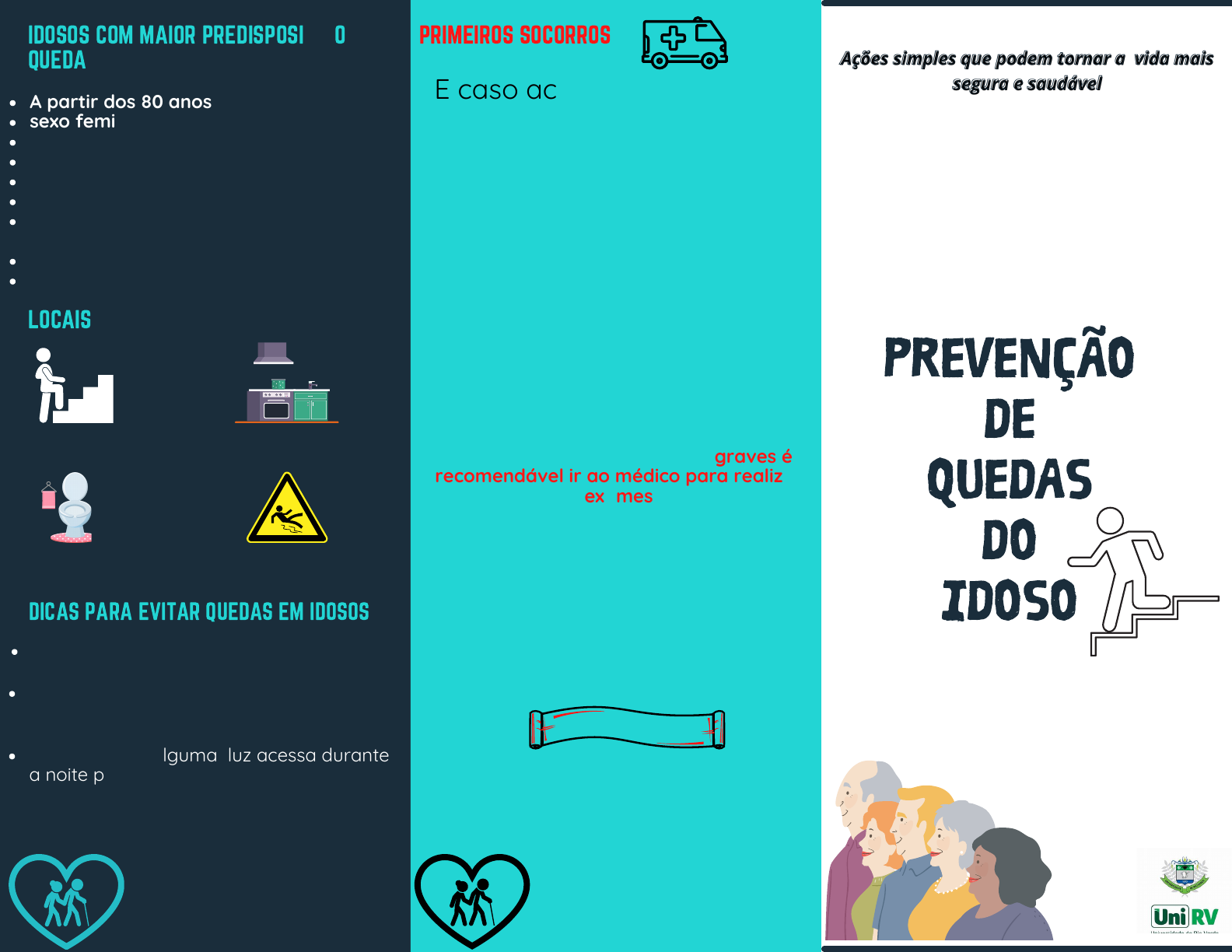 Realização: Prevenção de quedas do idoso A partir dos 80 anos sexo feminino imobilidade história prévia de quedas baixa aptidão física doença de Parkinson fraqueza muscular e de membros inferiores marcha lenta com passos curtos dano cognitivo PRIMEIROS SOCORROS IDOSOS COM MAIOR PREDISPOSIÇÃO À QUEDA LOCAIS ATENÇÃO: no caso de quedas graves é recomendável ir ao médico para realizar exames E caso aconteça a queda? Primeiros socorros básicos Número de socorro SAMU - 192 Diante a queda deve–se avaliar as respostas do idoso Avaliar as condições físicas do idoso (breve exame físico, procurando lesões) Manter o idoso imobilizado e ligar para emergência DIA MUNDIAL DE PREVENÇÃO DE QUEDAS Cozinha Locais com piso molhado Escadas Banheiros Em caso de quedas sem lesão grave ou contusão: gelo para diminuir o inchaço DICAS PARA EVITAR QUEDAS EM IDOSOS Mantenha os pisos secos Instale barras de apoio no banheiro e demais cômodos Deixe sempre alguma luz acessa durante a noite para facilitar assim sua locomoção. Providencie um interruptor de luz ao lado da cama ou um abajur. DIA 24/06 DICAS PARA EVITAR QUEDAS EM IDOSOS Não deixe: que extensões elétricas ou fios de telefone cruzem o caminho e não permita que sapatos, brinquedos e outros objetos fiquem espalhados pelo chão. Ao utilizar escadas e corredores, use corrimão Utilize sofás mais altos e firmes e poltronas com braços. Não utilize armários muito altos que necessitem de bancos ou escadas para alcançar os objetos. Além disso, os armários devem ser de fácil alcance e fixados à parede Faça exames oftalmológicos anualmente. Ajuste a altura da cama e se preciso troque o colchão por um mais firme. Reduza a ingestão de bebidas alcoólicas Participe de programas de atividade física que visem agilidade, equilíbrio,coordenação e força muscular. Evite tomar banho em banheiros com box de vidro, sem tapete antiderrapante e sem barras de apoio. Fortaleça os ossos. Consuma peixes, leite, iogurtes e outros derivados do leite. Se necessário, consulte um médico para suplementar cálcio. Use sapatos corretos (solo antiderrapante). Ande na rua com calma. Substituir o box de vidro por cortinas Utilizar tapetes antiderrapantes Instalar barras de apoio nas paredes. Evite andar em pisos úmidos. Fique atento aos efeitos colaterais de remédios. Use tapetes emborrachados antiderrapantes. Logo, não utilize tapetes de tecido (ou retalhos), eles podem provocar escorregões. Aumente a iluminação: use lâmpadas fluorescentes, cortinas claras, assento do vaso sanitário e pia em cores diferentes do piso e do chão Aumentar a altura do vaso e instale barras de apoio laterais e paralelas ao vaso. DICAS PARA EVITAR QUEDAS EM IDOSOS REALIZAÇÃO: APOIO: Brenda Cariolita Japiassu Gabriel Souza Santos da Silva Jhemily Lopes Lima Vilaça José Augusto Pires Letícia Mesquita Pacheco Lucas Antônio Renata Pelegrine Veridiana Dantas Vinícius Oliveira Santos Weberton Dorásio Profª Me: Ana Paula Gebrim Universidade de Rio Verde Câmpus Goianésia Evitar tapetes (substituir pelos antiderrapantes) Fisioterapeuta Dra. Laressa Quélita Climagem Rua 26 esquina com rua 33 Telefone: 33533248/ 6284944662 Instagram: @laryquellita Fisioterapeuta Dra. Naila Mendes Rua 19 Sul, n 460. Esq com Av. Mato Grosso. St Universitário Telefone: 33534881/ 985772756 Instagram: @nailamendesfisio @arteposturagoianesia