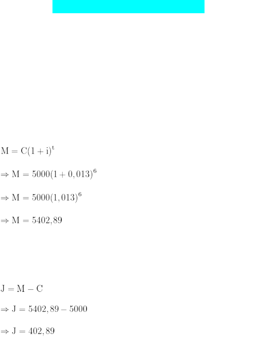 Questões de Juros Compostos Magali fez um empréstimo de R$ 5.000 por 1 ano e meio pagando 1,3% de taxa de juros compostos trimestral. Quanto Magali deverá pagar pelo empréstimo? Qual o valor dos juros? C = 5000; i = 1,3% = 0,013 ao trimestre; t = 1 ano e meio = 18 meses = 6 trimestres. Portanto, Magali terá que pagar R$ 5.402,89 pelo empréstimo. Os juros: Os juros do empréstimo são de R$ 402,89.