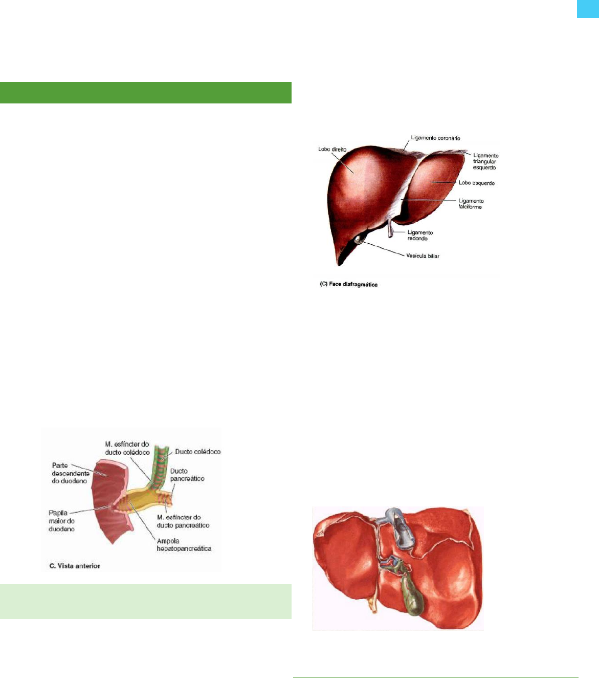 1 Gabrielle Nunes | P2| 2020 [ANATOMIA-3] FÍGADO → Maior glândula do corpo e segundo maior órgão → Nos fetos maduros o fígado atua, também, como um órgão hematopoiético → Com exceção da gordura, todos os nutrientes absorvidos pelo sistema digestório são levados primeiro ao fígado pelo sistema venoso porta. → Além de suas muitas atividades metabólicas, o fígado armazena glicogênio e secreta bile, um líquido amarelo-acastanhado ou verde que ajuda na emulsificação das gorduras. → A bile sai do fígado pelos ductos biliares — ductos hepáticos direito e esquerdo — que se unem para formar o ducto hepático comum, que se une ao ducto cístico para formar o ducto colédoco. → Vesícula biliar: Armazena a bile produzida pelo fígado e a concentra por meio da absorção de água e sais, principalmente no período entre as refeições. RELAÇÕES, ANATOMIA DE SUPERFÍCIE, FACES DO FÍGADO ▪ Situado principalmente no quadrante superior direito do abdome, onde é protegido pela caixa torácica e pelo diafragma. ▪ Ocupa a maior parte do hipocôndrio direito e do epigástrio superior e estende-se até o hipocôndrio esquerdo. → Face diafragmática convexa do fígado (anterior, superior e algo posterior): - Superfície lisa - É separada do diafragma pelos recessos subfrênicos. - Recessos subfrênicos – extensões superiores da cavidade peritoneal- direito e esquerdo divididos pelo ligamento falciforme. Recesso subhepático; - A face diafragmática do fígado é coberta por peritônio visceral, exceto posteriormente na área nua do fígado. → Face visceral relativamente plana, ou mesmo côncava (posteroinferior): Recesso hepatorrenal; - Superfície irregular - É coberta com peritônio exceto no leito da vesícula biliar e da porta do fígado, onde os vasos e ductos entram e saem do fígado. - Relaciona-se com: Vesícula biliar, omento menor área renal e suprarrenal, área cólica, área gástrica e pilórica e área duodenal; - Impressões na face visceral: suprarrenal (6), renal (1), duodenal (3), cólica (2), gástrica(5), esofágica (4) DIVISÃO ANATÔMICA: - O fígado pode ser dividido em lobos direito e esquerdo, que estão marcados na superfície diafragmática pela INSERÇÃO DO LIGAMENTO FALCIFORME e, na superfície visceral, pela FISSURA PARA O LIGAMENTO VENOSO, posteriormente, e pela FISSURA PARA O LIGAMENTO REDONDO, anteriormente. 2 Gabrielle Nunes | P2| 2020 - Na face visceral dois lobos acessórios (partes do lobo hepático direito anatômico): o lobo quadrado e o lobo caudado. - O processo caudado estende-se para a direita, entre a VCI e a porta do fígado, unindo os lobos caudado e hepático direito. Os quatro lobos anatômicos do fígado são definidos por características externas (reflexões peritoneais e fissuras); SUBDIVISÃO FUNCIONAL DO FÍGADO - Existe uma divisão em partes independentes do ponto de vista funcional, a parte direita e a parte esquerda do fígado (partes ou lobos portais); - Cada parte recebe seu próprio ramo primário da artéria hepática e veia porta, e é drenada por seu próprio ducto hepático; - O lobo caudado pode ser considerado um terceiro fígado; sua vascularização é independente da bifurcação da tríade portal (recebe vasos de ambos os feixes) e é drenado por uma ou duas pequenas veias hepáticas; LIGAMENTOS DO FÍGADO Formados por dupla camada de peritoneo: → Ligamento falciforme: “liga” com a parede anterior do abdome na sua face livre: o lig. Redondo → Ligamento coronário: lâminas anterior e posterior, circundando a área nua → Triangulares: dir. e esq. – locais onde as lâminas do coronário se encontram → Omento menor (hepatogastro e hepatoduodenal: contém vasos e nervos hepáticos). Na face cliafragmática, a fissura do ligamento falciforme divide o fígado em direito e esquerdo. Na face visceral, os pontos de reparo são as fissuras dos ligamentos venoso e redondo. O lobo quadrado é delimitado na face visceral pela fossa vesicular, porta hepatzs e ]jgamento redondo. O lobo caudado é demarcado pela fossa da veia cava inferior, porta hepatis e fissura do ligamento venoso. Resquícios embriológicos: → Redondo: veia umbilical esquerda obliterada – situa- se na margem livre do falciforme → Venoso: resquício do ducto venoso, de ligação entre veia porta e veia cava inferior 3 Gabrielle Nunes | P2| 2020 RELAÇÕES ANATÔMICAS ANTERIOR Peritônio e gradil costal; POSTERIOR Peritônio, gradil costal, veia cava INFERIOR Intestino grosso (flexura hepática), rim direito e vesícula biliar; SUPERIOR Diafragma e pulmões; LATERAL DIREITA Peritônio e gradil costal; LATERAL ESQUERDA Esôfago e duodeno; VASCULARIZAÇÃO Porta do fígado: Veia porta do fígado, artéria hepática, plexo nervoso hepático, ducto hepático e vasos linfáticos IRRIGAÇÃO → artéria hepática própria (30%) e veia porta-hepática (70 %) O sangue porta, que contém aproximadamente 40% mais oxigênio do que o sangue que retorna ao coração pelo circuito sistêmico, sustenta o parênquima hepático (células hepáticas ou hepatócitos) VEIA PORTA - Conduz praticamente todos os nutrientes absorvidos pelo sistema digestório para os sinusoides hepáticos. A exceção são os lipídios, que são absorvidos pelo sistema linfático e passam ao largo do fígado. - Formada pelas veias mesentérica superior e esplênica - Formada atrás do pâncreas - Sobe anterior à veia cava inferior - Divide-se em ramos direito e esquerdo, que se ramificam dentro do fígado ARTÉRIA HEPÁTICA - Ramo do tronco celíaco - Se divide em: - artéria hepática comum: do tronco celíaco até a origem da artéria gastroduodenal - artéria hepática própria: da origem da gastroduodenal até sua bifurcação em ramos direito e esquerdo - Conduz sangue bem oxigenado da aorta OBS: TRÍADE PORTAL: ARTÉRIA HEPÁTICA PRÓPRIA + DUCTO COLÉDOCO + VEIA PORTA; A tríade portal passa entre as lâminas do ligamento hepatoduodenal e en
