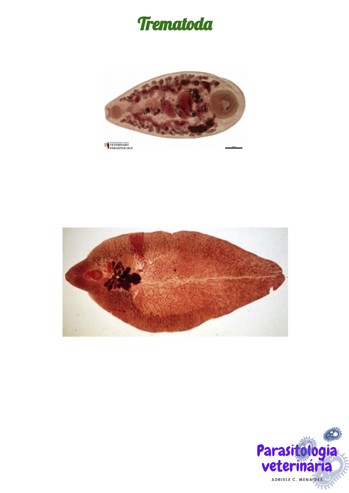Trematod� Prancha 1 - Paramphistomum spp. - adulto Fonte: Veterinary parasitology ● Adulto: 5-13 mm de comprimento por 2-5 mm de largura; ● Corpo piriforme (folha) de coloração avermelhada; ● Hospedeiros: bovinos, ovinos e caprinos. Prancha 2 - Fasciola hepatica - adulto Fonte: Merck veterinary manual. ● Verme chato em formato de folha; ● Dimensões: 3x1,5 cm ● Hermafrodita; ● Simetria bilateral; ● Hospedeiros: ovinos e bovinos. Prancha 3 - Fasciola hepatica - hospedeiro intermediário (H.I) Há uma classificação para Caramujos, pois irá depender do formato da concha, família Lymnacidae. Fonte: Research Gate. Ovos: grande e pesado, obtido pela técnica de sedimentação, pois não flutua. Prancha 4 - Eurytrema - adulto Fonte: Ym.edu.tw ● Verme chato em formato de folha; ● Dimensões: 8 a 16 x 5 a 8,5 mm; ● Hermafrodita; ● Simetria bilateral; ● Hospedeiros: ruminantes. Ovos: São menores que de fascíolas, tem opérculo e a casca é mais rugosa e maior. Fonte: Universidade estadual de Londrina. Prancha 5 - Schistosoma mansoni - Hospedeiro intermediário Biomphalaria glabrata Fonte: Estude parasitologia. Prancha 6 - Schistosoma mansoni - ovo Fonte: Estude parasitologia. ● Ovo mede em media 150 µm x 65 µm; ● Apresenta um espinho lateral saliente agudo; ● Dentro do ovo desenvolve-se o miracídio. Prancha 7 - Schistosoma mansoni - miracídio Fonte: Fundação Oswaldo Cruz. Todo ciliado, pois precisa nadar até encontrar o caramujo. Prancha 8 - Schistosoma mansoni - cercária Fonte: Estude parasitologia. ● Aspecto piriforme; ● Apresenta microespinhos, na extremidade anterior; ● Órgão de fixação cefálico; ● Cauda bifurcada; ● Mede cerca de 500 µm de comprimento; ● Apresenta duas ventosas, uma oral e outra ventral; ● Hospedeiro: molusco do gênero Biomphalaria. Prancha 9 - Schistosoma mansoni - adultos macho e fêmea Fonte: USP. ● Apresentam dimorfismo sexual; ● Macho apresenta duas ventosas e abaixo há o canal ginecóforo onde a fêmea se aloja. Medem 6,4 a 9,9 mm; ● Fêmea: corpo cilíndrico, mais longo e fino, com ventosas muito pequenas e próximas umas das outras. Medem 7,2 a 14 mm; ● Hospedeiros: humanos, bovinos e ovinos.