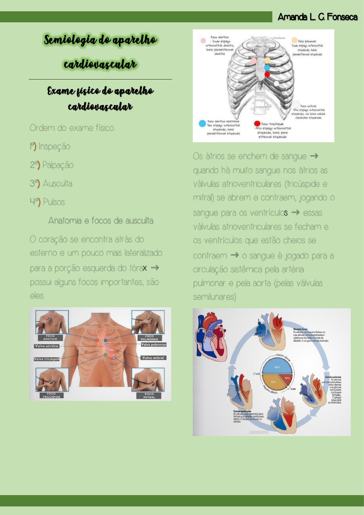 Ordem do exame físico: 1º) Inspeção 2º) Palpação 3º) Ausculta 4º) Pulsos Anatomia e focos de ausculta O coração se encontra atrás do esterno e um pouco mais lateralizado para a porção esquerda do tórax ➜ possui alguns focos importantes, são eles: Os átrios se enchem de sangue ➜ quando há muito sangue nos átrios as válvulas atrioventriculares (tricúspide e mitral) se abrem e contraem, jogando o sangue para os ventrículos ➜ essas válvulas atrioventriculares se fecham e os ventrículos que estão cheios se contraem ➜ o sangue é jogado para a circulação sistêmica pela artéria pulmonar e pela aorta (pelas válvulas semilunares) Inspeção OBS: O examinador deve SEMPRE estar à direita do paciente. 1º etapa ➜ o paciente deve estar em decúbito dorsal (preferencialmente entre 10 a 30º) ➜ o paciente não pode estar em pé ou sentado 2º etapa ➜ é observado se há: • Varizes ou circulação colateral ➜ indicam problemas quanto a circulação normal • Cicatrizes, máculas (“manchas”), abaulamentos (convexidade para dentro) ou retrações (encurtamento) • Ingurgitamento/estase jugular ➜ é o acúmulo de sangue venoso nas veias jugulares ➜ é analisado em uma relação da permanência da estase de acordo com a angulação ➜ paciente em decúbito dorsal completo pode não necessariamente indicar patologia ➜ deve-se atentar, principalmente, para a presença de estase em 30, 45 e 90º • Refluxo hepatojugular ➜ é uma distensão na veia jugular quando uma compressão é aplicada no abdome • Ictus cordis ➜ é o ápice do coração (“ponta”) ➜ geralmente se localiza na linha hemiclavicular à esquerda no 5º espaço intercostal (abaixo do mamilo) ➜ no ictus avalia-se se ele é visível ou não. OBS: O ictus, apesar de geralmente se localizar no foco mitral, é diferente do foco ➜ o ictus ser visível é uma condição normal. Palpação 1º etapa ➜ é realizada a palpação superficial daquela região, procurando: • Sopro cardíaco (frêmito) ➜ pode ser palpável a partir de 4 cruzes em 6 (de sopro) ➜ a palpação dos sopros se caracteriza pela palpação de todos os 4 focos cardíacos ➜ é realizada com a palma dos dedos da mão. 2º etapa ➜ palpa-se o ictus cordis, busca-se identificar: • Se o ictus é palpável ou não • A localização do ictus ➜ se não estiver sendo possível palpar o ictus pedir o paciente para deitar mais lateralmente para a esquerda ➜ facilita a palpação pela aproximação do coração em relação a caixa torácica • Amplitude ➜ se o ictus está batendo forte (hipercinético) ou não (normal). • Duração ➜ se ocorre uma duração normal ou persistente (na sístole). • Extensão ➜ se é 1 ou 2 polpas digitais ➜ se a extensão for muito grande pode-se pensar em patologias Ausculta OBS: Sons mais graves devem ser auscultados pela campânula do estetoscópio ➜ a campânula deve ser posicionada de forma leve, sem pressionar contra a caixa torácica. - Na ausculta é utilizado o diafragma para ouvir B1 e B2 (são os batimentos normais do coração) ➜ fechamento das válvulas atrioventriculares e semilunares ➜ e para ouvir regurgitações. - Utiliza-se a campânula para auscultar B3 e B4 (possuem complacência reduzida) ➜ usado também para auscultar ruídos de estenose (diminuição do espaço para a passagem de sangue) OBS: Pedir o paciente para lateralizar seu corpo pode ajudar também na ausculta cardíaca do foco mitral, de B3 e de B4 OBS: O paciente inclinado e expirando são momentos que auxiliam na ausculta de sopros aórticos Ausculta normal do coração É auscultado nitidamente o B1 (“TUM”) e o B2 (“TA”) ➜ o B1 é o fechamento de válvulas atrioventriculares ➜ o B2 é o fechamento das válvulas semilunares A sístole é entre B1 e B2 e a diástole é depois de B2 ➜ após a diástole o ciclo recomeça. Desdobramentos B2 - No desdobramento de B2 a válvula aórtica geralmente fecha um pouco antes da pulmonar (ausculta-se normalmente só a aórtica) ➜ mas devido a alguns fatores, como na inspiração profunda, pode haver um retardo do fechamento da pulmonar, ou até mesmo se o foco de ausculta for o pulmonar consegue-se ouvir a pulmonar melhor do que a aórtica ➜ nesses casos é possível perceber o desdobramento ➜ ao invés de ser “TUM” e “TA” vira “TUM” e “TRA” ➜ no “TRA” é como se tivesse 2 componentes sendo auscultados ➜ esse desdobramento pode ser fisiológico ou possuir alguns achados patológicos OBS: Esse desdobramento na inspiração é fisiológico, mas é patológico se for muito amplo (se a válvula pulmonar fechar muito depois da aórtica), se for fixo (se a todo momento há esse desdobramento e não só com a inspiração) e se for paradoxal (quando acontece na expiração). B1 - No desdobramento de B1 o fechamento da tricúspide não ocorre ao mesmo tempo do fechamento da válvula mitral (a mitral se sobressai a tricúspide) ➜ ausculta-se primeiro uma válvula atrioventricular e depois a outra (não significa que está associado a patologias mas pode também ser patológico) ➜ o melhor local para auscultar o desdobramento de B1 é no foco tricúspide ➜ o som será “TRUM” OBS: Esse desdobramento é patológico quando há um bloqueio de ramo direito ou com extrassístoles ventriculares B3 É o enchimento do ventrículo ➜ acontece depois de B2 ➜ ocorre quando o ventrículo está com pouca complacência (+ duro) e o sangue na hora da passagem pelas atrioventriculares em direção ao ventrículo bate em sua parede, emitindo um barulho (B3) ➜ barulho sonoro: “TUM” e “TA” “TA” B4 O sangue ejetado do átrio para o ventrículo na sístole em um coração com baixa complacência (+ duro) pode resultar em um barulho (B4) ➜ então pode ser auscultado B3 quando o sangue cai no ventrículo com baixa complacência e faz o ruído e B4 logo em seguida quando o átrio de baixa comp