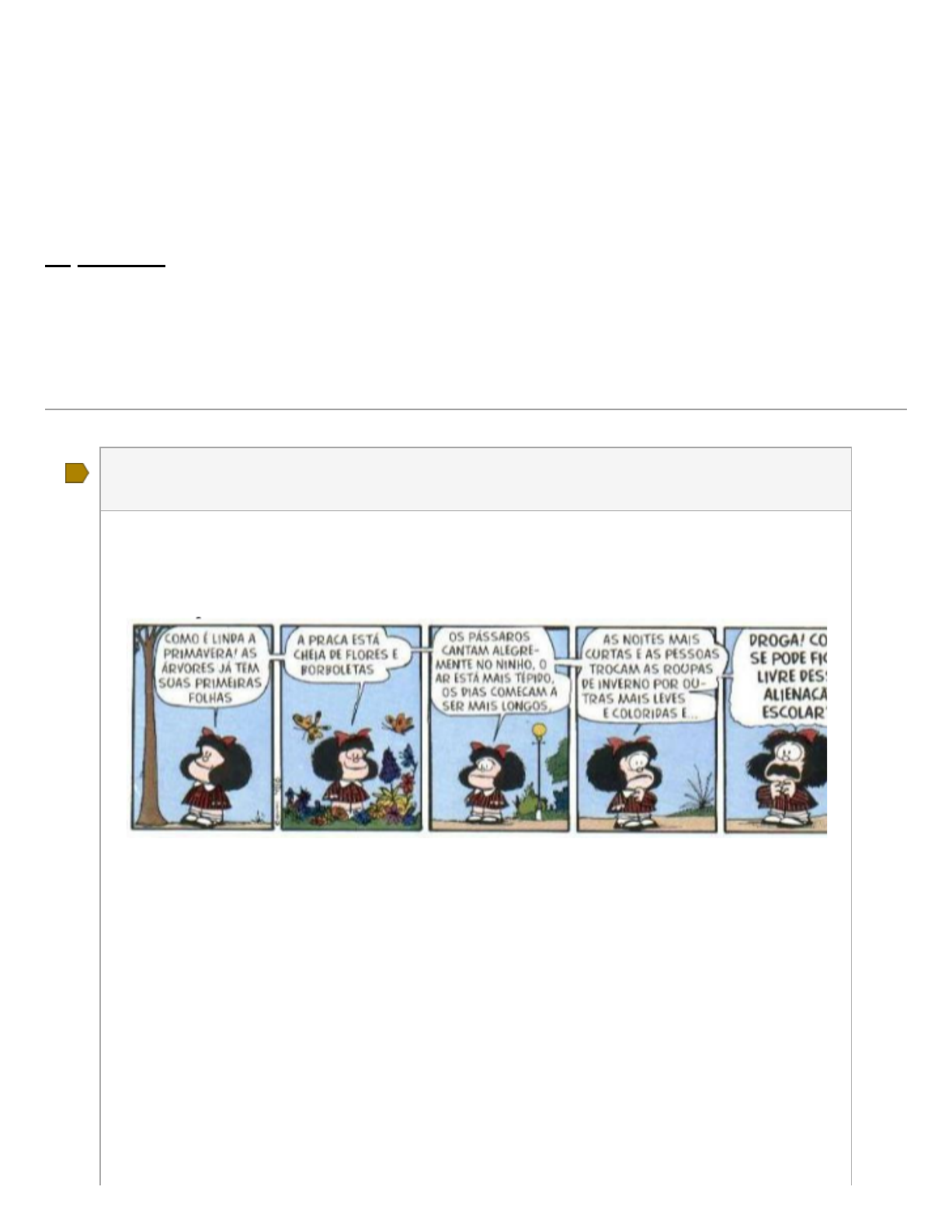 07/12/2020 Teste: AO2 Prova https://famonline.instructure.com/courses/12497/quizzes/40987/take 1/18 AO2 Prova Iniciado: 7 dez em 13:58 Instruções do teste Importante: Caso você esteja realizando a atividade através do aplicativo "Canvas Student", é necessário que você clique em "FAZER O QUESTIONÁRIO", no final da página. 0,6 ptsPergunta 1 Leia o texto a seguir: (Fonte: QUINO, J.L. Toda Mafalda. São Paulo: Martins Fontes, 2003. Pag.212, tira 5) Considerando esse contexto, avalie as seguintes asserções e a relação proposta entre elas. 07/12/2020 Teste: AO2 Prova https://famonline.instructure.com/courses/12497/quizzes/40987/take 2/18 A asserção I é uma proposição falsa, e a II é uma proposição verdadeira. A asserção I é uma proposição verdadeira, e a II é uma proposição falsa. As asserções I e II são proposições falsas. As asserções I e II são proposições verdadeiras, mas a II não é uma justificativa da I. As asserções I e II são proposições verdadeiras, e a II é uma justificativa da I. I. O conceito de competência, definido na BNCC está intrinsecamente ligado ao saber fazer. PORQUE II. Saber fazer, segundo a BNCC implica em mobilizar conhecimentos para intervir em diferentes situações cotidianas. A respeito dessas asserções, assinale a opção correta: 0,6 ptsPergunta 2 Leia o texto a seguir: 07/12/2020 Teste: AO2 Prova https://famonline.instructure.com/courses/12497/quizzes/40987/take 3/18 Como você explicaria que pneus carecas são perigosos na chuva? Ou que o beijo pode transmitir gripe, mas não o HIV? Pesquisa do Instituto Paulo Montenegro e da Abramundo revelou que a maioria dos brasileiros, inclusive aqueles que concluíram o Ensino Médio, não usa conhecimentos científicos para explicar o que observa em seu dia a dia. Em outras palavras, a maior parte não possui letramento científico satisfatório, que é a capacidade de compreender, interpretar e formular ideias científicas em uma variedade de contextos, inclusive os cotidianos. (Fonte: Disponível em: https://novaescola.org.br/conteudo/10064/o-que-e-letramento- cientifico (https://novaescola.org.br/conteudo/10064/o-que-e- letramento-cientifico) . Acesso em: 07 abr. 2020) Considerando esse contexto, avalie as seguintes asserções e a relação proposta entre elas. I. A construção da aprendizagem em ciências tem sua base, sua fundamentação no letramento científico. PORQUE II. A construção do conhecimento científico é escolar, mas sua efetivação acontece na utilização desse conhecimento na prática social. A respeito das asserções, assinale a opção correta. https://novaescola.org.br/conteudo/10064/o-que-e-letramento-cientifico 07/12/2020 Teste: AO2 Prova https://famonline.instructure.com/courses/12497/quizzes/40987/take 4/18 As asserções I e II são proposições verdadeiras, mas a II não é uma justificativa da I. A asserção I é uma proposição verdadeira, e a II é uma proposição falsa. As asserções I e II são proposições verdadeiras, e a II é uma justificativa da I. As asserções I e II são proposições falsas. A asserção I é uma proposição falsa, e a II é uma proposição verdadeira. 0,6 ptsPergunta 3 Leia o texto a seguir: PRÁTICA AVALIATIVA Considerando esse contexto, avalie as seguintes asserções e a relação proposta entre elas. 07/12/2020 Teste: AO2 Prova https://famonline.instructure.com/courses/12497/quizzes/40987/take 5/18 As asserções I e II são proposições falsas. As asserções I e II são proposições verdadeiras, e a II é uma justificativa da I. As asserções I e II são proposições verdadeiras, mas a II não é uma justificativa da I. A asserção I é uma proposição verdadeira, e a II é uma proposição falsa. A asserção I é uma proposição falsa, e a II é uma proposição verdadeira. I. A prática avaliativa deve compreender a construção de significado do processo ensino aprendizagem para o aluno e para o professor. PORQUE II. A prática avaliativa resulta em reflexões, questionamentos e tomadas de decisões que impactam a reorganização da aprendizagem em todos os sentidos. A respeito dessas asserções, assinale a opção correta: 0,6 ptsPergunta 4 Leia o texto a seguir: 07/12/2020 Teste: AO2 Prova https://famonline.instructure.com/courses/12497/quizzes/40987/take 6/18 No Brasil, um país caracterizado pela autonomia dos entes federados, acentuada diversidade cultural e profundas desigualdades sociais, os sistemas e redes de ensino devem construir currículos, e as escolas precisam elaborar propostas pedagógicas que considerem as necessidades, as possibilidades e os interesses dos estudantes, assim como suas identidades linguísticas, étnicas e culturais. Nesse processo, a BNCC desempenha papel fundamental, pois explicita as aprendizagens essenciais que todos os estudantes devem desenvolver e expressa, portanto, a igualdade educacional sobre a qual as singularidades devem ser consideradas e atendidas. Essa igualdade deve valer também para as oportunidades de ingresso e permanência em uma escola de Educação Básica, sem o que o direito de aprender não se concretiza. (Fonte: BRASIL, MEC. Base Nacional Comum Curricular. Disponível em: http://basenacionalcomum.mec.gov.br/abase/#introducao (http://basenacionalcomum.mec.gov.br/abase/#introducao) . Acesso em: 05 abr. 2020) Considerando o texto apresentado, avalie as afirmações a seguir: I. O conceito de direitos de aprendizagem, apresentado na BNCC, advém de conceitos já organizados nos PCNs e na LDBEN. II. A BNCC apresentou o conceito de direitos de aprendizagem de maneira mais clara e objetiva a fim de assegurar a equidade. http://basenacionalcomum.mec.gov.br/abase/#introducao 07/12/2020 Teste: AO2 Prova https://famonline.instructure.com/courses/12497/quizzes/40987/take 7/18 II e III. I e III. I e IV. III e IV. I e II. III. Os direitos de aprendizagem se referem aos conteúdos específicos de cada região que devem ser valoriza