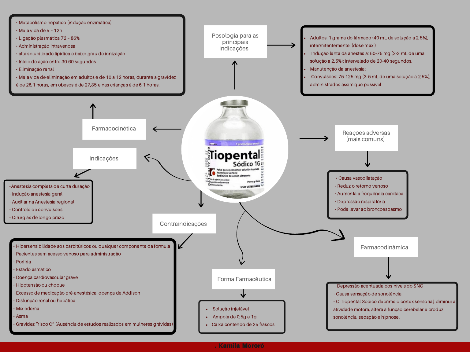 Posologia para as principais indicações • Causa vasodilatação • Reduz o retorno venoso • Aumenta a frequência cardíaca • Depressão respiratória • Pode levar ao broncoespasmo Contraindicações • Hipersensibilidade aos barbitúricos ou qualquer componente da fórmula • Pacientes sem acesso venoso para administração • Porfiria • Estado asmático • Doença cardiovascular grave • Hipotensão ou choque • Excesso de medicação pré-anestésica, doença de Addison • Disfunção renal ou hepática • Mix edema • Asma • Gravidez “risco C” (Ausência de estudos realizados em mulheres grávidas) • Metabolismo hepático (indução enzimática) • Meia vida de 5 – 12h • Ligação plasmática 72 – 86% • Administração intravenosa • alta solubilidade lipídica e baixo grau de ionização • Início de ação entre 30-60 segundos • Eliminação renal • Meia vida de eliminação em adultos é de 10 a 12 horas, durante a gravidez é de 26,1 horas, em obesos é de 27,85 e nas crianças é de 6,1 horas. Reações adversas (mais comuns) Adultos: 1 grama do fármaco (40 mL de solução a 2,5%); intermitentemente. (dose máx.) Indução lenta da anestesia: 50-75 mg (2-3 mL de uma solução a 2,5%); intervalado de 20-40 segundos. Manutenção da anestesia: Convulsões: 75-125 mg (3-5 mL de uma solução a 2,5%); administrados assim que possível . Kamila Mororó Farmacocinética Indicações •Anestesia completa de curta duração • Indução anestesia geral • Auxiliar na Anestesia regional • Controle de convulsões • Cirurgias de longo prazo Forma Farmacêutica • Depressão acentuada dos níveis do SNC • Causa sensação de sonolência • O Tiopental Sódico deprime o córtex sensorial, diminui a atividade motora, altera a função cerebelar e produz sonolência, sedação e hipnose. Solução injetável Ampola de 0,5g e 1g Caixa contendo de 25 frascos Farmacodinâmica