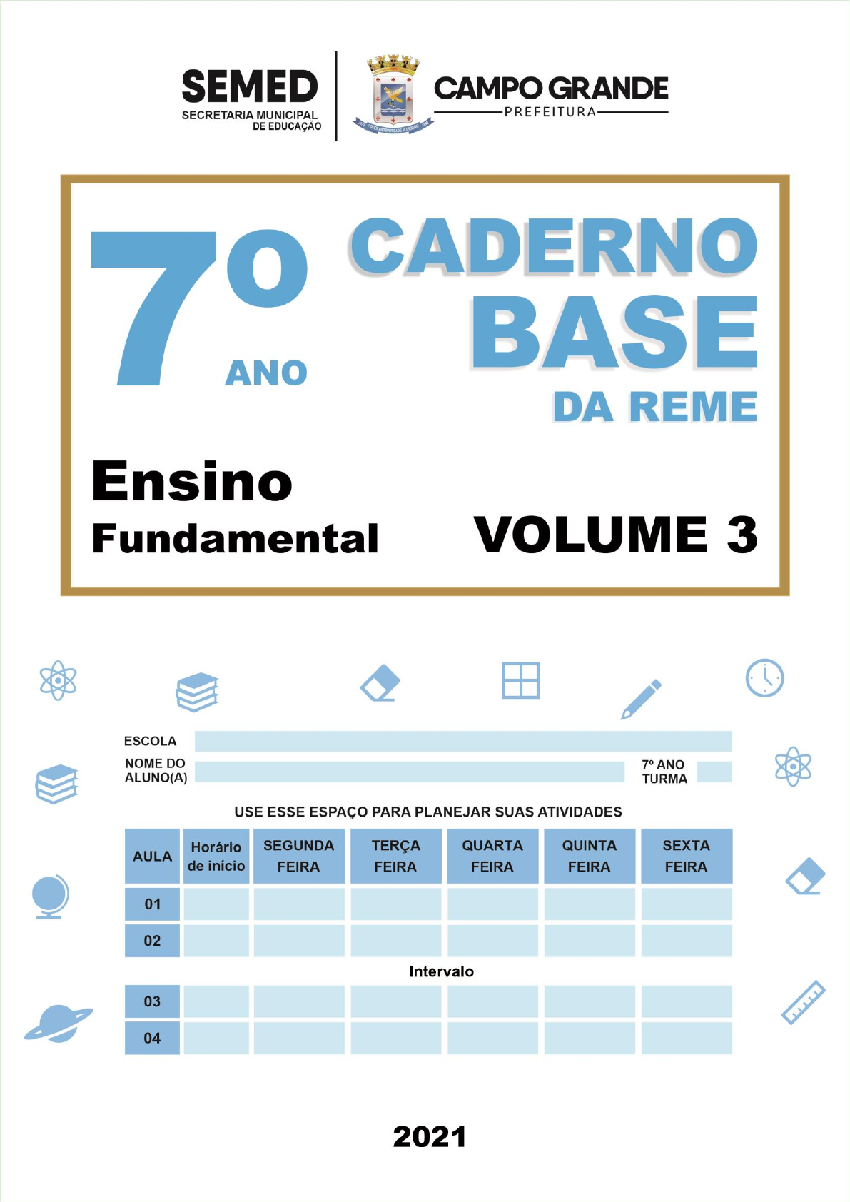 MARCOS MARCELO TRAD Prefeito Municipal ELZA FERNANDES Secretária de Educação SORAIA INÁCIO CAMPOS Secretária adjunta de Educação WALDIR LEONEL Superintendente de Gestão das Políticas Educacionais MÔNICA OLIVEIRA INÁCIO PRESTES Gerente do Ensino Fundamental e Médio FICHA TÉCNICA ELABORAÇÃO ARTE – ARTES VISUAIS Ana Lucia Serrou ARTE - DANÇA Douglas de Oliveira Caetano ARTE – MÚSICA Marcos Silva de Araújo ARTE – TEATRO Matheus Vinicius de Sousa Fernandes CIÊNCIAS Cristiane Miranda Magalhães Gondin Gilson da Rocha Santos Leila Tatiana Garcia Nathalie Rossini EDUCAÇÃO FÍSICA Eliana de Mattos Carvalho GEOGRAFIA GERAL Rafael Bartimann de Almeida GEOGRAFIA REGIONAL Rafael Bartimann de Almeida HISTÓRIA Fernando Vendrame Menezes LÍNGUA INGLESA Adriana Assis Silva Nery Lislyê Milanez de Freitas LÍNGUA PORTUGUESA Francisco Leandro Oliveira Queiroz Gustavo Aurélio Tomé Azuaga MATEMÁTICA Páblo Carcheski de Queiroz REVISÃO GRAMATICAL Francisco Leandro Oliveira Queiroz João Batista Cunha Silveira DIAGRAMAÇÃO Agnaldo de Oliveira SUMÁRIO APRESENTAÇÃO ........................................................................................................................................ 4 ORIENTAÇÕES GERAIS ............................................................................................................................. 6 ARTE – ARTES VISUAIS ............................................................................................................................. 7 ARTE – DANÇA ......................................................................................................................................... 23 ARTE – MÚSICA ........................................................................................................................................ 32 ARTE – TEATRO ....................................................................................................................................... 39 CIÊNCIAS .................................................................................................................................................. 45 EDUCAÇÃO FÍSICA ................................................................................................................................... 65 GEOGRAFIA GERAL ................................................................................................................................. 77 GEOGRAFIA REGIONAL ........................................................................................................................... 87 HISTÓRIA .................................................................................................................................................. 99 LÍNGUA PORTUGUESA .......................................................................................................................... 121 LÍNGUA INGLESA .................................................................................................................................... 143 MATEMÁTICA .......................................................................................................................................... 161 4 APRESENTAÇÃO Diante da pandemia de COVID-19 e da necessidade de se manter as medidas sanitárias para mitigar seus efeitos e consequências para a população, a Prefeitura Municipal de Campo Grande, por meio do Decreto nº 14.613, de 3 de fevereiro de 2021, manteve a adoção de aulas remotas como uma das formas de distanciamento social. Assim, faz-se premente a busca pela diversidade de estratégias e recursos que possam diminuir o impacto na aprendizagem, decorrente da suspensão das aulas presenciais e, ao mesmo tempo, garantir aos alunos da Rede Municipal de Ensino de Campo Grande (Reme) uma educação de qualidade. Nessa direção, a Secretaria Municipal de Educação de Campo Grande, por meio da Superintendência de Gestão das Políticas Educacionais, tem disponibilizado os Cadernos-Base como um recurso educativo voltado às necessidades essenciais de aprendizagem dos alunos da Reme. Organizado pela Gerência do Ensino Fundamental e Médio, os Cadernos-Base estão estruturados com atividades que abordam as habilidades que compõem o Referencial Curricular Circunstancial/2021. No que tange à distribuição do quantitativo de atividades, por componente curricular, considerou-se a carga horária correspondente a cada um deles, de forma que, para cada hora-aula, tem-se, no mínimo, uma atividade. O terceiro, que ora apresentamos, constitui-se como uma continuidade dos anteriores, tanto no que se refere às habilidades e conteúdos trabalhados, por meio das atividades propostas, quanto na ordenação lógica dos conhecimentos necessários para a progressão da aprendizagem dos alunos. Cada unidade escolar poderá definir se procederá ao trabalho pedagógico deste caderno, junto aos alunos, em volume único ou segmentado em duas partes, conforme disponibilizado no ambiente Moodle, desta Secretaria. Também caberá à escola definir o período de aplicação do caderno. Contudo, orientamos que este terceiro volume seja desenvolvido na sua integralidade, como os anteriores, considerando que o conteúdo aborda conhecimentos essenciais à aprendizagem dos alunos. Ressaltamos que este Caderno-Base constitui um recurso inicial voltado à ação docente e deve ser complementado com outros recursos e estratégias, de acordo com as necessidades de cada professor, de suas turmas e do contexto socioeconômico da sua escola. Assim, reforçamos que as atividades presentes neste material e as habilidades a elas correspondentes não representam a totalidade de conhecimentos necessários para se desenvolver a aprendizagem dos alunos, dentro do seu período de aplicação, o que delega ao professor a responsabilidade quanto à sua complementação com explicações, explanações e outras atividades que aprofundem as questões presente