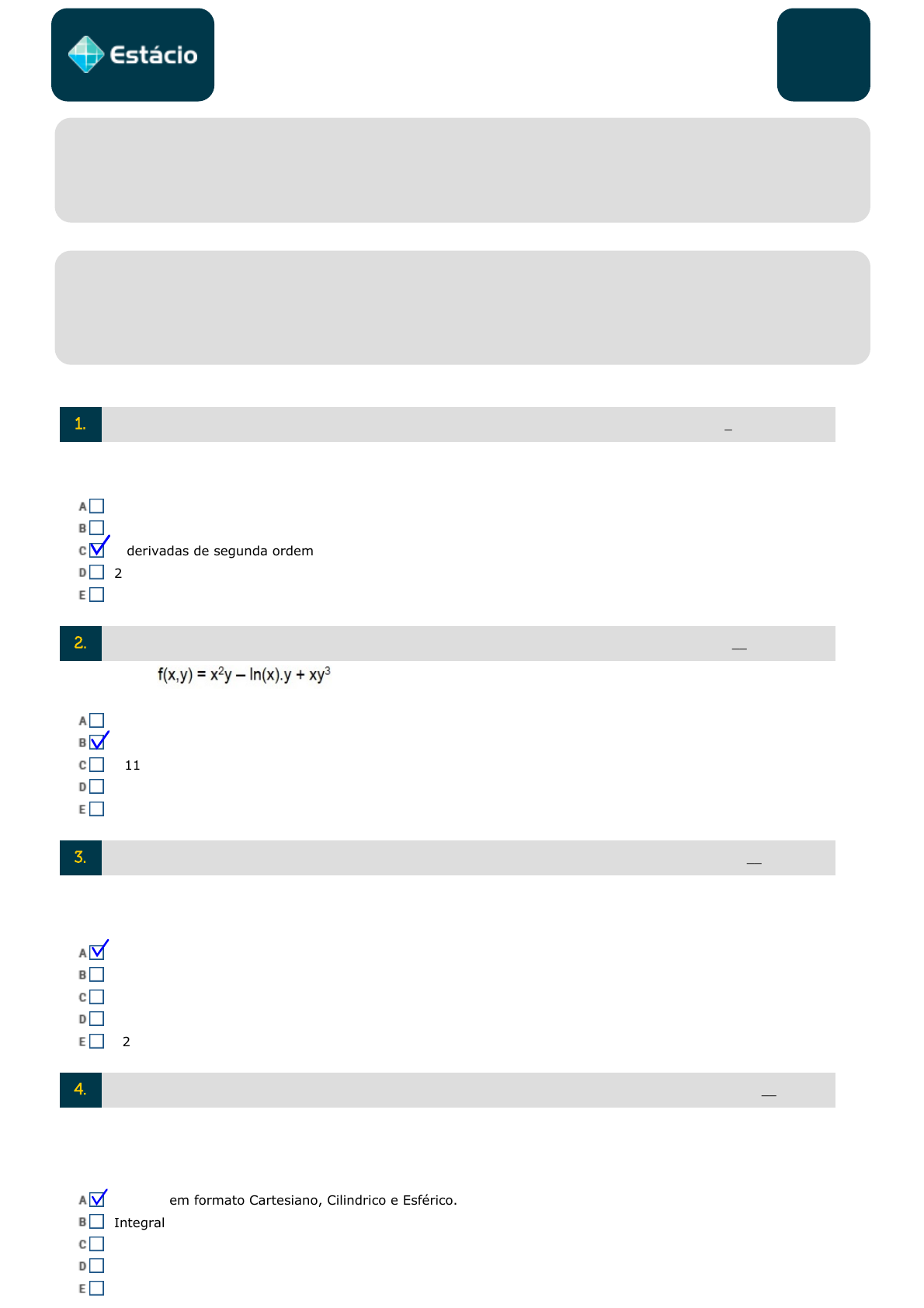 4707168409 A 13/06/2021 12:18 Nome: __________________________________________________________ Matrícula: ________________ Disciplina: ARA0018 / CÁLCULO DE MÚLTIPLAS VARIÁVEIS Data: ___ /___ /______ Período: 2021.1 / AV2 Turma: 3001 Leia com atenção as questões antes de responder. É proibido o uso de equipamentos eletrônicos portáteis e consulta a materiais de qualquer natureza durante a realização da prova. Questões objetivas e discursivas que envolvam operações algébricas devem possuir a memória de cálculo. Boa prova. 1. _______ de 1,00 Considere uma função de várias variáveis F(x,y). Ao estudar seu comportamento por meio de derivadas parciais, quantas derivadas de segunda ordem podem ser calculadas? 6 derivadas de segunda ordem 4 derivadas de segunda ordem 3 derivadas de segunda ordem 2 derivadas de segunda ordem 1 derivada de segunda ordem 2. _______ de 1,00 Dada a função , determine f(1,2): 9 10 - 11 11 12 3. _______ de 1,00 Calcule a integral tripla da função f(x,y,z)=z limitada por 0≤x≤1 ,0≤y≤2 e 0≤z≤3. 9 6 15 3 12 4. _______ de 1,00 "Fazemos uso da utilização da integral tripla para calcularmos volumes, estes podem se apresentados em diferentes formas": Quais são as diferentes formas que podemos utilizar o calculo da integral tripla? Integral em formato Cartesiano, Cilindrico e Esférico. Integral em formato Cartesiano, Cilindrico e Linha. Integral em formato Cartesiano, Cilindrico e Polar. Integral em formato cartesiado e integral de Linha. Integral de Linha em Campo Vetorial e Integral em formato polar. VICTOR HUGO MOREIRA SASSE 202002096365 17 06 2021 ABLSM Realce ABLSM Realce ABLSM Realce ABLSM Realce 5. _______ de 1,00 Use a integral dupla para calcular a área da região limitada pelas curvas abaixo: 177/5 123/5 101/7 343/12 121/13 6. _______ de 1,00 As derivadas parciais são derivadas que são calculadas levando em consideração uma determinada variável, podendo ser feita em relação a x, y ou até mesmo z, caso seja uma função de três variáveis. Uma função de múltiplas variáveis, como por exemplo: f(x,y)= 3x2y + 2y3 x+ y, ao ser derivada em relação a x tem como resposta: 6xy + 2y3 +1 6x + 2 0 6xy + 6y2 6xy + 2y3 7. _______ de 1,00 Selecione a alternativa que apresenta o resultado da integral tripla mostrada abaixo. 15 8 15 4 5 24 5 8 8 5 8. _______ de 1,00 Em relação a integral dupla da função f(x,y)=2x2+3y em -1≤x≤2 e 1≤y4, selecione a alternativa que apresenta o valor do cálculo da integral dupla apresentada. 85/2 85 171/2 130/2 171 _______ de 1,00 ABLSM Realce ABLSM Realce ABLSM Realce ABLSM Realce Campus: TAGUATINGA Prova Impressa em 13/06/2021 por RENATA CRISTINA TEIXEIRA DA SILVA Ref.: 4707168409 Prova Montada em 13/06/2021 9. Uma função de várias variáveis é aquela que necessidade de mais de uma informação para poder ser calculada. Esses tipos de funções são muito utilizadas para análise do comportamento de superfícies tridimensionais, sobretudo na área de planaltimetria. O estudo das variações da função é feito por meio de derivadas parciais. Dada a função de várias variáveis mostrada abaixo, apresente os cálculos de derivadas parciais indicados. a) fXY b) fYXY 10. _______ de 1,00 No cálculo de integrais de funções a duas ou mais variáveis, procederemos de forma análoga: integramos uma função em relação a determinada variável, fixando as demais. Com base nesse conhecimento calcule a integral abaixo em relação a variável "x". f(x) = 2x²y4