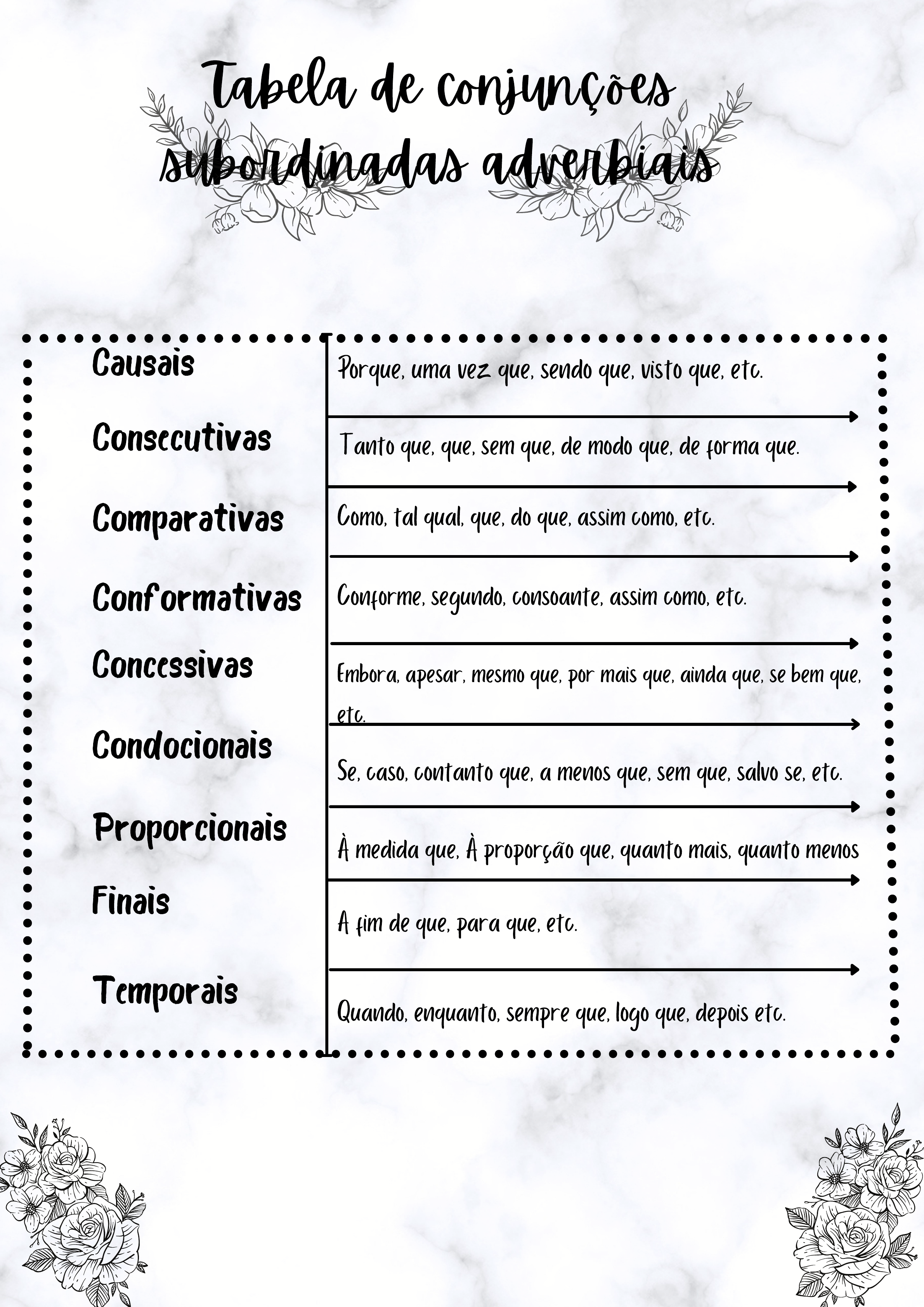 Tabela de conjunções subordinadas adverbiais Concessivas Condocionais Embora, apesar, mesmo que, por mais que, ainda que, se bem que, etc. Causais Consecutivas Comparativas Conformativas Proporcionais Finais Temporais Porque, uma vez que, sendo que, visto que, etc. Tanto que, que, sem que, de modo que, de forma que. Como, tal qual, que, do que, assim como, etc. Conforme, segundo, consoante, assim como, etc. Se, caso, contanto que, a menos que, sem que, salvo se, etc. À medida que, À proporção que, quanto mais, quanto menos A fim de que, para que, etc. Quando, enquanto, sempre que, logo que, depois etc.