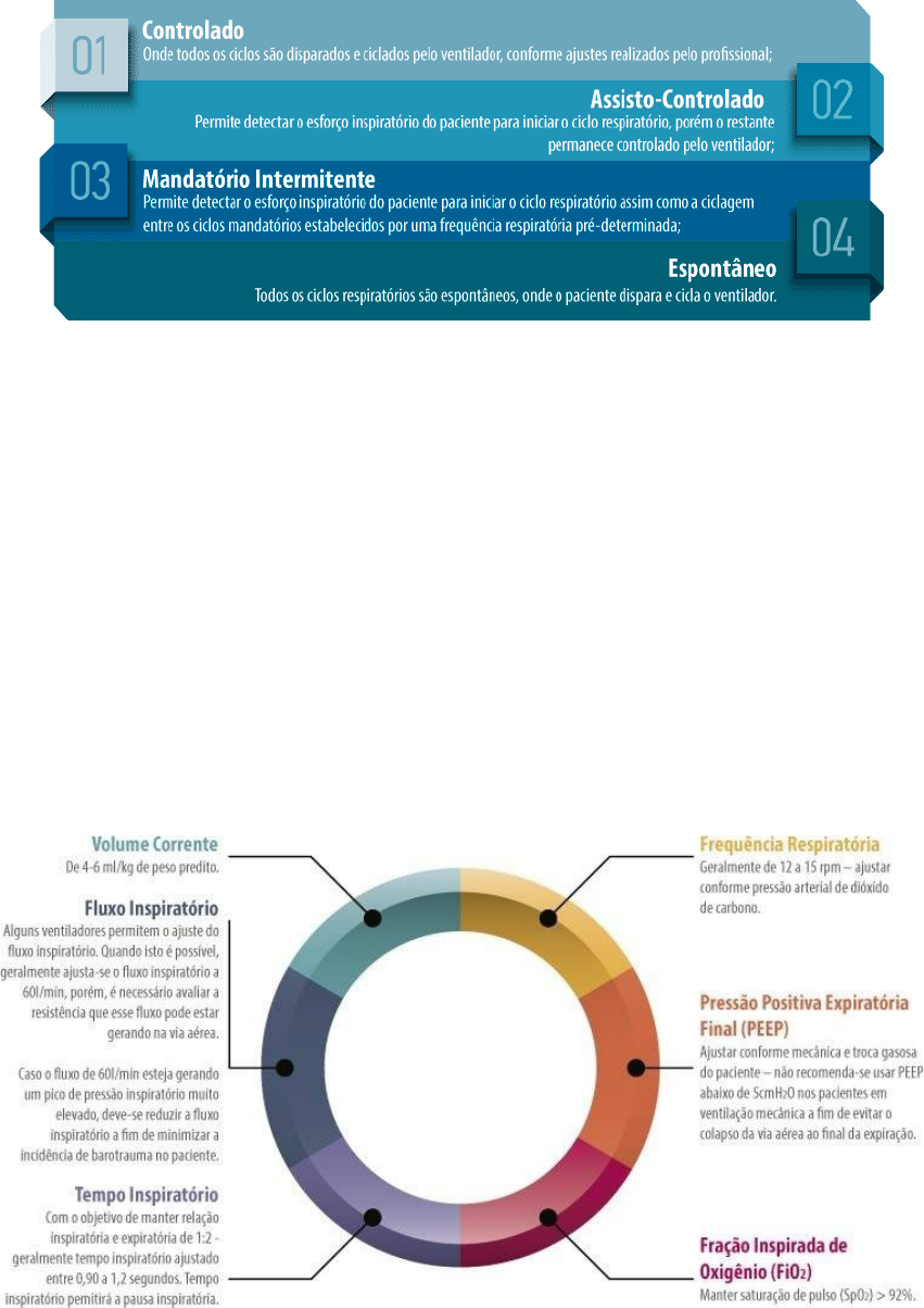 MODO À VOLUME Nesta Seção será abordado os modos convencionais da Ventilação Mecânica, a seguir os descreveremos detalhadamente. O modo a volume consiste num modo ventilatório cujo objetivo é garantir o volume corrente fornecido ao paciente a cada ciclo respiratório. Pode ser utilizado como: controlado, assisto-controlado, mandatório intermitente e mandatório intermitente sincronizado. · Na ventilação controlada a volume, o início do ciclo respiratório (disparo) ocorre devido uma frequência respiratória pré-estabelecida (por tempo); · A ciclagem (mudança da fase inspiratória para expiratória) pode ocorrer após atingir o volume pré-estabelecido ou por tempo (quando utilizado pausa inspiratória); · Nesse modo ventilatório, o ciclo ventilatório é totalmente controlado pelo ventilador conforme os ajustes do profissional; · A pressão de via aérea nesse modo será uma consequência da mecânica respiratória do paciente. Caso o paciente apresente piora da mecânica pulmonar, para o mesmo volume corrente ajustado, a pressão de via aérea será maior e vice-versa. Os parâmetros ventilatórios a serem ajustados no modo ventilatório diante de um pulmão normal, são: Nos ventiladores onde não há ajuste direto do tempo inspiratório, este será uma resultante do ajuste de fluxo e volume corrente: · Quanto maior o valor do fluxo, menor o tempo inspiratório. · Quanto maior o volume corrente, maior o tempo inspiratório. Alarmes É extremamente importante que estes alarmes sejam realmente acertados, com o objetivo de minimizar as complicações associadas. Os possíveis alarmes que podem ser ajustados dependendo do ventilador em questão são: · Alarme de Pico de Pressão (para evitar barotrauma – o ideal é ajustar esse alarme em 40 cmH2O). · Alarme de Volume Minuto (ajustar volume minuto mínimo em torno de 4 l/min e máximo em torno de 15 l/min). Volume minuto abaixo de 4 l/min gera hipoventilação podendo levar a presença de atelectasia e retenção de secreção pulmonar, consequentemente levando a retenção de CO2 e hipoxemia se não revertido rapidamente. Volume minuto acima de 15 l/min pode gerar aprisionamento aéreo (auto-PEEP), além de ser um sinal de alta demanda ventilatória do paciente. · Alarme de PEEP alguns ventiladores permitem esse ajuste, sinalizando caso a PEEP caia abaixo do valor estipulado podendo ser sinal de vazamento do circuito. Na ventilação assisto-controlada a volume, permite-se a detecção do esforço inspiratório do paciente para iniciar o ciclo respiratório. Note no esquema abaixo como este modo se desenvolve. Em relação aos ajustes dos parâmetros ventilatórios, deve-se ajustar os mesmos parâmetros do modo controlado a volume, porém deve-se ajustar também a sensibilidade do ventilador (ajuste da detecção do disparo). A sensibilidade do ventilador como mencionado, pode ser ajustado por variação de fluxo ou pressão. Sensibilidade a Fluxo Este critério tende a ser mais próximo do fisiológico e consequentemente tende a ser mais agradável para o paciente. MODO VENTILATÓRIO ASSISTO CONTROLADO A VOLUME COM SENSIBILIDADE A FLUXO AJUSTADA. MODO VOLUME ASSISTO CONTROLADO, COM CICLAGEM A VOLUME (AO ATINGIR O VOLUME PRÉ-DETERMINADO ABRE-SE A VÁLVULA EXPIRATÓRIA), DISPARO A FLUXO. Sensibilidade a pressão A sensibilidade ajustada à pressão é uma alternativa de ajuste que deve ser iniciada quando o ciclo respiratório detecta um diferencial de pressão, ou seja, redução da pressão ao final da expiração. Recomenda-se o ajuste da sensibilidade a pressão entre 2-4 cmH2O, valores menores que 2 resultam em auto-disparo do ventilador, e ajustes acima de 4 cmH2O resultam em maior esforço do paciente para iniciar o ciclo respiratório favorecendo a fadiga do paciente. O mesmo acontece com valores baixos e altos de sensibilidade a fluxo. - Em vista do conteúdo apresentado torna-se claro as diferenças entre os modos básicos da ventilação mecânica – controlado, assisto controlado, intermitente e espontâneo. Sendo possível compreender como cada um se inicia, se mantém e finaliza o ciclo respiratório. O modo à pressão pode ser utilizado nos modos ventilatórios controlado, assisto-controlado, mandatório intermitente, mandatório intermitente sincronizado, e espontâneo. No modo controlado à pressão, os seguintes parâmetros ventilatórios devem ser ajustados: • Pressão controlada – Valor de pressão que será transmitido ao paciente. Geralmente ajustado conforme o volume corrente que gostaríamos que o paciente realizasse. Recentemente alguns estudos vêm mencionando o cuidado em ajustar esse parâmetro ventilatório para minimizar a abertura e fechamento cíclico das unidades alveolares, frente a esse raciocínio os estudos vêm demonstrando valores seguros abaixo de 15 cmH2O de pressão controlada – pressão acima da PEEP. • PEEP – PEEP (ajustar conforme mecânica e troca gasosa do paciente – não se recomenda usar PEEP abaixo de 5 cmH2O nos pacientes em ventilação mecânica a fim de evitar o colapso da via aérea ao final da expiração). • Frequência Respiratória – Frequência Respiratória (geralmente de 12 a 15 rpm – ajustar conforme pressão arterial de dióxido de carbono). • Fração Inspirada de Oxigênio – Fração inspirada de oxigênio (FiO2) – manter saturação de pulso (SpO2) > 92%. • Tempo Inspiratóeio – Tempo inspiratório (com o objetivo de manter relação inspiratória e expiratória de 1:2; geralmente tempo inspiratório ajustado entre 0,90 a 1,2 segundos). Assim como no modo a volume, precisamos ajustar os alarmes no modo à pressão. Os seguintes alarmes devem ser ajustados quando o ventilador permitir: Como exemplo, de ventilação Modo Pressão Controlada, temos limitada à pressão, com disparo e ciclagem a tempo. MODO PRESSÃO CONTROLADA Na ventilação assisto-controlada, a pressão permite a detecção do esforço do paciente par