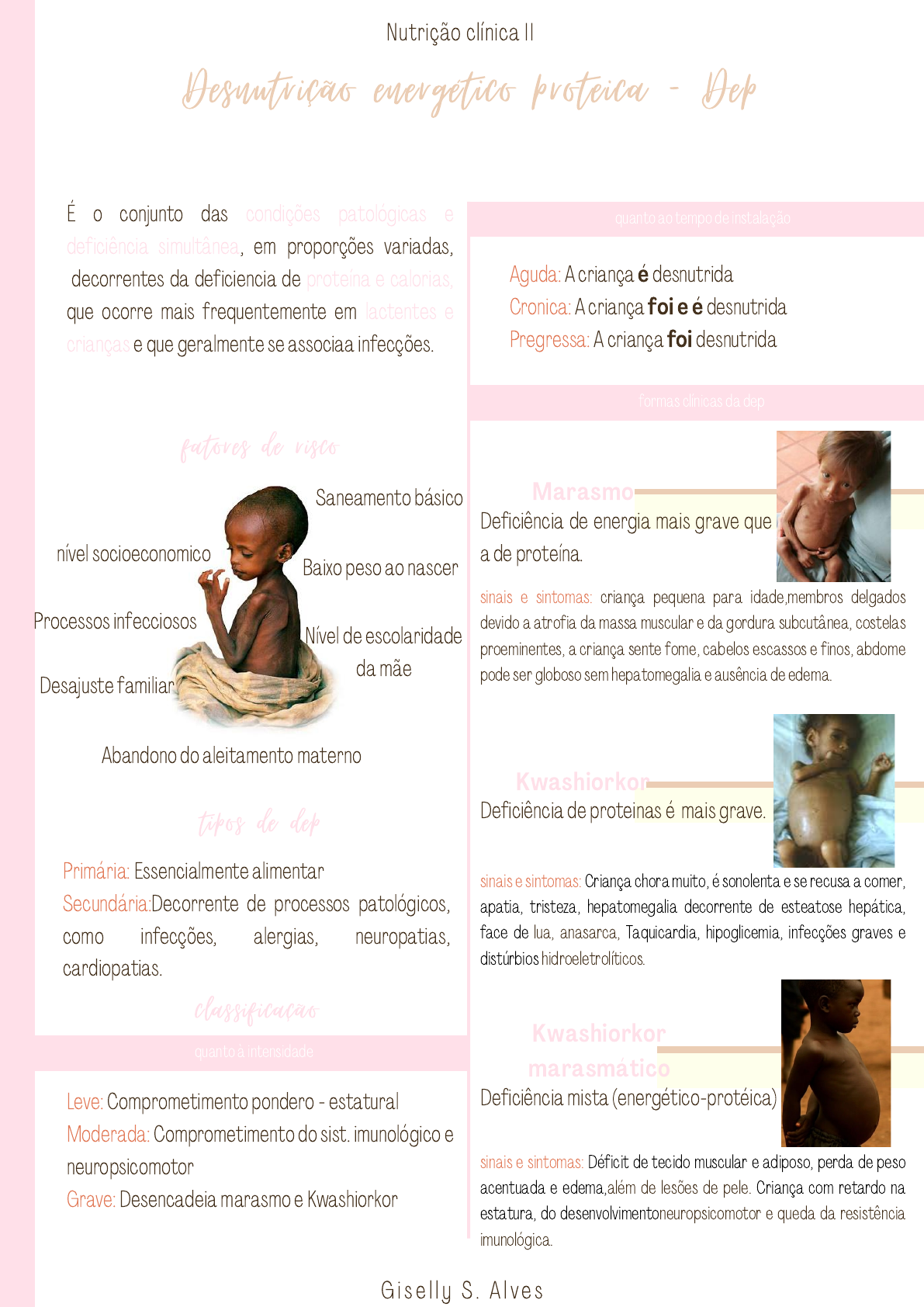 Desnutrição energético proteica - Dep G i s e l l y S . A l v e s Nutrição clínica II É o conjunto das condições patológicas e deficiência simultânea, em proporções variadas, decorrentes da deficiencia de proteína e calorias, que ocorre mais frequentemente em lactentes e crianças e que geralmente se associaa infecções. fatores de risco nível socioeconomico Saneamento básico Baixo peso ao nascer Processos infecciosos Desajuste familiar Abandono do aleitamento materno Nível de escolaridade da mãe tipos de dep Primária: Essencialmente alimentar Secundária:Decorrente de processos patológicos, como infecções, alergias, neuropatias, cardiopatias. classificação quanto à intensidade Leve: Comprometimento pondero - estatural Moderada: Comprometimento do sist. imunológico e neuropsicomotor Grave: Desencadeia marasmo e Kwashiorkor quanto ao tempo de instalação Aguda: A criança é desnutrida Cronica: A criança foi e é desnutrida Pregressa: A criança foi desnutrida formas clínicas da dep Deficiência de energia mais grave que a de proteína. Marasmo sinais e sintomas: criança pequena para idade,membros delgados devido a atrofia da massa muscular e da gordura subcutânea, costelas proeminentes, a criança sente fome, cabelos escassos e finos, abdome pode ser globoso sem hepatomegalia e ausência de edema. Kwashiorkor Deficiência de proteinas é mais grave. sinais e sintomas: Criança chora muito, é sonolenta e se recusa a comer, apatia, tristeza, hepatomegalia decorrente de esteatose hepática, face de lua, anasarca, Taquicardia, hipoglicemia, infecções graves e distúrbios hidroeletrolíticos. Kwashiorkor marasmático Deficiência mista (energético-protéica) sinais e sintomas: Déficit de tecido muscular e adiposo, perda de peso acentuada e edema,além de lesões de pele. Criança com retardo na estatura, do desenvolvimentoneuropsicomotor e queda da resistência imunológica. G i s e l l y S . A l v e s Nutrição clínica II alterações orgânicas da dep SISTEMA DIGESTÓRIO SISTEMA CARDIOVASCULAR SISTEMA MUSCULAR FÍGADO PANCREAS METABOLISMO SISTEMA RENAL SISTEMA NERVOSO SISTEMA IMUNE PELE E PELOS Compromete o processo absortivo em 40%Ocorre achatamento, perda das vilosidades edas enzimas na borda em escova. Alto risco de infecção. Distúrbios absortivos: reduÇão da secreção gástrica, pancreática e biliar. Queda do débito cardíaco Insuficiência circulatória periférica Queda da pressão arterial Degeneração e redução de fibras musculares Hepatomegalia, esteatose hepática, redução da síntese de proteínas Diminuição na produção de enzimas A TMB de crianças desnutridas estáreduzidaa 70% dos valores normais. Alteração do metabolismo – redução da ingestão e absorção Diminui tamanho, peso e capacidade funcional Alterações no comportamento e aprendizado Diminuição da imunidade celular, humoral e não específica (Linfócitos T, Citocinas e Interleucina 1). Infecções bacterianas. Hipotrofia ou atrofia do timo Descamação, despigmentação (Sinal da bandeira), rachaduras, queda de cabelo (perda da tonicidade do folículo piloso) fases para recuperação T r a t a r / P r e v e n i r h i p o g l i c e m i a T r a t a r / P r e v e n i r h i p o t e r m i a T r a t a r a d e s i d r a t a ç ã o e o c h o q u e s é p t i c o C o r r i g i r o s d i s t ú r b i o s h i d r o e l e t r o l í t i c o s T r a t a r i n f e c ç õ e s C o r r i g i r a s d e f i c i ê n c i a s d e m i c r o n u t r i e n t e s R e i n i c i a r a a l i m e n t a ç ã o c a u t e l o s a m e n t e R e c o n s t r u i r o s t e c i d o s p e r d i d o s A f e t i v i d a d e , e s t i m u l a ç ã o , r e c r e a ç ã o e c u i d a d o P r e p a r a r p a r a a a l t a e o a c o m p a n h a m e n t o a p ó s a a l t a Fase de estabilização Fase de reabilitação Fase de acompanhamento Desnutrição energético proteica - Dep G i s e l l y S . A l v e s Nutrição clínica II FASE DE ESTABILIZAÇÃO - 1 a 7 dias (F75 = 75 Kcal/100 mL) Criança instável pela presença de processos infecciosos e/ou alterações metabólicas. Oferta hídrica: 80 a 130 mL/Kg/dia Oferta calórica: 80 a 100 Kcal/Kg/dia Oferta protéica: 1,0 a 1,5 g/Kg/dia Lactose: 1,3% 2/ 2horas ou 3/3horas – via oral ou sonda nasogástrica Recomendação nutricional quanto ao tempo de instalaçãoExemplo FASE DE REABILITAÇÃO - Após uma semana (F100 = 100 Kcal/100 mL) Criança estável, o objetivo é a recuperação pondero-estatural e tratar carências nutricionais Oferta hídrica: 150 a 200 ml/kg/dia Oferta calórica: 150 a 220 Kcal/Kg/dia, no lactente 1,5 a 2,0 x a RDA para idade Oferta protéica: 4,0 a 5,0 g/Kg/dia • Lactose: 3 a 4% 2/ 2horas ou 3/3horas – via oral ou sonda nasogástrica Iniciando com valor do F75, evoluindo 10 ml a cada fase MONITORAMENTO Peso diário da criança, no mesmo horário da ofertada preparação. Permite observar o momento em que começa o pico de crescimento rápido. Calcule as fases do preparo energético para uma menina diagnosticada com dep - com 5 kg: 1° Passo para calculo do F75 PESO x VOLUME O volume é um valor fixo dado na referencia Neste caso: 5 X 130 = 650 mL 2° Passo VOLUME x N° DE REFEIÇÕES O número de refeições altera no decorrer dos dias Neste caso: 650 / 12 = 54,16 mL para os 3 primeiros dias 3° Passo VOLUME DA REFEIÇÃO / PESO Este calculo verifica adequação na tabela Neste caso: 54,16 / 5 = 10,83 Evoluir conforme recomendação para os 7 dias Para o F100 o passo a passo é o mesmo. Entretanto, inicia-se a oferta com o volume inicial do F75, evoluindo até alcançar o volume determinado no F100. 1° Passo PESO x VOLUME 5 x 200 = 1000 mL 2° Passo VOLUME x N° DE REFEIÇÕES 1OOO / 6 = 166,66 mL Para saber co mo iniciar, faz-se o seguinte calculo: VOLUME DO F75 / N° DE REFEIÇÕES 650 / 6 = 108,33 mL 1° refeição = 108,33 2° refeição = 118,33 3° refeição = 128,33 Evoluindo 10 mL a cada refeiç