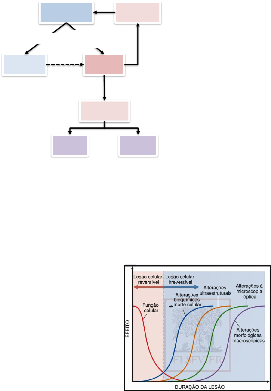 LESÃO CELULAR, ACÚMULOS E DEPÓSITOS Esquema mostra os possíveis caminhos seguidos pela célula. Inicialmente, ela se encontra em homeostasia, mas a todo momento o nosso organismo está sofrendo estímulos nocivos ou até estresse de alguma forma, assim a célula que se encontra em seu estado normal (homeostase), através desses estímulos ela pode sofrer uma adaptação (dependendo da sua capacidade de se adaptar) ou podem até mesmo sofrer uma lesão. Essa lesão pode ser de forma leve e transitória sendo uma lesão reversível, onde a célula volta ao seu estado de homeostasia normal após cessar aquele estímulo nocivo. Ou esse estímulo pode ser de uma forma mais intensa e progressiva levando esta lesão a um estágio irreversível, a célula não volta ao seu estágio inicial. A lesão irreversível progride para morte celular, que pode ser através da necrose ou apoptose. Mecanismos de lesão celular Há vários mecanismos que geram a lesão celular, que depende sempre dessas variáveis: ▪ Tipo de lesão (podemos entender como o agente etiológico), sua duração e gravidade ▪ Tipo, estado e adaptabilidade da célula lesada (capacidade de adaptação da célula lesada e o estado de que se encontra de viabilidade) ▪ Múltiplos mecanismos e alvos celulares (ocorrendo ao mesmo tempo) Este gráfico mostra a relação da duração do estímulo da lesão com efeito que ela provoca na célula. Ao mesmo tempo que vemos o declínio da função celular, vemos que aumenta as alterações bioquímicas, as alterações estruturais e as alterações morfológicas (microscópicas e macroscópicas). Então, chega um ponto de declínio dessa função celular que ela não retorna mais, que a lesão passa ser irreversível que se torna-se impossível a célula voltar o seu estágio inicial de homeostase. CÉLULA NORMAL (homeostasia) LESÃO REVERSÍVEL LESÃO CELULAR ADAPTAÇÃO LESÃO IRREVERSÍVEL NECROSE APOPTOSE Leve, transitória Estímulos nocivos Estresse Incapacidade de se adaptar Intensa, progressiva MORTE CELULAR Causas de lesão celular A principal causa de lesão celular, a mais frequente, é a hipóxia. Hipóxia é a privação do oxigênio, pode ser uma privação de oxigênio de forma total ou apenas parcial, a redução da respiração oxidativa aeróbica naquele tecido. A redução da capacidade de transporte de O2 no sangue pode ser causado por uma lesão isquêmica, uma isquemia causando essa redução do fluxo sanguíneo e que diminui a quantidade de oxigênio naquele tecido. Também pode ser provocada pela insuficiência cardiorrespiratória. Outros agentes também podem levar a lesão celular: agentes físicos, agente químicos e agentes infecciosos. As reações imunológicas também podem causar lesão celular, pois nosso corpo está respondendo o tempo todo os vários estímulos. Então a reação imune ao agente externo além de eliminar o agente agressor também pode lesionar células e tecidos. Também temos as reações lesivas aos antígenos endógenos, ou seja, o nosso corpo não reconhece nossas moléculas do próprio corpo como sendo próprios, eles reconhecem como se fossem antígenos, daí as causas das lesões autoimunes, das doenças autoimunes, é uma reação do nosso organismo contra componentes do nosso próprio corpo. Tem também os defeitos genéticos e os desequilíbrios nutricionais, tanto excesso quanto deficiência de determinados componentes/nutrientes causando assim lesão celular. Este esquema mostra uma visão geral de como ocorre uma lesão celular. A célula apresenta homeostase e, através de algum estímulo, começa a sofrer a lesão. Inicialmente se consegue ver a tumefação, o aumento desse volume celular, o aumento de suas organelas. Começa a haver formação de bolhas na sua membrana e, com isso, a cromatina, numa tentativa de proteger o material genético, começa a aglomerar no interior do núcleo. Mas, cessando o estímulo, a célula começa a se recuperar voltando ao normal. A tumefação vai se refazendo e a célula vai voltando ao seu tamanho normal, ao seu estado normal de homeostasia. São lesões reversíveis. A imagem A mostra os túbulos renais normais e a B uma lesão isquêmica reversível, está faltando o fluxo de oxigênio nesse local (túbulos renais) e as células começam a ficar desorganizadas. Comparando as duas figuras dá para ver a desorganização estrutural da célula na figura B. Com a lesão isquêmica começa a ter as alterações metabólicas, as alterações bioquímicas e estruturais causando alterações morfológicas, então vemos alterações na forma dessa célula. Neste corte histológico podemos ver células entumecidas bem na região central do epitélio (que é toda essa faixa mais arroxeada). Na sua periferia vemos as células mais densas, mais compactadas e núcleos mais próximos e nessa área mais central (onde estão as setas) vemos as células mais entumecidas, mais pálidas e mais edemaciadas. É uma lesão celular que, após cessar o estímulo, a célula vai voltar ao normal. Como as células estão entumecidas a diferença das células dessa periferia (mais arroxeadas) que estão mais próximas e bem mais unidas, e nessa região central, as células estão bem mais expandidas. Sinal de lesão reversível. Degeneração e acúmulo Degenerações e acúmulo são lesões reversíveis secundárias às alterações bioquímicas, ou seja, elas acontecem a partir de alterações bioquímicas que resultam numa retenção anormal de substâncias tanto endógenas ou exógenas no interior dessas células. Acúmulos ▪ Transitórios ou permanentes, intracelular e/ou extracelular ▪ Constituintes normalmente sintetizados por células normais, ou seja, se dão por substâncias que são sintetizadas por células normais no nosso organismo. Acúmulo de água, lipídios, proteínas, carboidratos, pigmentos. Todas essas substâncias são produzidas, normalmente, pelo nosso corpo que, através de al