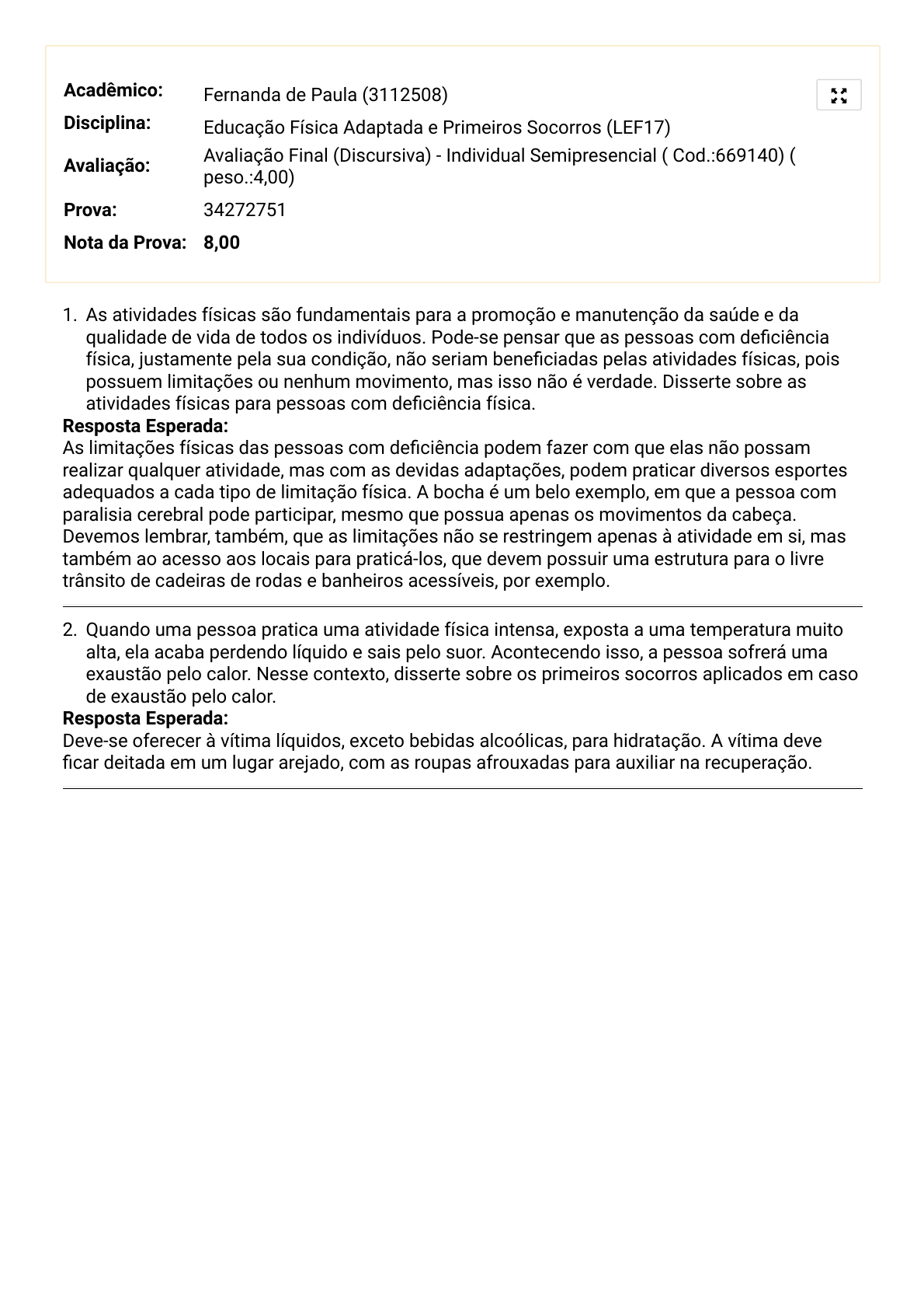 27/06/2021 UNIASSELVI - Centro Universitário Leonardo Da Vinci - Portal do Aluno - Portal do Aluno - Grupo UNIASSELVI https://portaldoalunoead.uniasselvi.com.br/ava/notas/request_gabarito_n2.php?action1=MDU2NkZTRQ==&action2=TEVGMTc=&action3=NjY5M… 1/1 Acadêmico: Fernanda de Paula (3112508) Disciplina: Educação Física Adaptada e Primeiros Socorros (LEF17) Avaliação: Avaliação Final (Discursiva) - Individual Semipresencial ( Cod.:669140) (peso.:4,00) Prova: 34272751 Nota da Prova: 8,00 1. As atividades físicas são fundamentais para a promoção e manutenção da saúde e da qualidade de vida de todos os indivíduos. Pode-se pensar que as pessoas com deficiência física, justamente pela sua condição, não seriam beneficiadas pelas atividades físicas, pois possuem limitações ou nenhum movimento, mas isso não é verdade. Disserte sobre as atividades físicas para pessoas com deficiência física. Resposta Esperada: As limitações físicas das pessoas com deficiência podem fazer com que elas não possam realizar qualquer atividade, mas com as devidas adaptações, podem praticar diversos esportes adequados a cada tipo de limitação física. A bocha é um belo exemplo, em que a pessoa com paralisia cerebral pode participar, mesmo que possua apenas os movimentos da cabeça. Devemos lembrar, também, que as limitações não se restringem apenas à atividade em si, mas também ao acesso aos locais para praticá-los, que devem possuir uma estrutura para o livre trânsito de cadeiras de rodas e banheiros acessíveis, por exemplo. 2. Quando uma pessoa pratica uma atividade física intensa, exposta a uma temperatura muito alta, ela acaba perdendo líquido e sais pelo suor. Acontecendo isso, a pessoa sofrerá uma exaustão pelo calor. Nesse contexto, disserte sobre os primeiros socorros aplicados em caso de exaustão pelo calor. Resposta Esperada: Deve-se oferecer à vítima líquidos, exceto bebidas alcoólicas, para hidratação. A vítima deve ficar deitada em um lugar arejado, com as roupas afrouxadas para auxiliar na recuperação.