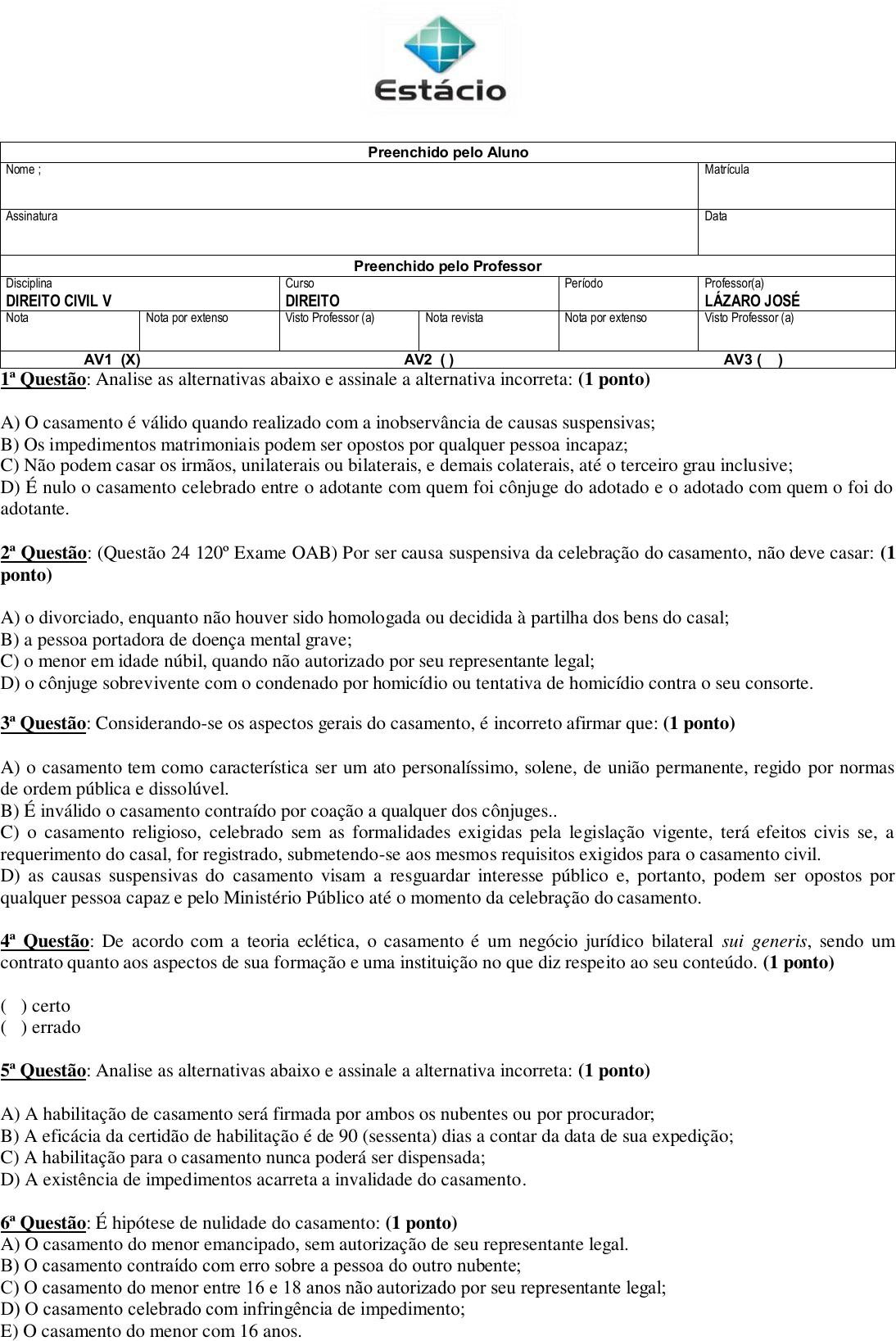 Preenchido pelo Aluno Nome ; Matrícula Assinatura Data Preenchido pelo Professor Disciplina DIREITO CIVIL V Curso DIREITO Período Professor(a) LÁZARO JOSÉ Nota Nota por extenso Visto Professor (a) Nota revista Nota por extenso Visto Professor (a) AV1 (X) AV2 ( ) AV3 ( ) 1ª Questão: Analise as alternativas abaixo e assinale a alternativa incorreta: (1 ponto) A) O casamento é válido quando realizado com a inobservância de causas suspensivas; B) Os impedimentos matrimoniais podem ser opostos por qualquer pessoa incapaz; C) Não podem casar os irmãos, unilaterais ou bilaterais, e demais colaterais, até o terceiro grau inclusive; D) É nulo o casamento celebrado entre o adotante com quem foi cônjuge do adotado e o adotado com quem o foi do adotante. 2ª Questão: (Questão 24 120º Exame OAB) Por ser causa suspensiva da celebração do casamento, não deve casar: (1 ponto) A) o divorciado, enquanto não houver sido homologada ou decidida à partilha dos bens do casal; B) a pessoa portadora de doença mental grave; C) o menor em idade núbil, quando não autorizado por seu representante legal; D) o cônjuge sobrevivente com o condenado por homicídio ou tentativa de homicídio contra o seu consorte. 3ª Questão: Considerando-se os aspectos gerais do casamento, é incorreto afirmar que: (1 ponto) A) o casamento tem como característica ser um ato personalíssimo, solene, de união permanente, regido por normas de ordem pública e dissolúvel. B) É inválido o casamento contraído por coação a qualquer dos cônjuges.. C) o casamento religioso, celebrado sem as formalidades exigidas pela legislação vigente, terá efeitos civis se, a requerimento do casal, for registrado, submetendo-se aos mesmos requisitos exigidos para o casamento civil. D) as causas suspensivas do casamento visam a resguardar interesse público e, portanto, podem ser opostos por qualquer pessoa capaz e pelo Ministério Público até o momento da celebração do casamento. 4ª Questão: De acordo com a teoria eclética, o casamento é um negócio jurídico bilateral sui generis, sendo um contrato quanto aos aspectos de sua formação e uma instituição no que diz respeito ao seu conteúdo. (1 ponto) ( ) certo ( ) errado 5ª Questão: Analise as alternativas abaixo e assinale a alternativa incorreta: (1 ponto) A) A habilitação de casamento será firmada por ambos os nubentes ou por procurador; B) A eficácia da certidão de habilitação é de 90 (sessenta) dias a contar da data de sua expedição; C) A habilitação para o casamento nunca poderá ser dispensada; D) A existência de impedimentos acarreta a invalidade do casamento. 6ª Questão: É hipótese de nulidade do casamento: (1 ponto) A) O casamento do menor emancipado, sem autorização de seu representante legal. B) O casamento contraído com erro sobre a pessoa do outro nubente; C) O casamento do menor entre 16 e 18 anos não autorizado por seu representante legal; D) O casamento celebrado com infringência de impedimento; E) O casamento do menor com 16 anos. 7ª Questão: (Ano: 2015; Banca: FCC; Órgão: TJ-AL; Prova: Juiz Substituto). A respeito do casamento putativo, é CORRETO afirmar que: (1 ponto) A) se não for nulo, mas apenas anulável, se contraído de boa-fé, por ambos os cônjuges, o casamento, em relação a estes como aos filhos, produz todos os efeitos até o dia da sentença anulatória. B) produz todos os efeitos, embora nulo ou anulável, independentemente de boa-fé de um ou de ambos os cônjuges, tendo em vista a necessidade de segurança jurídica em matéria de casamento. C) não produz nenhum efeito, porque o casamento se regula por normas de ordem pública. D) não encontra previsão legal, sendo criação da jurisprudência, para regularizar a posse do estado de casado. E) embora anulável ou mesmo nulo, se contraído de boa-fé por ambos os cônjuges, o casamento, em relação a estes como aos filhos, produz todos os efeitos até o dia da sentença anulatória. 8ª Questão: (MPRS Assistente de Promotoria 2008 - adaptada) Maria, solteira, com 72 anos de idade, pretende se casar com Joaquim, também solteiro, que possui 72 anos. Diana com 68 anos de idade pretende se casar com Jean, que é solteiro e também possui 68 anos, mas faz doze meses que o casamento de Diana com Douglas se desfez por ser considerado nulo. Nestas hipóteses: (1 ponto) A) Maria pode se casar, mas deverá adotar obrigatoriamente o regime da separação de bens. Quanto à Diana, não há nenhum impedimento ou causa suspensiva para o seu casamento com Jean. B) Maria pode casar, mas Diana está impedida de contrair matrimônio até dezoito meses após a anulação de seu casamento com Douglas. C) Maria e Diana não podem se casar, por expressa determinação legal. D) Maria pode casar, mas Diana está impedida de contrair matrimônio até dois anos após a anulação de seu casamento com Douglas. 2ª parte discursiva -Cada questão vale 1,0 (um) ponto, totalizando 2,0 (dois pontos). 9ª Questão: Asdrubal se casou com Hermenegilda em maio de 2016, após 8 (oito) meses, resolveram pôr fim ao enlace matrimonial. Asdrubal após o divórcio assumiu seu amor por Givanilda mãe de Hermenegilda. Assim, Asdrubal e Givanilda resolveram se casar, para tanto, compareceram ao cartório efetuando o requerimento de habilitação junto ao oficial do Registro Civil. Após os nubentes entregarem toda documentação, o oficial do cartório impugnou a habilitação, submetendo-a ao juiz que em ato contínuo, julgou improcedente o pedido dos nubentes. Diante do caso em tela agiu corretamente o juiz? Justifique sua resposta? 10ª Questão: Gervásio se casou com Tertuliana, mas após 2 (dois) anos requereu o divórcio por estar apaixonado pela irmã mais nova de sua esposa, a jovem Genoveva de 18 anos. O divórcio foi averbado no cartório competente. Desejando se casar, pediu a mão da jovem em casamento, mas o consentimento foi negado. Os pais disseram que não aceitavam