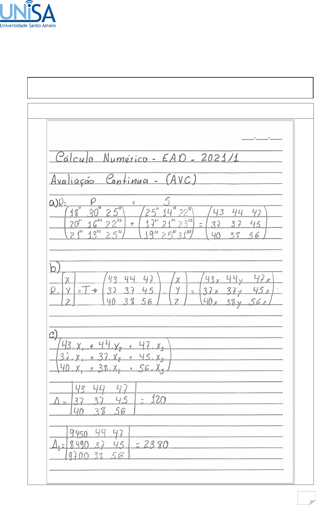 1 AVC – AVALIAÇÃO CONTÍNUA FOLHA DE RESPOSTA Disci Resolução / Resposta Disciplina: Cálculo Numérico 2