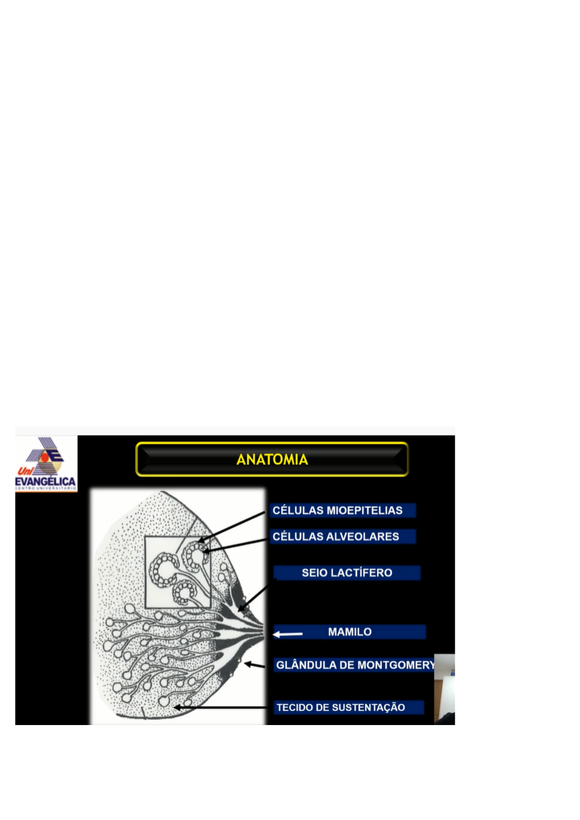 Semiologi� d� mam� Embriologi� - Da 5° a 6° semana ocorre o espessamento compacto do ectoderma na parede antero-lateral do corpo, originando a linha láctea, que vai da axila até a região inguinal - Na 8° semana ocorre uma involução, formando os brotos mamários - O espessamento do ectoderma vai se projetar para o interior do mesoderma - Cada brotamento mamário primitivo dará origem a vários brotamentos secundários, dutos lactíferos e seus ramos - Formação da glândula mamária primitiva desenvolvimento da mama- estrogênio Anatomi� - A mama é composta por 15 a 20 Lóbulos glandulares (cachos de uva) os quais são envolvidos por um suporte de tecido adiposo e fibroso; vão desembocar no mamilo - Células Alveolares: responsáveis pela produção de leite e joga no tubo - Células mioepiteliais: influenciadas pela ocitocina vão empurrar o leite para o seio lactífero - Glândula de Montgomery: função de sustentação e lubrificação �am� Clínic� d� Mam� Anamnese . Antecedentes ginecológicos e obstétricos . Queixa principal . História progressa da doença atual e interrogatório de sistemas . Antecedentes familiares de câncer de mama, ovário e trompas . História de cirurgias prévias de neoplasias e estéticas da mama - Dor mamária (Mastodinia ou Mastalgia) . Cíclica: dor difusa, bilateral, intensifica na semana do ciclo e melhora ao fim da menstruação . Acíclica: sem relação com o ciclo menstrual; geralmente unilateral, localizada, causada por cistos, mastite, traumas - Nódulo mamário . Benigno ou maligno . Caracterização: localização (uni/bilateral); tamanho; crescimento; consistência; mobilidade e sensibilidade - Derrame papilar . pode ocorrer por causa mamária ou extramamária . Derrame Fisiológico:secreção multiductal, bilateral, provocado ou espontâneo; cor amarelada, esverdeada; geralmente causado pela manipulação ou ectasia ductal . Derrame Patológico: secreção unilateral, uniductal, espontânea, persistente, coloração cristalina, serosa ou hemática . Galactorréia: secreção leitosa, bilateral, multiductal, formato grávido puerperal e geralmente causado por aumento da prolactina (tumores hipofisários ou medicação) - Secreção mamilar principal carcinoma da mama - uniductal; principal local de cancer de mama alterações internas - assimetria mamária - casca de laranja- carcinoma pressioando tanto ligamentos quanto linfáticos - destruição mamilar; doença de Pajet (tumor em um ducto,, começa a eliminar células cancerigenas que vao mestatizzar na superficia)
