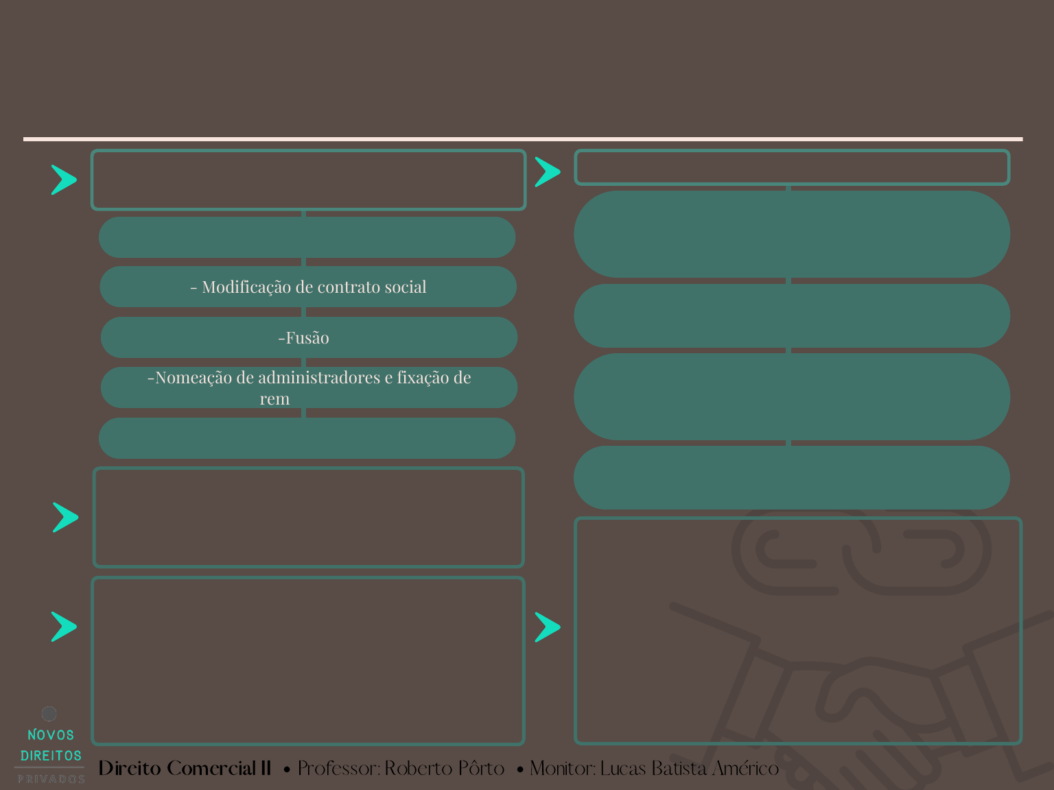Exemplo de deliberações em reuniões e assembeias (Art 1.071 CC/02): Caso haja convenção unânime dos sócios, basta apenas pronunciamento por escrito, dispensando tanto reunião, quanto assembleia Para microempresas e empresas de pequeno porte, após a lei complementar 123/06 (art. 70 CC/02) tornou-se dispensável a realização de assembleia ou reunião, bem como dispensou a necessidade de manifestação escrita de todos os sócios, exceto para exclusão de sócio, salvo disposição em contrato social. Reunião e Assembleia As sociedades detêm vontade própria que se expressa pelas reuniões e assembleias, as quais deliberam sobre as matérias de maior relevância da sociedade, previstas pelo Art 1.071 e 1.068 de CC/02. - Aprovação de contas Direito Comercial II • Professor: Roberto Pôrto • Monitor: Lucas Batista Américo - Modificação de contrato social -Fusão -Nomeação de administradores e fixação de remuneração -Destituição de administradores A reunião é uma forma mais simples de debate, para sociedade de até 10 sócios, que podem seguir regras delimitadas pelos próprios sócios, devendo apenas seguir os quóruns exigidos por lei (art. 1.071 e 1.076 CC) Em relação a quóruns exige-se: -Pelo menos metade de todo o capital social para a nomeação, destituição ou fixação de remuneração dos administradores, bem como ao pedido de recuperação judicial -A unanimidade para a designação de administrador não sócio, enquanto o capital não estiver integralizado - Pelo menos dois terços do capital social para a destituição de administrador sócio, nomeado pelo contrato social e para a nomeação de administrador não sócio, quando o capital já estiver integralizado -As demais deliberações exigem-se apenas a maioria dos votos dos presentes, salvo previsão em contrato social É obrigatório haver assembleia dos sócios nos primeiros quatro meses após o final do exercício social (período de 12 meses), com intuito de: A convocação deve ser feita pelos administradores e, subsidiariamente, pelos sócios ou, caso haja, pelo conselho fiscal A convocação deve ser realizada de forma a dar ciência inequívoca aos sócios da data, hora, local e relação das matérias a serem tratadas, para que eles compareçam e possam defender seus interesses na formação da vontade social. As assembleias funcionam similarmente à reunião, porém com disposições e ritos a serem seguidos, regidos pelo código civil. Direito Comercial II • Professor: Roberto Pôrto • Monitor: Lucas Batista Américo -Apreciar as contas dos administradores - Deliberar sobre o balanço patrimonial -E apreciar outras matérias a serem pautadas a vontade dos sócios As deliberações da sociedade serão tomadas pelos votos dos sócios, contados de acordo com a participação no capital social Reunião e Assembleia A Instrução Normativa DREI nº 75, de 18/02/20200, admite que as Juntas Comerciais adotem o recebimento dos atos societários apresentados para registro por meio eletrônico Pode ser composta por uma ou por várias pessoas, que podem ter competências conjuntas ou separadas Nas Sociedades Limitadas, o administrador costumeiramente é sócio, mas admite-se a nomeação de administradores estranhos ao quadro social, desde que obedeça ao quórum Os administradores não podem participar diretamente ou indiretamente de atividade concorrente da sociedade (art. 1.171) Administração Administrador é o responsável pela atuação da sociedade, é aquele que pratica os atos fundamentais para que a sociedade se desenvolva e consiga realizar seu objeto social. Seu campo de ação pode ser limitada por cláusulas específicas no instrumento de nomeação, ou pode ser limitada apenas pela atividade própria da sociedade. Direito Comercial II • Professor: Roberto Pôrto • Monitor: Lucas Batista Américo Para sócio nomeado administrador no contrato social, exige-se para sua destituição no mínimo 2/3 do capital social, salvo disposição em contrário do contrato social Exige-se idoneidade do administrador, havendo delimitação expressa para tanto no art. 1.011 § 1o CC No caso de administrador estranho ao quadro social ou administrador sócio, nomeado em ato separado, a destituição será decidida pela maioria do capital social A exclusão do sócio é um direito da própria sociedade de se defender contra aqueles que põem em risco sua existência e sua atividade. Direito Comercial II • Professor: Roberto Pôrto • Monitor: Lucas Batista Américo Conforme dispõe o Art. 1.029, qualquer sócio pode retirar-se da sociedade por prazo indeterminado, mediante notificação aos demais sócios Caso somente existam dois sócios, o sócio remanescente pode permanecer como único sócio por um período de 180 (cento e oitenta dias), após o qual deve indicar novo sócio; ou dissolver a sociedade ou se transformar em EIRELI A não integralização do valor subscrito da quota dentro do prazo estabelecido para subscrição, torna sócio remisso e passível de exclusão A notificação deve ser feita com antecedência mínima de 60 (sessenta) dias, sendo que os demais sócios podem decidir, nos trinta dias subsequentes à notificação, pela dissolução da sociedade. Caso não o façam, a sociedade remanesce, ainda que com um só sócio É possível por ação dos detentores da maioria do capital social, a exclusão judicial do sócio que tenha cometido falta grave no cumprimento de suas obrigações, ou ainda por incapacidade superveniente Resolução da sociedade em relação a sócios minoritários O termo sócio minoritário designa aqueles que possuem o menor número de quotas Não há no Código Civil uma definição precisa do que seja justa causa, sendo estabelecido, apenas, que justa causa ocorre sempre que a preservação da sociedade for ameaçada, sendo esse o princípio fundamental da exclusão Resolução da sociedade em relação a sócios minoritários - exclusã