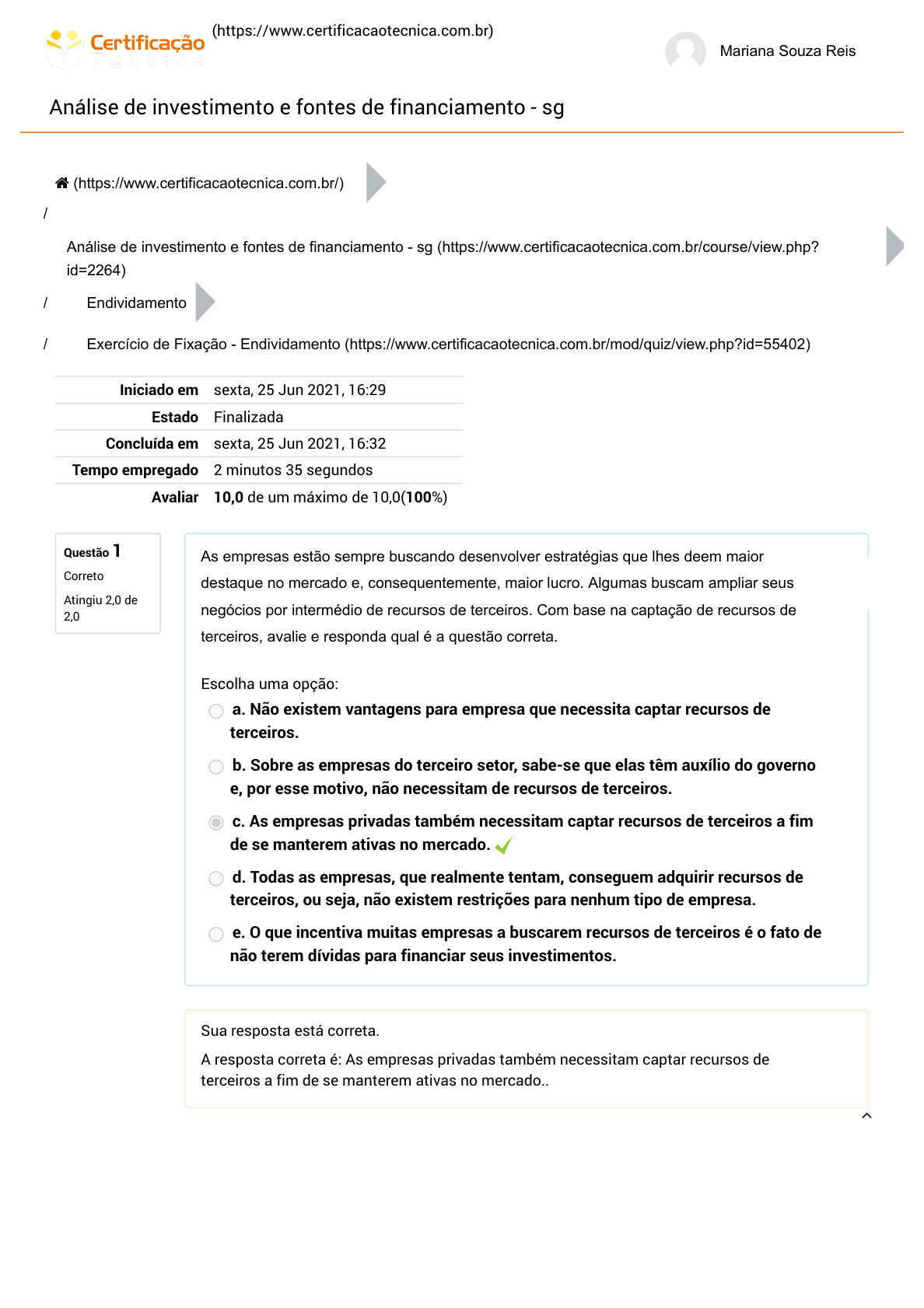 (https://www.certificacaotecnica.com.br) Mariana Souza Reis Análise de investimento e fontes de financiamento - sg Questão 1 Correto Atingiu 2,0 de 2,0 / / / Iniciado em sexta, 25 Jun 2021, 16:29 Estado Finalizada Concluída em sexta, 25 Jun 2021, 16:32 Tempo empregado 2 minutos 35 segundos Avaliar 10,0 de um máximo de 10,0(100%) As empresas estão sempre buscando desenvolver estratégias que lhes deem maior destaque no mercado e, consequentemente, maior lucro. Algumas buscam ampliar seus negócios por intermédio de recursos de terceiros. Com base na captação de recursos de terceiros, avalie e responda qual é a questão correta. Escolha uma opção: a. Não existem vantagens para empresa que necessita captar recursos de terceiros. b. Sobre as empresas do terceiro setor, sabe-se que elas têm auxílio do governo e, por esse motivo, não necessitam de recursos de terceiros. c. As empresas privadas também necessitam captar recursos de terceiros a fim de se manterem ativas no mercado. d. Todas as empresas, que realmente tentam, conseguem adquirir recursos de terceiros, ou seja, não existem restrições para nenhum tipo de empresa. e. O que incentiva muitas empresas a buscarem recursos de terceiros é o fato de não terem dívidas para financiar seus investimentos. Sua resposta está correta. A resposta correta é: As empresas privadas também necessitam captar recursos de terceiros a fim de se manterem ativas no mercado.. (https://www.certificacaotecnica.com.br/) Análise de investimento e fontes de financiamento - sg (https://www.certificacaotecnica.com.br/course/view.php? id=2264) Endividamento Exercício de Fixação - Endividamento (https://www.certificacaotecnica.com.br/mod/quiz/view.php?id=55402) https://www.certificacaotecnica.com.br/ https://www.certificacaotecnica.com.br/ https://www.certificacaotecnica.com.br/course/view.php?id=2264 https://www.certificacaotecnica.com.br/mod/quiz/view.php?id=55402 Questão 2 Correto Atingiu 2,0 de 2,0 Questão 3 Correto Atingiu 2,0 de 2,0 Os índices são considerados importantes ferramentas para análise financeira, apresentando informações relevantes para a tomada de decisão. Um dos indicadores utilizados pelos gestores é o indicador de endividamento. A partir das opções apresentadas, analise e identifique a correta, com base nesse indicador. Escolha uma opção: a. O índice de endividamento geral não permite avaliar o risco da empresa por meio de análise. b. Com base na análise do índice de endividamento geral, é preciso considerar que, quanto maior, melhor será o resultado da empresa. c. O índice de endividamento geral garante para a empresa a inexistência de qualquer tipo de risco com relação aos investimentos d. Por meio do índice de endividamento geral, fica claro que, para que a posição da empresa seja aceitável, é preciso que o tipo de endividamento possibilite alguma espécie de perda nas operações da empresa. e. O índice de endividamento geral visa a medir a proporção entre o total dos ativos da empresa que são financiados por terceiros. Sua resposta está correta. A resposta correta é: O índice de endividamento geral visa a medir a proporção entre o total dos ativos da empresa que são financiados por terceiros.. Os indicadores de gestão econômico-financeiros representam técnicas que são aplicadas pelas empresas a fim de obter dados e gerar informações financeiras que apresentarão a posição em que a empresa se encontra num período específico. Com relação aos indicadores de rentabilidade e como eles contribuem com a gestão, marque a resposta correta. Escolha uma opção: a. O indicador de rentabilidade apresenta somente o quanto a empresa gerou de prejuízo com relação ao seu capital próprio. b. Os índices de rentabilidade permitem analisar o lucro que a organização teve. c. O índice de retorno sobre o investimento analisa a relação entre as vendas brutas e os ativos. d. O indicador de rentabilidade apresenta o retorno somente sobre o investimento. e. O indicador de rentabilidade apresenta apenas a relação entre o resultado da empresa referente ao volume do capital aplicado por ela nos seus investidores. Sua resposta está correta. A resposta correta é: Os índices de rentabilidade permitem analisar o lucro que a organização teve.. Questão 4 Correto Atingiu 2,0 de 2,0 Questão 5 Correto Atingiu 2,0 de 2,0 O gerenciamento de recursos de terceiros é importante, pois, por meio dele, a empresa cria estratégias a fim de definir a correta aplicação de tais recursos. Com base na gestão de recursos de terceiros, avalie a alternativa correta. Escolha uma opção: a. Obrigatoriamente, os investimentos realizados pelas empresas são direcionados para ativos tangíveis ou intangíveis. Assim, entende-se que não é possível realizar outras formas de investimentos. b. Considerando a gestão de recursos de terceiros, o gestor deve direcionar tais recursos adquiridos pela empresa investindo em passivos mais rentáveis. c. A rentabilidade corresponde a um critério de mensuração para o gerenciamento de recurso de terceiros, sendo uma estratégia que auxilia a gestão. d. O planejamento não se faz necessário para a correta aplicação dos recursos de terceiros. e. O papel do gestor tem foco nas finanças da empresa, ou seja, nos recursos e nos investimentos, não tendo por responsabilidade verificar a perspectiva dos investidores Sua resposta está correta. A resposta correta é: A rentabilidade corresponde a um critério de mensuração para o gerenciamento de recurso de terceiros, sendo uma estratégia que auxilia a gestão.. Para o bom acompanhamento do desempenho financeiro empresarial, administradores fazem uso dos indicadores financeiros, que os auxiliam no controle de informações importantes. A partir dos indicadores de liquidez e da maneira que eles contribuem com as estratégias da gestão, identifique a resposta correta. Escolha uma opção: a. Avaliando o índice