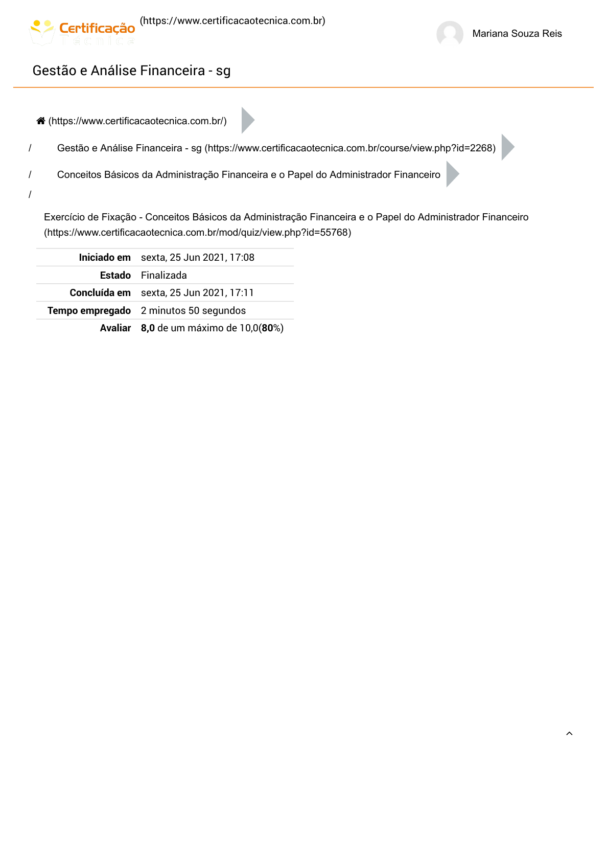 (https://www.certificacaotecnica.com.br) Mariana Souza Reis Gestão e Análise Financeira - sg / / / Iniciado em sexta, 25 Jun 2021, 17:08 Estado Finalizada Concluída em sexta, 25 Jun 2021, 17:11 Tempo empregado 2 minutos 50 segundos Avaliar 8,0 de um máximo de 10,0(80%) (https://www.certificacaotecnica.com.br/) Gestão e Análise Financeira - sg (https://www.certificacaotecnica.com.br/course/view.php?id=2268) Conceitos Básicos da Administração Financeira e o Papel do Administrador Financeiro Exercício de Fixação - Conceitos Básicos da Administração Financeira e o Papel do Administrador Financeiro (https://www.certificacaotecnica.com.br/mod/quiz/view.php?id=55768) https://www.certificacaotecnica.com.br/ https://www.certificacaotecnica.com.br/ https://www.certificacaotecnica.com.br/course/view.php?id=2268 https://www.certificacaotecnica.com.br/mod/quiz/view.php?id=55768 Questão 1 Correto Atingiu 2,0 de 2,0 A administração financeira, através de seu gestor, condiciona esse profissional a tomar uma série de decisões, entre elas o que diz respeito aos recursos financeiros. As principais questões que se configuram nestes casos são, por exemplo, diante de recursos disponíveis, como utilizá-los e, ao contrário, quando escassos, como obtê-los. O propósito do gestor é proporcionar à empresa os recursos necessários e que possam suprir todas as suas operações, ou pelo menos parte significativa delas, sabendo que precisará tomar novas decisões dependendo da disponibilidade ou não desses recursos. Diante da importância das ações que o ocupante desse cargo precisa reconhecer, destaque entre as alternativas a seguir, quais são os principais passos definidos pelos autores citados para esta unidade e que devem ser considerados em um processo de tomada de decisões. Escolha uma opção: a. São seis os passos definidos pelos autores: mapear as ações passadas da empresa; reconhecer a necessidade de uma decisão; gerar alternativas; analisar as alternativas; escolher entre as alternativas; implementar a alternativa escolhida. b. São sete os passos definidos pelos autores: reconhecer a necessidade de uma decisão; gerar alternativas; analisar as alternativas; escolher entre as alternativas; implementar a alternativa escolhida; aprender com o feedback; gerar relatórios. c. Os autores consideram cinco os passos definidos pelos autores: reconhecer a necessidade de uma decisão; gerar alternativas; analisar as alternativas; escolher entre as alternativas; implementar a alternativa escolhida. d. São seis os passos definidos pelos autores: reconhecer a necessidade de uma decisão; gerar alternativas; analisar as alternativas; escolher entre as alternativas; implementar a alternativa escolhida; aprender com o feedback. e. São cinco os passos definidos pelos autores: reconhecer a necessidade de uma decisão; gerar alternativas; analisar as alternativas; descartar alternativas; implementar a alternativa escolhida; aprender com o feedback. Sua resposta está correta. A resposta correta é: São seis os passos definidos pelos autores: reconhecer a necessidade de uma decisão; gerar alternativas; analisar as alternativas; escolher entre as alternativas; implementar a alternativa escolhida; aprender com o feedback.. Questão 2 Correto Atingiu 2,0 de 2,0 A partir da leitura indicada para esta unidade, foi possível perceber a diferença entre a tomada de decisões programadas e a tomada de decisões não programadas. Das alternativas a seguir, assinale a CORRETA: Escolha uma opção: a. A primeira, refere-se a uma ação que é definida somente pelo know-how do gestor e sua visão de mercado, não requerendo nenhum planejamento. A segunda, refere-se a uma reação rápida a algum problema que ocorreu na empresa ou em seu entorno. b. A primeira, refere-se a ações de rotina e padronizadas; a segunda, refere-se a ações sistêmicas. c. A primeira, trata-se de uma decisão de rotina, praticamente automática, que segue padrões predeterminados, levando em consideração ações de planejamento, organização, direção e controle, atreladas aos objetivos organizacionais e sua visão. A segunda, refere-se à tomada de decisões não esperadas, contingenciais, que exigem respostas rápidas a oportunidades ou ameaças existentes no mercado. No entanto, tomar decisões sem uma análise prévia das alternativas e seus impactos geram riscos que, na maioria das vezes, resultam em altos custos organizacionais. d. As decisões não programadas não ocorrem nas organizações. e. As decisões programadas e não programadas são determinadas pelo tempo que o gestor tem à disposição para a sua elaboração. Sua resposta está correta. A resposta correta é: A primeira, trata-se de uma decisão de rotina, praticamente automática, que segue padrões predeterminados, levando em consideração ações de planejamento, organização, direção e controle, atreladas aos objetivos organizacionais e sua visão. A segunda, refere-se à tomada de decisões não esperadas, contingenciais, que exigem respostas rápidas a oportunidades ou ameaças existentes no mercado. No entanto, tomar decisões sem uma análise prévia das alternativas e seus impactos geram riscos que, na maioria das vezes, resultam em altos custos organizacionais.. Questão 3 Incorreto Atingiu 0,0 de 2,0 A tomada de decisões é o processo pelo qual os gerentes reagem às oportunidades e ameaças que os confrontam ao analisar as opções e fazer determinações, ou tomar decisões, sobre objetivos organizacionais e modos de ação específicos. Identifica-se neste processo o processo reativo dos gestores à oportunidades e ameaças. Descreva como isto ocorre no processo operacional da organização: I) A tomada de decisões em resposta às oportunidades ocorre quando os gerentes buscam maneiras de aprimorar o desempenho organizacional para beneficiar clientes, funcionários e outros stakeholders (pessoas interessadas). II) A tomada