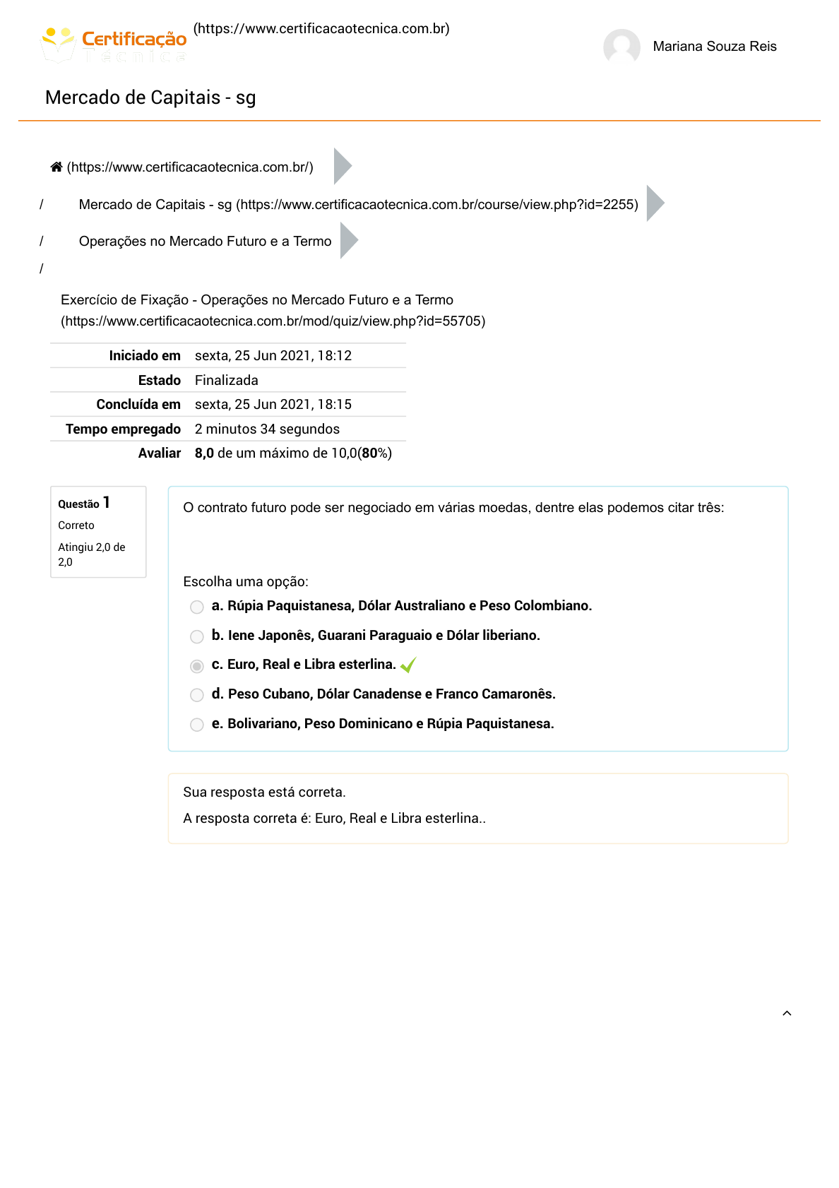 (https://www.certificacaotecnica.com.br) Mariana Souza Reis Mercado de Capitais - sg Questão 1 Correto Atingiu 2,0 de 2,0 / / / Iniciado em sexta, 25 Jun 2021, 18:12 Estado Finalizada Concluída em sexta, 25 Jun 2021, 18:15 Tempo empregado 2 minutos 34 segundos Avaliar 8,0 de um máximo de 10,0(80%) O contrato futuro pode ser negociado em várias moedas, dentre elas podemos citar três: Escolha uma opção: a. Rúpia Paquistanesa, Dólar Australiano e Peso Colombiano. b. Iene Japonês, Guarani Paraguaio e Dólar liberiano. c. Euro, Real e Libra esterlina. d. Peso Cubano, Dólar Canadense e Franco Camaronês. e. Bolivariano, Peso Dominicano e Rúpia Paquistanesa. Sua resposta está correta. A resposta correta é: Euro, Real e Libra esterlina.. (https://www.certificacaotecnica.com.br/) Mercado de Capitais - sg (https://www.certificacaotecnica.com.br/course/view.php?id=2255) Operações no Mercado Futuro e a Termo Exercício de Fixação - Operações no Mercado Futuro e a Termo (https://www.certificacaotecnica.com.br/mod/quiz/view.php?id=55705) https://www.certificacaotecnica.com.br/ https://www.certificacaotecnica.com.br/ https://www.certificacaotecnica.com.br/course/view.php?id=2255 https://www.certificacaotecnica.com.br/mod/quiz/view.php?id=55705 Questão 2 Correto Atingiu 2,0 de 2,0 Questão 3 Correto Atingiu 2,0 de 2,0 O preço futuro a ser pago no vencimento de um contrato refere-se a: Escolha uma opção: a. Ao contrato de swap. b. Ao contrato a termo. c. Ao contrato de opção. d. Ao contrato futuro. e. Ao contrato debenture. Sua resposta está correta. A resposta correta é: Ao contrato futuro.. Os termos do contrato de futuro são especificados pela bolsa de futuro e os negociadores precisam acordar sobre o preço, assumindo: Escolha uma opção: a. Padrão e não padrão. b. Com contrapartida e sem contrapartida. c. Fixa e flutuante. d. Liquidado e em aberto. e. Posição comprada e vendida. Sua resposta está correta. A resposta correta é: Posição comprada e vendida.. Questão 4 Incorreto Atingiu 0,0 de 2,0 Questão 5 Correto Atingiu 2,0 de 2,0 Após serem finalizadas as negociações entre as partes, a câmara de compensação assume uma função fundamental de: Escolha uma opção: a. Arbitrador e vendedor. b. Acionista e especulador. c. Day trade e comprador. d. Especulador e hedger. e. De vendedor e comprador. Sua resposta está incorreta. A resposta correta é: De vendedor e comprador.. Nas operações de contrato futuro, os impostos apenas ordem ser pagos no final do ano sobre lucros ou perdas acumuladas. Esse procedimento precisa ser adotado em razão de: Escolha uma opção: a. Da taxa de custódia. b. As operações são feitas com paraísos fiscais, nos quais o imposto de renda é menor ou igual a 17%. c. Das taxas de corretagem. d. Do PIS. e. Os investidores não possuem controle sobre o ano fiscal onde as operações estão sendo realizadas. Sua resposta está correta. A resposta correta é: Os investidores não possuem controle sobre o ano fiscal onde as operações estão sendo realizadas..