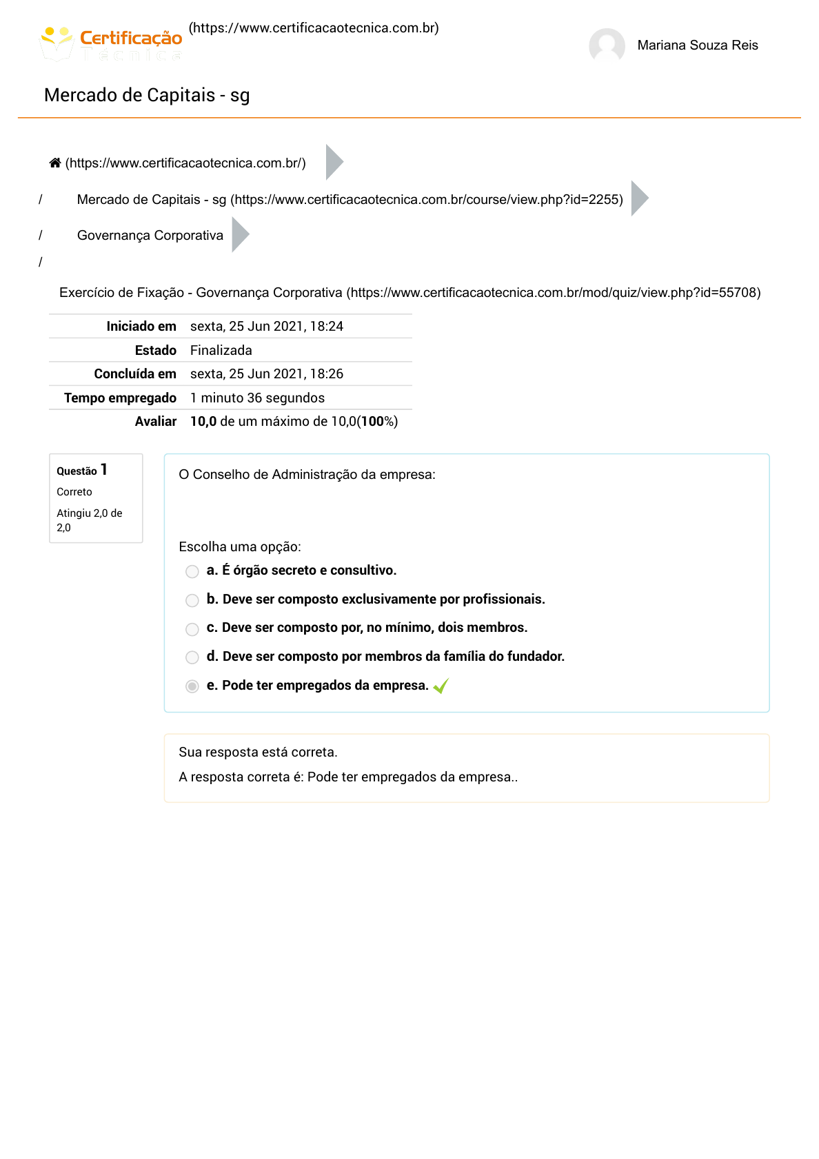 (https://www.certificacaotecnica.com.br) Mariana Souza Reis Mercado de Capitais - sg Questão 1 Correto Atingiu 2,0 de 2,0 / / / Iniciado em sexta, 25 Jun 2021, 18:24 Estado Finalizada Concluída em sexta, 25 Jun 2021, 18:26 Tempo empregado 1 minuto 36 segundos Avaliar 10,0 de um máximo de 10,0(100%) O Conselho de Administração da empresa: Escolha uma opção: a. É órgão secreto e consultivo. b. Deve ser composto exclusivamente por profissionais. c. Deve ser composto por, no mínimo, dois membros. d. Deve ser composto por membros da família do fundador. e. Pode ter empregados da empresa. Sua resposta está correta. A resposta correta é: Pode ter empregados da empresa.. (https://www.certificacaotecnica.com.br/) Mercado de Capitais - sg (https://www.certificacaotecnica.com.br/course/view.php?id=2255) Governança Corporativa Exercício de Fixação - Governança Corporativa (https://www.certificacaotecnica.com.br/mod/quiz/view.php?id=55708) https://www.certificacaotecnica.com.br/ https://www.certificacaotecnica.com.br/ https://www.certificacaotecnica.com.br/course/view.php?id=2255 https://www.certificacaotecnica.com.br/mod/quiz/view.php?id=55708 Questão 2 Correto Atingiu 2,0 de 2,0 Questão 3 Correto Atingiu 2,0 de 2,0 Em um sistema de governança corporativa, recomendam-se as seguintes estruturas, exceto: Escolha uma opção: a. Lobistas b. Auditoria externa. c. Conselho de Administração. d. Diretoria e. Conselho Fiscal. Sua resposta está correta. A resposta correta é: Lobistas. Como princípios da governança corporativa, podem ser citados: Escolha uma opção: a. Ampla defesa. b. Discrição dos atos administrativos. c. Indisponibilidade. d. Menor onerosidade. e. Transparência e prestação de contas (accountability). Sua resposta está correta. A resposta correta é: Transparência e prestação de contas (accountability).. Questão 4 Correto Atingiu 2,0 de 2,0 Questão 5 Correto Atingiu 2,0 de 2,0 O Conselho de Administração tem inúmeras atribuições, mas não lhe compete: Escolha uma opção: a. Executar a política da companhia em seu dia a dia. b. Fixar a orientação geral dos negócios da companhia. c. Deliberar, quando autorizado pelo estatuto, sobre a emissão de ações ou de bônus de subscrição. d. Manifestar-se sobre o relatório da administração e as contas da diretoria. e. Eleger e destituir os diretores da companhia e fixar-lhes as atribuições, observado o que a respeito dispuser o estatuto. Sua resposta está correta. A resposta correta é: Executar a política da companhia em seu dia a dia.. O Conselho Fiscal não deve, dentre as suas atribuições: Escolha uma opção: a. Opinar sobre o relatório anual da administração, fazendo constar do seu parecer as informações complementares que julgar necessárias ou úteis à deliberação da assembleia geral. b. Fiscalizar os atos dos administradores e verificar o cumprimento dos seus deveres legais e estatutários. c. Examinar as demonstrações financeiras do exercício social e opinar sobre elas. d. Convocar a assembleia geral ordinária, se os órgãos da administração retardarem por mais de um mês essa convocação. e. Autorizar, se o estatuto não dispuser em contrário, a alienação de bens do ativo não circulante, a constituição de ônus reais e a prestação de garantias a obrigações de terceiros. Sua resposta está correta. A resposta correta é: Autorizar, se o estatuto não dispuser em contrário, a alienação de bens do ativo não circulante, a constituição de ônus reais e a prestação de garantias a obrigações de terceiros..