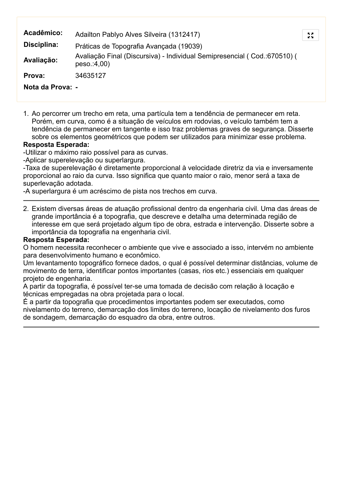 29/06/2021 UNIASSELVI - Centro Universitário Leonardo Da Vinci - Portal do Aluno - Portal do Aluno - Grupo UNIASSELVI https://portaldoalunoead.uniasselvi.com.br/ava/notas/request_gabarito_n2.php?action1=RUNFMDI5MA==&action2=MTkwMzk=&action3=NjcwN… 1/1 Acadêmico: Adailton Pablyo Alves Silveira (1312417) Disciplina: Práticas de Topografia Avançada (19039) Avaliação: Avaliação Final (Discursiva) - Individual Semipresencial ( Cod.:670510) (peso.:4,00) Prova: 34635127 Nota da Prova: - 1. Ao percorrer um trecho em reta, uma partícula tem a tendência de permanecer em reta. Porém, em curva, como é a situação de veículos em rodovias, o veículo também tem a tendência de permanecer em tangente e isso traz problemas graves de segurança. Disserte sobre os elementos geométricos que podem ser utilizados para minimizar esse problema. Resposta Esperada: -Utilizar o máximo raio possível para as curvas. -Aplicar superelevação ou superlargura. -Taxa de superelevação é diretamente proporcional à velocidade diretriz da via e inversamente proporcional ao raio da curva. Isso significa que quanto maior o raio, menor será a taxa de superlevação adotada. -A superlargura é um acréscimo de pista nos trechos em curva. 2. Existem diversas áreas de atuação profissional dentro da engenharia civil. Uma das áreas de grande importância é a topografia, que descreve e detalha uma determinada região de interesse em que será projetado algum tipo de obra, estrada e intervenção. Disserte sobre a importância da topografia na engenharia civil. Resposta Esperada: O homem necessita reconhecer o ambiente que vive e associado a isso, intervém no ambiente para desenvolvimento humano e econômico. Um levantamento topográfico fornece dados, o qual é possível determinar distâncias, volume de movimento de terra, identificar pontos importantes (casas, rios etc.) essenciais em qualquer projeto de engenharia. A partir da topografia, é possível ter-se uma tomada de decisão com relação à locação e técnicas empregadas na obra projetada para o local. É a partir da topografia que procedimentos importantes podem ser executados, como nivelamento do terreno, demarcação dos limites do terreno, locação de nivelamento dos furos de sondagem, demarcação do esquadro da obra, entre outros.