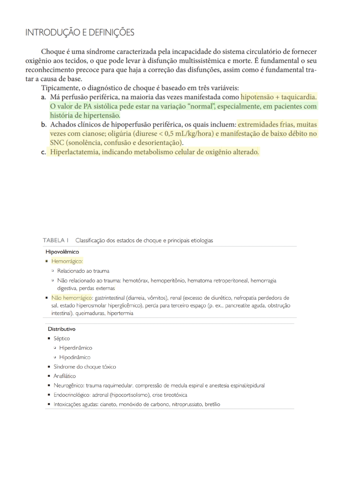 CHOQUE → Choque séptico é a forma mais frequente de apresentação, correspondendo a mais da me tade dos casos. Choque cardiogênico e hipovolêmico correspondem a cerca de 10 a 20% dos casos, cada um. Já o choque obstrutivo é o menos frequente (< 5% dos casos). → Apesar da sobreposição de mecanismos, os estados de choque são classificados em: hipovo lêmico, distributivo, cardiogênico e obstrutivo: *Quaisquer que sejam as causas ou mecanismos do choque, a hipoperfusão tecidual é capaz de ativar a resposta inflamatória, ocasionando estase microvascular, trombose, ativação de macrófagos, neutrófilos, linfócitos e plaquetas. Isso leva a um círculo vicioso no qual a res posta inflamatória piora a hipoperfusão, ativando ainda mais essas respostas patológica. CHOQUE HIPOVOLÊMICO Caracteriza -se por um inadequado débito cardíaco em razão da perda de volume, sendo di vidido em dois grandes grupos: Hipovolêmico: trauma, sangramento ativo ou recente, diarreia, perda de líquido para ter ceiro espaço. Em relação à gravidade da perda volêmica, o choque hipovolêmico é dividido em quatro classes: CHOQUE OBSTRUTIVO CAUSAS: CHOQUE CARDIOGÊNICO Choque cardiogênico: antecedentes sugestivos (p. ex. história de IC, história de IAM), sintomas de SCA, turgência jugular, edema de MMII, hepatomegalia dolorosa, B3, ictus desviado, sopros etc. CHOQUE DISTRIBUTIVO MECANISMO DA SEPSE: MECANISMO CHOQUE NEUROGÊNICO: * Distributivo: No choque dis tributivo não séptico, o exemplo clássico é o trauma cervical. Isso leva à perda do tônus simpático, com manutenção do parassimpático. Assim, há uma profunda vasodilatação, com extremidades quentes, na ausência de taquicardia (algumas vezes, até com bradicar dia). Aliás, esses achados ajudam no diagnóstico diferencial de hipovolemia. * Choque anafilático: início geralmente após um desencadeante (p. ex. anestesia, medica mento novo, picada de abelha etc.), prurido, rash cutâneo, rouquidão, dispneia, cornagem, sibilos, manifestações do TGI (p. ex. dor abdominal, diarreia) etc. ACHADOS CLÍNICOS -Reenchimento capilar lentificado associado à diminuição de temperatura de membros é um achado bastante sugestivo de situações de baixo débito cardíaco. - Hipotensão é forma mais frequente de apresentação de pacientes em choque no departamen to de emergência. Também é um preditor independente de morte hospitalar, especialmente quan do < 80 mmHg ou de forma sustentada (> 60 minutos). EXAME FISICO CARDIOVASCULAR: Por isso, no exame cardiovascular devem constar, obrigatoriamente: avaliação de frequência cardíaca e pressão arterial (sinais vitais), avaliação de estase jugular, ausculta cardíaca nos quatro focos principais, avaliação do tempo de reenchimento capilar e avaliação da temperatura de ex tremidades. A palpação dos quatro pulsos periféricos pode trazer informações, como assimetria, compatível com a dissecção aguda de aorta. A pressão arterial (PA) pode ser medida de forma não invasiva ou de forma invasiva pela colocação de um cateter arterial, sendo esta última forma a preferida nos pacientes em choque em uso de drogas vasopressoras. CATÉTER DE ARTÉRIA PULMONAR (SWAN-GANZ) CARACTERÍSTICAS DOS PARÂMETROS: Estudos recentes falharam em demonstrar benefício com o uso do cateter de Swan Ganz e, apesar da disponibilidade maior do procedimento nas unidades de terapia intensiva do país, o seu uso deve ser restrito a casos específicos em que exista dúvida sobre o padrão do choque. Deve -se lembrar que esse é um procedimento diagnóstico e não terapêutico. EXAMES COMPLEMENTARES EXAMES GERAIS INDEPENDENTES DO TIPO DE CHOQUE Resumo dos principais exames: → O lactato é útil como indicador de gravidade e mortalidade em pacientes graves, assim como sua queda indica um melhor prognóstico. → Elevação de enzimas hepáticas, bilirrubinas e escórias nitrogenadas, hipoxemia, hipocap nia, bem como presença de acidose metabólica correlacionam- se com disfunção orgânica. Monitorização do transporte de oxigênio (vários valores que obtém fazendo cálculos): TRATAMENTO Alguns detalhes iniciais: De maneira geral, o tratamento do paciente em choque inclui dois principais aspectos, usual mente conduzidos de forma concomitante: Ressuscitação Volêmica: Rápida e apropriada restauração da volemia com cristaloide bloqueia o ciclo vicioso do choque e diminui a necessidade de vasopressores, constituindo -se em um dos mais impor tantes passos no tratamento do paciente em choque. → Ocasiona uma melhora no fluxo sanguíneo micro circulatório e aumento do débito cardíaco. → Diminui a ne cessidade de vasopressores → Mesmo no choque cardiogênico, pequenas ofertas de volume podem ser conduzidas, exceto no paciente em franco edema pulmonar Drogas Vasoativas Hipoxemia e Insuficiência Respiratória Outros Tópicos Relevantes do Tratamento: