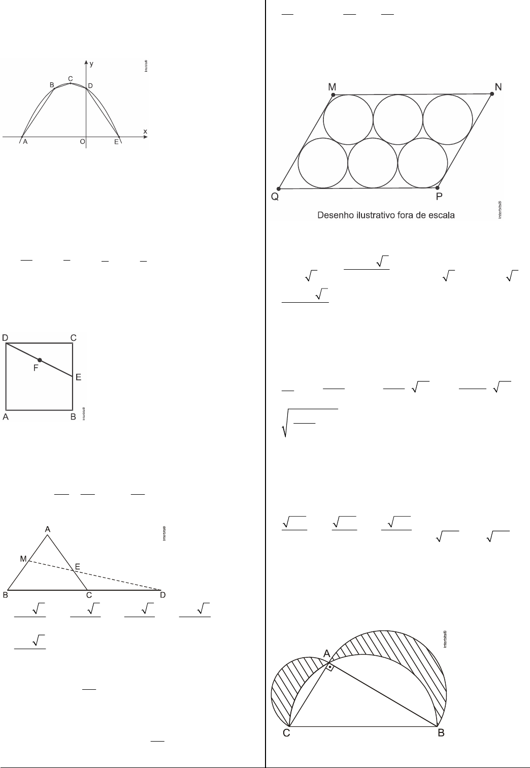 1. (Afa 2017) No plano cartesiano abaixo estão representados o gráfico da função real definida por e o polígono Considere que: - o ponto é vértice da função - os pontos e possuem ordenadas iguais. - as abscissas dos pontos e são raízes da função Pode-se afirmar que a área do polígono em unidades de área, é a) b) c) d) 2. (Espcex 2021) Na figura a seguir, é um quadrado, é o ponto médio de e é o ponto médio de A razão entre as áreas do quadrado e do triângulo nessa ordem, é a) b) c) d) e) 3. (Esc. Naval 2012) O triângulo da figura abaixo é equilátero, e A área do triângulo vale a) b) c) d) e) 4. (Ita 2011/AFA 2015) Sejam ABCD um quadrado e E um ponto sobre . Considere as áreas do quadrado ABCD, do trapézio BEDC e do triângulo ADE. Sabendo que estas áreas definem, na ordem em que estão apresentadas, uma progressão aritmética cuja soma é 200 cm2, a medida do segmento , em cm, é igual a a) b) 5 c) d) e) 10 5. (Espcex 2018) Seis círculos de raio são inseridos no paralelogramo de área de acordo com a figura abaixo. Sabendo-se que os seis círculos são tangentes entre si e com os lados do paralelogramo, a área em é a) b) c) d) e) 6. (Ime 2015) Seja um trapézio retângulo de bases e com diagonais perpendiculares. Determine a área do trapézio. a) b) c) d) e) 7. (Ime 2010) Seja um triângulo de lados , e iguais a 26, 28 e 18, respectivamente. Considere o círculo de centro inscrito nesse triângulo. A distância vale: a) b) c) d) e) 8. (Ime 2011) Seja o triângulo retângulo ABC com os catetos medindo 3 cm e 4 cm. Os diâmetros dos três semicírculos, traçados na figura abaixo, coincidem com os lados do triângulo ABC. A soma das áreas hachuradas, em cm2, é: a) 6 b) 8 c) 10 d) 12 e) 14 9. (Ime 2014) Em um quadrilátero os ângulos e são retos. Considere que e sejam as raízes da equação onde Qual a verdadeira relação satisfeita por e a) b) c) d) e) 10. (Afa 2017) Considere, no triângulo abaixo, os pontos e os segmentos e paralelos, respectivamente, a e Sabendo que e que a área do triângulo é então a área do paralelogramo hachurado, em é igual a a) b) c) d) 11. (Ita 2021) Os vértices da base de um triângulo isóceles PQR, inscrito numa circunferência de centro são e Se o vértice R pertence ao primeiro quadrante, então a área do triângulo PQR é igual a: a) b) c) d) e) 12. (Ita 2016) Sejam uma circunferência de raio e uma corda em de comprimento As tangentes a em P e em Q interceptam-se no ponto R exterior a Então, a área do triângulo em PQR, em é igual a a) b) c) d) e) 13. (Afa 2012) Conforme a figura abaixo, A é o ponto de tangência das circunferências de centros e Sabe-se que os raios dessas circunferências formam uma progressão geométrica crescente. Se os raios das circunferências de centros e medem, respectivamente, 2r e 3r, então a área da região sombreada vale, em unidades de área, a) b) c) d) 14. (Efomm 2020) Sejam a circunferência com centro em e raio e a circunferência que passa por com centro em e raio Sabendo-se que é o ponto médio do segmento é um dos pontos de interseção entre e e é a interseção da reta com a circunferência o valor da área do triângulo em unidades de área é a) b) c) d) e) 15. (Afa 2014) Na figura abaixo, os três círculos têm centro sobre a reta e os dois de maior raio têm centro sobre a circunferência de menor raio. A expressão que fornece o valor da área sombreada é a) b) c) d) 16. (Esc. Naval 2016) A área da região limitada pelos gráficos das funções e é igual a: a) b) c) d) e) Gabarito: Resposta da questão 1: [B] Resposta da questão 2: [D] Observe a figura: Temos que: Logo: Resposta da questão 3: [B] Pelo Teorema de Menelaus, aplicado no triângulo vem Agora, como pela propriedade das proporções, temos Portanto, sabendo que encontramos Resposta da questão 4: [C] Escrevendo a PA temos: (100, 100 – 5x, 5x) Logo, Resposta da questão 5: [E] Na figura, temos é um triângulo equilátero, pois é ponto de tangência entre e logo, é ponto de tangência entre e logo, é ponto de tangência entre e logo, é ponto de tangência entre e logo, é ponto de tangência entre e logo, Como Como e é um retângulo, logo, Analogamente, portanto, Os triângulos e são congruentes, pelo caso LAL, logo, No triângulo Os triângulos e são congruentes, pelo caso LAL, logo, No triângulo Assim, temos: Resposta da questão 6: [C] Desenhando o trapézio com os dados do enunciado, tem-se: Por semelhança de triângulos, pode-se escrever: Resposta da questão 7: [D] Área do triângulo: A A = Aplicando o teorema de Pitágoras, temos: Resposta da questão 8: [A] é a área da região que se obtém subtraindo a área do triângulo ABC da área do semicírculo de diâmetro BC. é a área do semicírculo de diâmetro 3cm e é a área do semicírculo de diâmetro 4cm. que é a área pedida. Logo: Resposta da questão 9: [E] Como e são raízes da equação podemos escrever: Resposta da questão 10: [B] Calculando: Resposta da questão 11: [E] Raio da circunferência: Seja o ponto médio do segmento temos que: Temos a figura: Logo, a área do triângulo vale: Resposta da questão 12: [E] No triângulo temos: Logo, a área do triângulo será dada por: Resposta da questão 13: [C] A razão da P.G. formada pelos raios será dada por portanto o raio da terceira circunferência será Calculando agora as áreas assinaladas A1 e A2: A = A1+ A2 Resposta da questão 14: [C] Do enunciado, segue a seguinte figura: Como é ponto médio de os triângulos e são equivalentes. O mesmo vale para os triângulos e Logo, os triângulos é equivalente ao triângulo Daí, Note que é um ângulo inscrito de medida igual a logo, a medida do arco é Assim, Daí, Então, Note que: No triângulo Daí, Portanto, Como os triângulos e são equivalentes, Resposta da questão 15: [D] A área hachurada será igual a área de uma circunferência maior (raio somada à área da “lua” remanescente da out