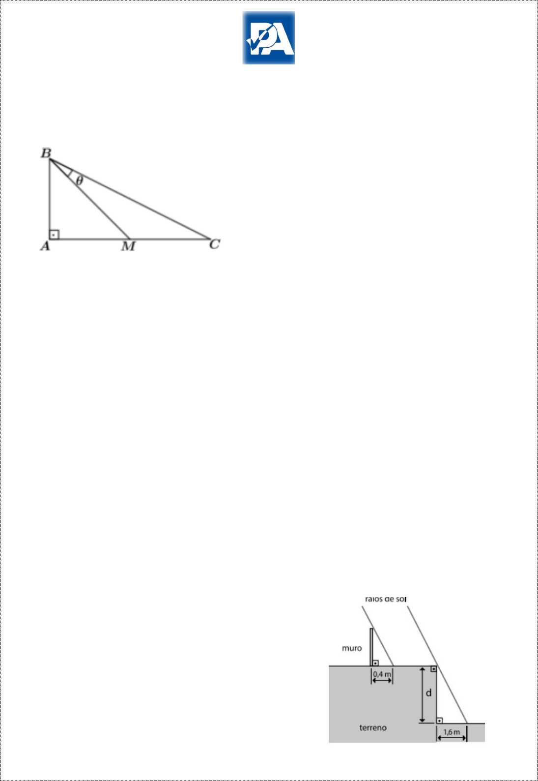 DESAFIO DO MAIOR Matemática LISTA 39 01. (UNICAMP 2020) A figura abaixo exibe o triângulo retângulo ABC, em que AB = AM = MC. Então, tg θ é igual a: a) 1/2. b) 1/3. c) 1/4. d) 1/5. 02. (UNICAMP 2014) O perímetro de um triângulo retângulo é igual a 6,0 m e as medidas dos lados estão em progressão aritmética (PA). A área desse triângulo é igual a: a) 3,0 m . b) 2,0 m . c) 1,5 m . d) 3,5 m . 03. (ACAFE 2014) O centro de zoonoses de uma grande cidade detectou, em 2012, uma grande incidência de duas doenças entre os cães: parvovirose e cinomose. Foram registrados 146 casos de parvovirose, o que corresponde a 36,5 casos a cada grupo de 500 cães. E em relação à cinomose, foram 52 casos para cada grupo de 1000 cães. Analise as proposições abaixo e classifique-as em V - verdadeiras ou F - falsas. ( ) O total de casos de cinomose foi de 104. ( ) 7,3% dos cães estavam com parvovirose. ( ) O centro de zoonoses abrigou, no total, 1500 cães. ( ) O centro de zoonoses esteve com 250 cães doentes. A sequência correta, de cima para baixo, é: a) V - F - F - V. b) V - V - V - F. c) V - V - F - V. d) F - V - V - F. 04. (UFRGS) A massa das medalhas olímpicas de Londres 2012 está entre 375 g e 400 g. Uma medalha de ouro contém 92,5% de prata e 1,34% de ouro, com o restante em cobre. Nessa olimpíada, os Estados Unidos ganharam 46 medalhas de ouro. Supondo que todas as medalhas de ouro obtidas pelos atletas estadunidenses tinham a massa máxima, a quantidade de ouro que esses atletas ganharam em conjunto: a) é menor do que 0,3 kg. b) está entre 0,3 kg e 0,5 kg. c) está entre 0,5 kg e 1 kg. d) está entre 1 kg e 2 kg. e) é maior do que 2 kg. 05. (ETEC 2019) Sem dispor de uma trena de comprimento suficiente, um pedreiro determinou a medida do desnível (d) de um terreno, valendo-se da propriedade da propagação retilínea da luz. Observou que, em determinado momento do dia, um muro vertical de 1,5 m de altura, construído na parte alta do terreno, projetava uma sombra de 0,4 m sobre a parte superior do terreno, que era plana e horizontal. No mesmo instante, o desnível do terreno projetava sobre a parte mais baixa, igualmente horizontal, uma sombra de 1,6 m, conforme a figura. DESAFIO DO MAIOR Matemática LISTA 39 Com suas observações, foi capaz de deduzir corretamente que o desnível do terreno era de: a) 6,0 m. b) 8,0 m. c) 10,0 m. d) 12,0 m. e) 14,0 m. DESAFIO DO MAIOR Matemática LISTA 39 GABARITO 1 – B 2 - C 3 – C 4 – A 5 – A