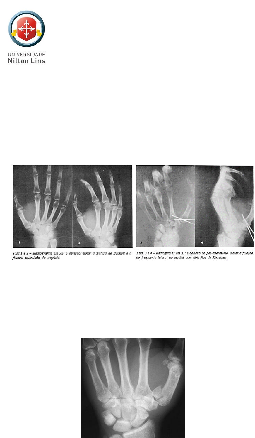 Universidade Nilton Lins Faculdade de Medicina Disciplina: Saúde do Adulto I – Abordagem Clínico Cirúrgica do Sistema Osteoarticular / Ortopedia Professora: Sandra Fachinello Aluna: Clarisse Nunes de Carvalho Turma: MP 13 Matrícula: 17012742 Fratura de Bennett Refere-se a fratura intra-articular da base do primeiro metacarpo. É a segunda fratura de metacarpos mais comum. O mecanismo da fratura é um trauma do polegar em semiflexão, onde o metacarpo fica preso ao trapézio somente pelo ligamento volar. O quadro clínico é de dor e tumefação na base do polegar. Radiografias em AP, lateral e oblíqua confirmam o diagnóstico. O tratamento é feito com redução e fixação interna com fios de Kirschner. Fratura de Rolando Também refere-se a uma fratura intra-articular da base do primeiro metacarpo, mas é do tipo cominutiva em ‘’T ‘’ou ‘’Y’’. É uma fratura rara, de difícil tratamento e prognóstico ruim. O tratamento é a redução cirúrgica e fixação dos fragmentos com fios de Kirschner, após isso é feita a imobilização por 4 semanas.