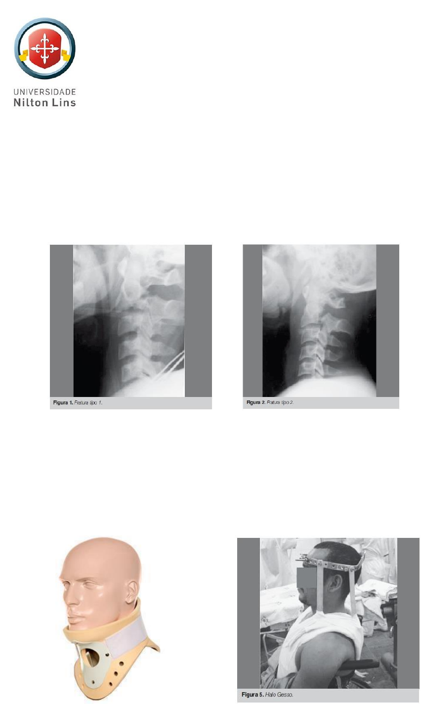 Universidade Nilton Lins Faculdade de Medicina Disciplina: Saúde do Adulto I – Abordagem Clínico Cirúrgica do Sistema Osteoarticular / Ortopedia Professora: Sandra Fachinello Aluna: Clarisse Nunes de Carvalho Turma: MP 13 Matrícula: 17012742 Fratura do enforcado Também conhecida como espondilolistese de C2, a fratura do enforcado é um trauma por hiperextensão cervical, onde a corda arranca o corpo do áxis do corpo de C3 enquanto ocorre a hiperextensão dos pedículos do áxis. Com a fratura dos pedículos, ocorre um deslizamento anterior do corpo vertebral sobre C3. O diagnóstico é confirmado com a radiografia da coluna cervical em incidência lateral e tomografia. De acordo com Levine e Edwards pode ser classificada em: Tipo I. Carga axial e hiperextensão; Tipo II. Carga axial e hiperextensão associada com grande flexão; Tipo IIa. Flexão-distração, mínimo ou nenhum deslocamento com grande angulação e Tipo III. Flexão-compressão. Quando a fratura não é desviada ou possui desvio de até 3 mm o tratamento é feito com o colar do tipo Philadelphia. Se houver um desvio maior, deve ser feita a redução da fratura e imobilização com halogesso ou halovest. O tratamento cirúrgico é feito quando há falha no tratamento conservador feito durante 3 meses ou nos casos de fratura Levine-Edwards tipo IIa e III.