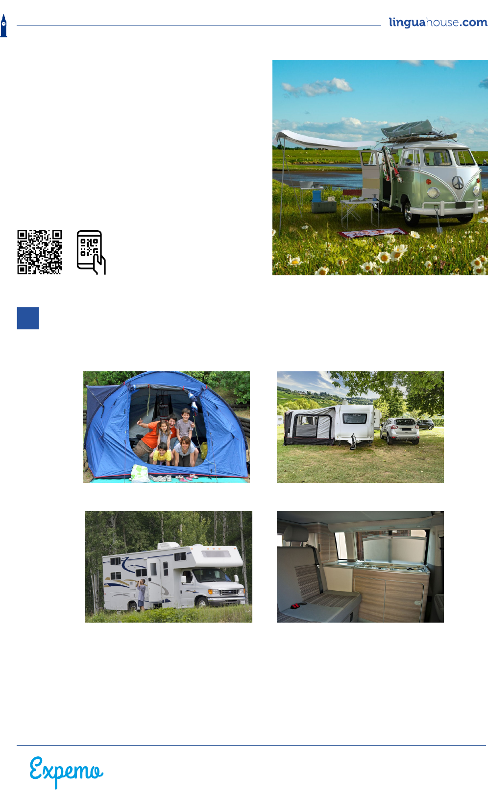 GENERAL ENGLISH · GENERAL ISSUES · UPPER-INTERMEDIATE (B2-C1) HEAAADERLOGORIGHT VAN LIFE QrrkoD Scan to review worksheet Expemo code: 14P9-6499-UX5 1 Warm up Look at the pictures and answer the questions. tent caravan motorhome camper van 1. Do you like camping? 2. Have you ever camped in one of these? 3. What are some advantages and disadvantages of each type of camping accommodation? FOOOOTERRIGHT 1/5Learn without forgetting! Scan the QR at the top of Page 1 to review the lesson flashcards with Expemo. © Linguahouse.com. Photocopiable and licensed for use in Núbia Cristina Da Silva's lessons. UPPER-INTERMEDIATE (B2-C1) VAN LIFE HEAAADERLOGORIGHT 2 Listening Fern is at a music festival. Listen to her conversation with Steve and decide if the information in the sentences is true, false or not given. 1. Steve and Fern planned to meet up at the festival. 2. Steve’s camper van has a name. 3. The kitchen has three appliances. 4. Steve sleeps in the back of the van. 5. Steve paid over £3,000 for his camper van. 6. Fern is jealous. Listen again and write the missing words in the gaps. 1. We wanted her to be easily , so we could find her, even in the dark. 2. And the table is , so we only get it out when we want to eat. 3. The roof is . It pops up to make a sleeping area. 4. The basic van is , so you can choose the features and layout that you want. 5. It’s true that some classic models of the VW Transporter are very , which pushes the price up. 6. But Ronnie was more than you’d think. Answer these questions: 1. What’s the same about all of these words? 2. How do we use this ending and what does it mean? Think of more examples for each of these things. 1. situations where people need to be adaptable 2. items of clothing which are adjustable 3. things that are not affordable for you right now 4. small things that are highly collectable 5. people who are instantly recognisable (and why) 6. more features of a camper van which could be removable FOOOOTERLEFT 2/5Learn without forgetting! Scan the QR at the top of Page 1 to review the lesson flashcards with Expemo. © Linguahouse.com. Photocopiable and licensed for use in Núbia Cristina Da Silva's lessons. UPPER-INTERMEDIATE (B2-C1) VAN LIFE HEAAADERLOGORIGHT 3 Reading Steve’s camper van Ronnie is a VW Transporter. What do you know about this type of vehicle? Read the article about this design classic and then finish the sentences below with exactly three words from the text. 1. Being collectable is one thing that makes the VW camper van 1 . 2. The Transporter was so adaptable that 2 vehicles could be produced from the same basic design. 3. The 3 , 4 and 5 are three things which made the original Transporters instantly recognisable. 4. 6 , the Transporter camper van became very popular because it was so affordable. 5. The newest VW camper van retains classic features like adjustable seats, but also uses modern technology, like a removable tablet computer to 7 . Read the text again and match the words/phrases with these meanings. 1. (Paragraph 2) using an engine to move around 2. (Paragraph 2) quickly drew a picture of something 3. (Paragraph 2) made something as large as possible 4. (Paragraph 2) goods that are carried in a van, truck, plane or ship 5. (Paragraph 2) the system attached to the wheels of a vehicle that makes it more comfortable to travel in 6. (Paragraph 4) happened at the same time as another event 7. (Paragraph 4) changed or added something to make it relate strongly to one person or their needs 8. (Paragraph 4) very famous and easily recognisable, representing a particular time or place 9. (Paragraph 7) easily seen or noticed Now answer these questions: 1. What ending do three of the words share? 2. What does this ending mean? 3. How are these forms normally spelled in American English? Can you think of any other words with this ending? FOOOOTERRIGHT 3/5Learn without forgetting! Scan the QR at the top of Page 1 to review the lesson flashcards with Expemo. © Linguahouse.com. Photocopiable and licensed for use in Núbia Cristina Da Silva's lessons. UPPER-INTERMEDIATE (B2-C1) VAN LIFE HEAAADERLOGORIGHT The VW Transporter camper van A design classic 1. The Fender Stratocaster guitar, the Coca-Cola bottle and the VW Transporter - what do these things have in common? Each one is a design classic, which means they share certain features. We recognise them immediately, they’ve been around for ages, their design is innovative and functional, they reflect popular culture and they’re even collectable. Let’s take a closer look at the VW Transporter. 2. The VW Transporter was developed just after the Second World War. The story has it that Dutch businessman Ben Pons was visiting the Volkswagen factory when he saw some little motorised trolleys being used to transport items around. He had a Eureka moment, and sketched an idea for a transport vehicle. His clever flat-front design maximised cargo space and was easy to steer around the small crowded streets of European cities. The air-cooled engine was at the back, so the driver had more space and less noise and heat at the front. In addition, each of the four wheels had independent suspension, which produced a smoother ride than other vehicles at the time. 3. The Transporter was designed to be adaptable and the company was soon producing a range of vehicles including delivery vans, buses, pick-ups, ambulances, fire engines and, of course, the well-loved camper van. These vehicles were instantly recognisable by the split frontwindscreen, the two-tone paint and the famous VW logo badge at the front. By 1968, two million vehicles had been sold. 4. The popularity of the Transporter camper van coincided with the development of the counter- cultural movement in the 1960s. The vehicles were affordable to run and could be customised and adapted for many uses including full-time homes. They quickly became iconic of the freedom-loving independent-thinking hippie lifestyle. 5. The Trans