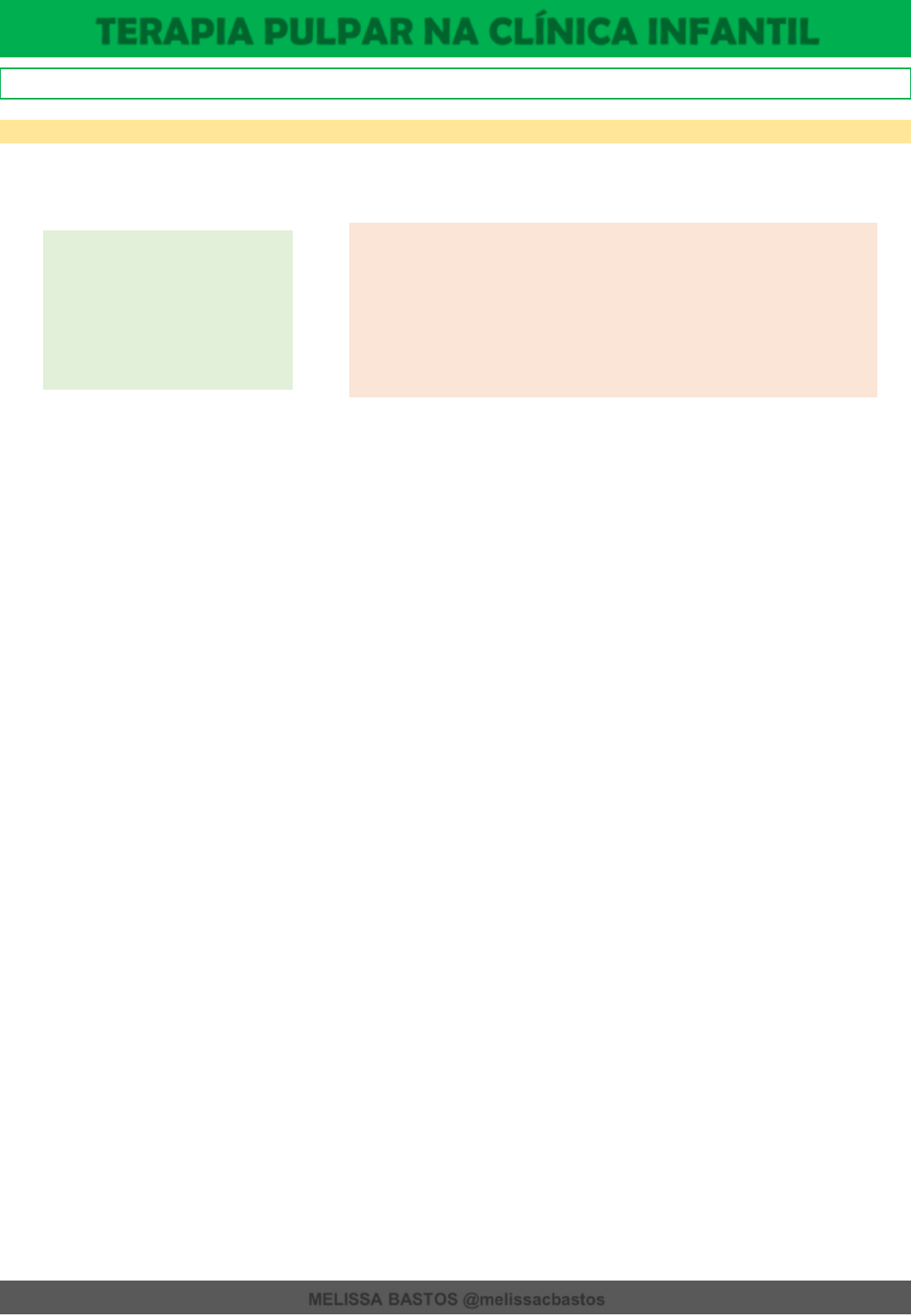 TERAPIA PULPAR NA CLÍNICA INFANTIL TERAPIA PULPAR RADICAL PULPOTOMIA ▪ Tratamento endodôntico conservador, que consiste na remoção do tecido pulpar coronário inflamado, com o objetivo de manter a integridade da polpa radicular ▪ Materiais de vedamento: Formocresol, OZE, Glutaraldeido, Pasta guedes pinto, Vitapex, Pasta callen, MTA, Pasta CTZ ▪ Solução irrigadora: clorexidina ou soro fisiológico ▪ Formocresol: Formocresol é o mais utilizado! Tem o objetivo de fixa o tecido pulpar Composição: formaldeído 19% + cresol 35% + agua (diluição de 1:5 em 3 partes de glicerina e 1 parte de água) Formaldeído: ação bactericida Cresol: ação antisséptica Desvitalização pulpar ou curativo para a neutralização Não é biológico, pois não ocorre reparação pulpar → reação inflamatória severa Dificil controle da penetração Aplicado na entrada dos canais através de uma bolinha de algodão ▪ Passo a passo: 0. Anestesia + Isolar + Remover tecido cariado + Remoção do teto da câmara pulpar 1. Remover a polpa da câmara pulpar (com curetas de dentina) 2. Fazer irrigação com soro fisiológico ou clorexidina e secar com bolinha de algodão estéril 3. Aplicar o formocresol em bolinha de algodão, deixar agir na câmara pulpar por 5 minutos (ou otosporin) 4. Remover o formocresol e observar se ocorreu a fixação tecidual (parou o sangramento) 5. Colocar o cimento de obturação definitivo (OZE ou MTA ou Pasta guedes-pinto) 6. Restauração em CIV e Resina (de preferencia na mesma sessão, evitando contaminação) ▪ Óxido de Zinco: Ação anti-séptica, secativa e antiinflamatoria Não apresentando efeitos tóxicos ou adversos conhecidos Promovendo degradação do colágeno nos tecidos necróticos Efeito positivo na cicatrização Usar o Oxido de zinco puro, não usar o IRM Boa taxa de reabsorção (ideal para dentes decíduos) MELISSA BASTOS @melissacbastos INDICAÇÕES: ✓ Exposição pulpar acidental, momentânea ✓ Tecido pulpar consistente ✓ Sangramento vermelho vivo CONTRA-INDICAÇÕES: ✓ Dentes com dores espontâneas que não cessam com medicação ✓ Impossibilidade de posterior restauração ✓ Presença de fistula e lesões periodontais ✓ Dente com mobilidade ✓ Mais de 2/3 da raiz reabsorvido TERAPIA PULPAR NA CLÍNICA INFANTIL TERAPIA PULPAR RADICAL PULPOTOMIA ▪ Hidróxido de Cálcio: Pastas a base de hidróxido de cálcio (hca PA + soro fisiológico) ou Pasta Calllen Material mais biocompatível pH altamente alcalino Não causa alteração de cor Induz a formação dentinaria Propriedades antibacterianas Regeneração pulpar Reduz processo inflamatório Vasoconstritor capilar Processo de mineralização ▪ Pastas Iodoformadas: Vitapex, Feapex* (genérico), Pasta guedes pinto Vitapex e Feapex tem ainda Hca em sua composição Iodoformio como base → pó amarelado ▪ Pasta Guedes Pinto Iodofórmio: antisséptico e antimicrobiano PMCC: antimicrobiano / ação bacteriostática e bactericida e alta citotoxicidade Rifocort (rifamicina): antibiótico + corticosteroide (prednisolona) → tentativa de troca-lo pelo omcilon (em pesquisa) Era o material mais utilizado nas universidades brasileiros Vantagens: ação antisséptica, boa tolerância tecidual, moderada reação inflamatória, reabsorvível, radiopaco e de fácil remoção ▪ MTA: Não precisa de um campo totalmente seco Promove mineralização Desvantagem: tempo de presa muito longo ▪ Pasta CTZ: Clorofenicol – 500mg + Tetraciclina – 500mg + OZE (1:1:1) Triturados com pistilo + Acrescentar 1 gota de eugenol Técnica cheia de controvérsias Usada em casos de comprometimento pulpar maior MELISSA BASTOS @melissacbastos Quando considerar a exodontia como opção de tratamento: ✓ O processo infeccioso não puder ser paralisado pelos tratamentos de terapia pulpar ✓ Tecido ósseo não pode ser restabelecido ✓ Estrutura dental é insuficiente para o tratamento restaurador ✓ Reabsorção radicular avançada TERAPIA PULPAR NA CLÍNICA INFANTIL TERAPIA PULPAR RADICAL PULPECTOMIA ▪ Técnica de tratamento do canal radicular ▪ Tratamento que realiza a remoção de toda a polpa coronária e radicular ▪ Instrumentação dos canais radiculares ▪ Uso de susbtancias que facilitem a remoção da smear layer ▪ Obturação com pastas reabsorvíveis ▪ CUIDADO: Reabsorção radicular do dente decíduo é irregular ▪ CUIDADO: Proximidade com o germe do dente permanente na hora da instrumentação ▪ Bipulpectomia: tecido com alguma vitalidade ▪ Necropulpectomia: tecido totalmente destruído ▪ Materiais de vedamento: OZE, Glutaraldeido, Pasta guedes pinto, Vitapex, Pasta callen, Pasta CTZ, MTA (exceto formocresol) ▪ Solução irrigadora: hipoclorito de sódio 0,5% ou 1% ou 2,5% ▪ Passo a passo: 0. Anestesia + Isolar + Remover tecido cariado 1. Remoção do tecido pulpar (coronário e radicular) 2. Realização da odontometria (recuo de 1-2 mm, CR-2mm) pelo raio-x ou localizador 3. Realização do acesso endodôntico (pontas esféricas diamantadas) 4. Limpeza da câmara pulpar com curetas de dentina 5. Irrigação com hipoclorito ou clorexidina 6. Prepar a entrada do canal com brocas Gattes 1 e 2 7. Instrumentação (manual ou mecânica) – basta utilizar 3 limas (ex: #15 que trava + #20 + #25, nem precisa de recuo) 8. Manual iniciar com lima tipo Kerr compatível com o tamanho do canal, seguida de mais duas limas (#15, #20, #25) 9. Obturação MELISSA BASTOS @melissacbastos INDICAÇÕES: ✓ Pulpite intensa ✓ Inflamção crônica irreversível ✓ Necrose ou exudado dos canais radiculares ✓ Dentes com hemorragias intensas ✓ Exposição pulpar já ocorrida (criança já chega com essa exposição) ✓ Presença de: fistula e lesões periodontais (mas com a cripta ok) ✓ Tecido pulpar desorganizado ✓ Sangramento escurecido PRÉ-REQUISITSO PARA A PULPECTOMIA EM DECÍDUOS: ✓ Dente deve ter integridade da cripta óssea ✓ Integridade da furca ✓ O dente deve ter