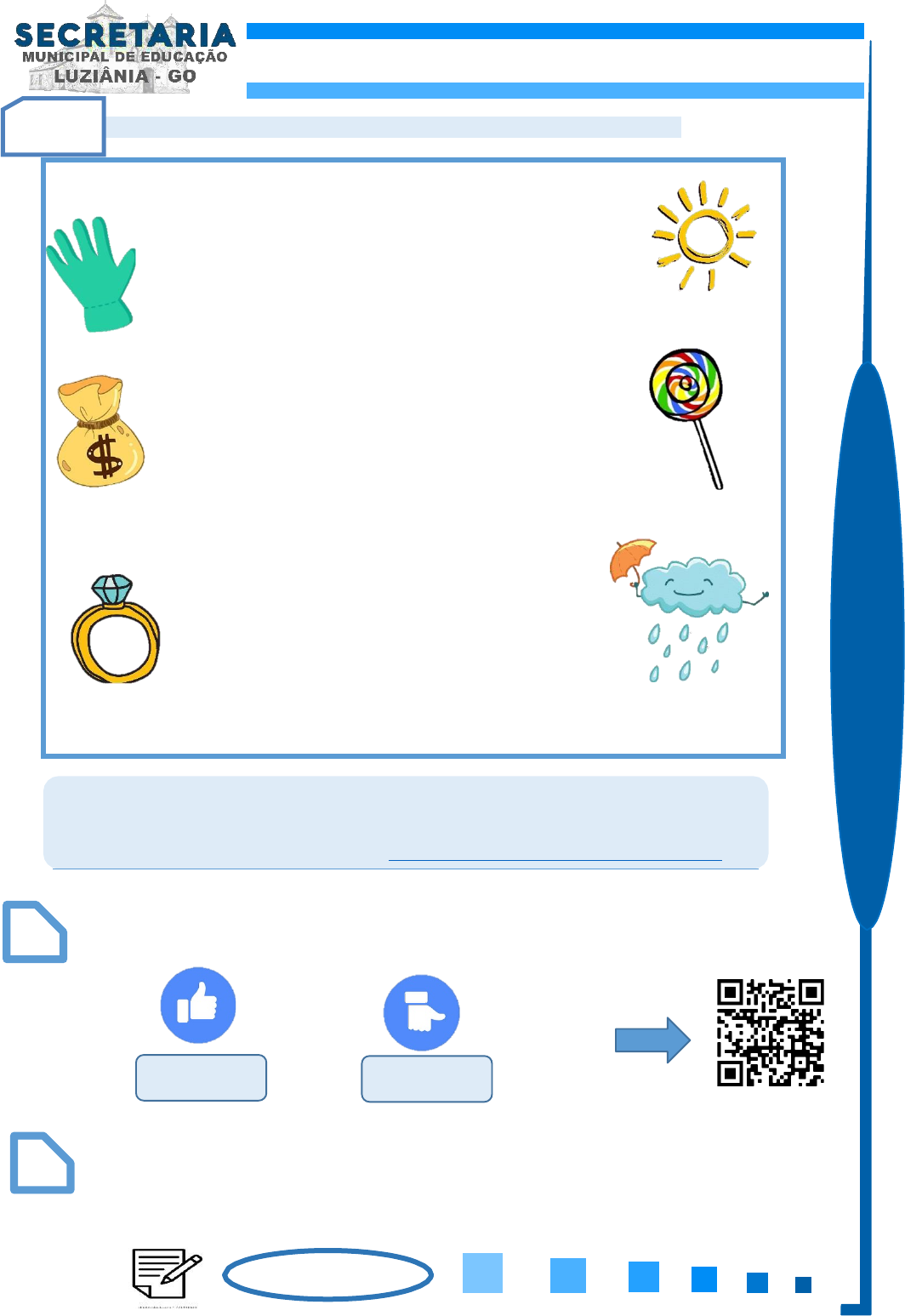 OU ISTO OU AQUILO É UM DOS MAIS BELOS E IMPORTANTES LIVROS DE POESIA PARA CRIANÇA. OS POEMAS FALAM DOS SONHOS E FANTASIAS QUE POVOAM O MUNDO INFANTIL. A CASA DA AVÓ, OS JOGOS E BRINQUEDOS, OS ANJOS, ANIMAIS E FLORES GANHAM VIDA NOS POEMAS SUAVES E MUSICAIS DE CECÍLIA MEIRELES. https://educacao.saobernardo.sp.gov.br/index.php/aula-online-fase2/infantil-4-fase2/2531-ou-isto-ou-aquilo-2.ht m l CURTIU NÃO CURTIU VOCÊ PODE REALIZAR ESSA ATIVIDADE EM SEU CADERNO. 04 MATERIAL DE APOIO REMOTO – ENS. FUNDAMENTAL AH! AS POESIAS, LINDAS,, SIMPLES E ENCANTADORAS! POEMA: OU ISTO OU AQUILO - (CECÍLIA MEIRELES) OU SE TEM CHUVA E NÃO SE TEM SOL, OU SE TEM SOL E NÃO SE TEM CHUVA! OU SE CALÇA A LUVA E NÃO SE PÕE O ANEL, OU SE PÕE O ANEL E NÃO SE CALÇA A LUVA! QUEM SOBE NOS ARES NÃO FICA NO CHÃO, QUEM FICA NO CHÃO NÃO SOBE NOS ARES. É UMA GRANDE PENA QUE NÃO SE POSSA ESTAR AO MESMO TEMPO NOS DOIS LUGARES! OU GUARDO O DINHEIRO E NÃO COMPRO O DOCE, OU COMPRO DOCE E GASTO O DINHEIRO. OU ISTO OU AQUILO: OU ISTO OU AQUILO... E VIVO ESCOLHENDO O DIA INTEIRO! NÃO SEI SE BRINCO, NÃO SEI SE ESTUDO, SE SAIO CORRENDO OU FICO TRANQUILO. MAS NÃO CONSEGUI ENTENDER AINDA QUAL É MELHOR: SE É ISTO OU AQUILO O QUE VOCÊ ACHOU DO TEXTO “OU ISTO OU AQUILO” PINTE SE VOCÊ CURTIU OU NÃO. PROCURE NO TEXTO E CIRCULE AS PALAVRAS ANEL, CHUVA, SOL, DOCE, DINHEIRO.. 8 9 2 ° SEM ESTR E/1 ° A N O 2º DIA https://educacao.saobernardo.sp.gov.br/index.php/aula-online-fase2/infantil-4-fase2/2531-ou-isto-ou-aquilo-2.ht NOME DA AUTORA TÍTULO ILUSTRADOR ILUSTRAÇÕES ODILON MORAES QUAL É O NOME DA EDITORA? global VOCÊ PODE REALIZAR ESSA ATIVIDADE EM SEU CADERNO. 05 MATERIAL DE APOIO REMOTO – ENS. FUNDAMENTAL PINTE O ESPAÇO ENTRE AS PALAVRAS DO TRECHO DO TEXTO “OU ISTO OU AQUILO” E REESCREVA COLOCANDO CADA PALAVRA NO QUADRINHO ABAIXO. OBSERVE A CAPA DO LIVRO E RESPONDA O QUE SE PEDE. LEIA O TRECHO DO POEMA E COMPLETE. OU SE TEM E NÃO SE TEM , OU SE TEM E NÃO SE TEM ! OU SE A LUVA E NÃO SE O ANEL OU SE O ANEL E NÃO SE A LUVA! QUEM SOBE NOS NÃO FICA NO , QUEM FICA NO NÃO SOBE NOS . Continuando ... OU NÃOSEISEBRINCO,NÃOSEISEESTUDO 10 11 QUAL É A IMAGEM QUE APARECE NA CAPA 12 VAMOS BRINCAR DO CONTRÁRIO? DIA NOITE 2 ° SEM ESTR E/1 ° A N O 2º DIA TARDE: ALMOÇAR, ESCOVAR OS DENTES , ESTUDAR. BRINCAR EM CASA OU NA CASA DE UM AMIGO, LEVAR O CACHORRO PARA PASSEAR ETC. MANHÃ: ESCOVAR OS DENTES, TOMAR CAFÉ DA MANHÃ, IR PARA A ESCOLA OU BRINCAR , ETC). DE MANHÃ DE TARDE VOCÊ PODE REALIZAR ESSA ATIVIDADE EM SEU CADERNO. 06 MATERIAL DE APOIO REMOTO – ENS. FUNDAMENTAL NO DIA A DIA TEMOS HÁBITOS QUE PODEM SER COMUNS OU DIFERENTES DE UMA FAMÍLIA PARA OUTRA. POR EXEMPLO , HÁBITOS COMUNS REALIZADOS DE: AGORA, ORGANIZE SUA ROTINA DIÁRIA, SE PRECISAR, PEÇA AJUDA DE ALGUÉM DA FAMÍLIA. ESCREVA EM CADA ESPAÇO O QUE VOCÊ FAZ NOS SEGUINTES PERÍODOS: NOITE: LER UM LIVRO, JANTAR, TOMAR BANHO, FAZER ORAÇÃO, DORMIR, ETC. 13 RELEMBRando os dias da SEMANA A SEMANA TEM 7 DIAS DOMINGO SEGUNDA-FEIRA TERÇA-FEIRA QUARTA-FEIRA SEXTA-FEIRA QUINTA-FEIRA SÁBADO A NOITE 2 ° SEM ESTR E/1 ° A N O 2º DIA