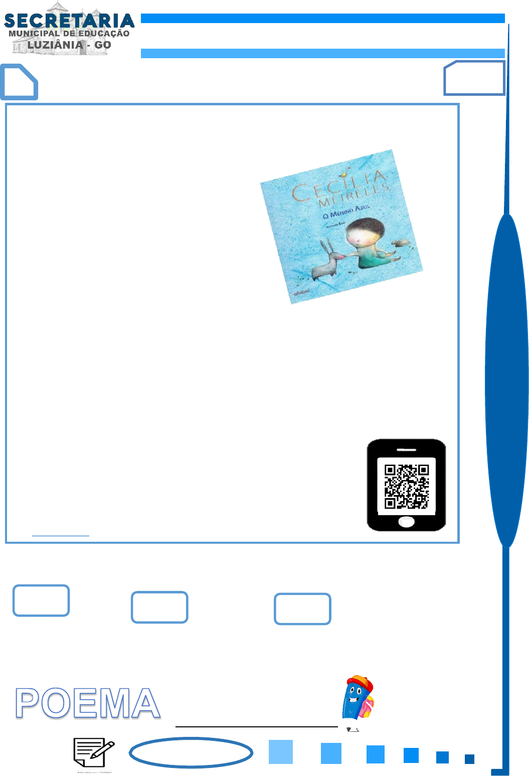 MATERIAL DE APOIO REMOTO – ENS. FUNDAMENTAL 14 LEIA O TEXTO ABAIXO. O MENINO AZUL O MENINO QUER UM BURRINHO PARA PASSEAR. UM BURRINHO MANSO, QUE NÃO CORRA NEM PULE, MAS QUE SAIBA CONVERSAR. O MENINO QUER UM BURRINHO QUE SAIBA DIZER O NOME DOS RIOS, DAS MONTANHAS, DAS FLORES, — DE TUDO O QUE APARECER. O MENINO QUER UM BURRINHO QUE SAIBA INVENTAR HISTÓRIAS BONITAS COM PESSOAS E BICHOS E COM BARQUINHOS NO MAR. E OS DOIS SAIRÃO PELO MUNDO QUE É COMO UM JARDIM APENAS MAIS LARGO E TALVEZ MAIS COMPRIDO E QUE NÃO TENHA FIM. (QUEM SOUBER DE UM BURRINHO DESSES, PODE ESCREVER PARA A RUAS DAS CASAS, NÚMERO DAS PORTAS, AO MENINO AZUL QUE NÃO SABE LER.) Cecília Meireles PROCURE NO SEU CELULAR UM APLICATIVO LEITOR DE QR CODE E MIRE NO CÓDIGO E CONHEÇA A POESIA O MENINO AZUL. O TEXTO QUE VOCÊ ACABOU DE LER É: CARTA POEMA FÁBULA ➢ PINTE A PRIMEIRA E A ÚLTIMA LETRA DO TEXTO. LEIA A PALAVRA ABAIXO E DESCUBRA QUAL É A PALAVRA ESCONDIDA. 07 VOCÊ PODE REALIZAR ESSA ATIVIDADE EM SEU CADERNO. 2 ° SEM ESTR E/1 ° A N O 3º DIA https://www.pensador.com/autor/cecilia_meireles/ 15 TEXTO. O MENINO QUER UM BURRINHO... QUE SAIBA COMER QUE SAIBA INVENTAR HISTÓRIAS QUE SAIBA CANTAR O MENINO COMPARA O MUNDO COM: JARDIM PARAISO CASTELO VOCÊ PODE REALIZAR ESSA ATIVIDADE EM SEU CADERNO. 08 MATERIAL DE APOIO REMOTO – ENS. FUNDAMENTAL MARQUE COM UM X AS OPÇÕES CORRETAS DE ACORDO COM O SENTIDO DO REESCREVA A 3° ESTROFE E NO QUADRO ABAIXO. DEPOIS, RESPONDA AS QUESTÕES AO LADO. RETIRE DA ESTROFE UMA PALAVRA COM : UMA SÍLABA: DUAS SÍLABAS: TRÊS SÍLABAS ➢ RETIRE A PALAVRA ESCRITA COM SS ➢ RETIRE AS PALAVRAS ESCRITAS COM NH O ENDEREÇO DO MENINO É: RUA BELA VISTA RUA DA ALEGRIA RUA DAS CASAS O MENINO AZUL: SABE LER SABE ESCREVER NÃO SABE LER 16 3° ESTROFE 2 ° SEM ESTR E/1 ° A N O