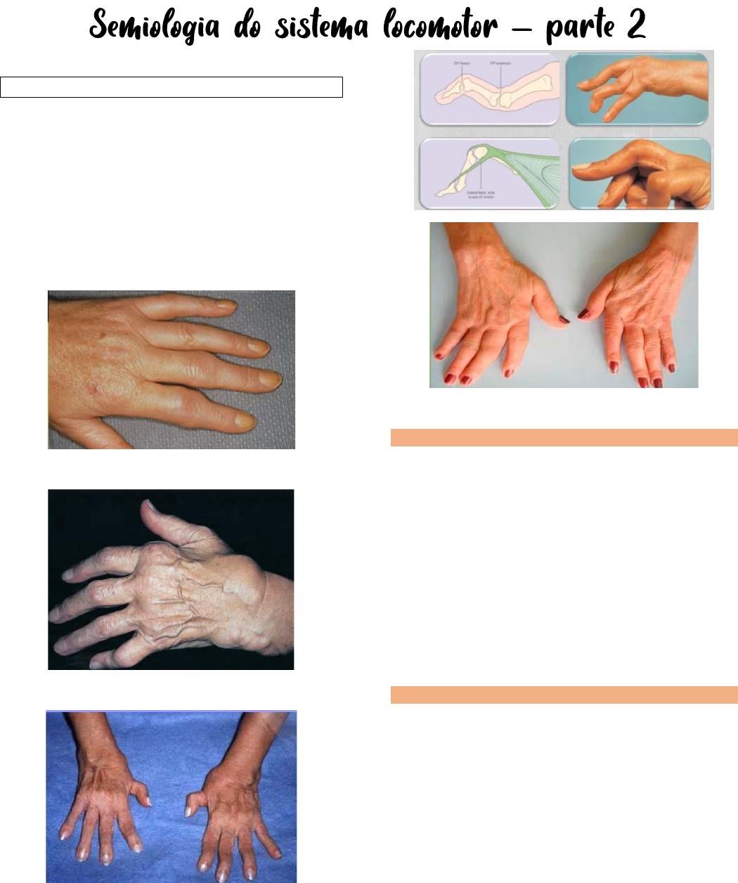 MARIA GABRIELA CALAÇA DE ARAÚJO – SEMIOLOGIA II 1 A dor de origem mecânica melhora com o repouso, enquanto a dor de origem inflamatória melhora com o movimento. Na osteoartrite a dor é de origem mecânica. Na artrite reumatoide o paciente tem acometimento das articulações interfalangeanas proximais, presença de dor e edema → ao descrever no prontuário, sempre colocar o local da alteração e qual a alteração Acometimento das articulações interfalangeanas proximais Mão em dorso de camelo – mão reumatoide Polegar em Z; dedo em pescoço de cisne (2º e 3º quirodáctilos) Os dedos em pescoço de cisne são decorrentes de uma hiperextensão das interfalangeanas proximais e hiperflexão das interfalangeanas distais. O dedo em botoeira é uma hiperflexão da interfalangeana proximal e hiperextensão da interfalangeana distal. Desvio ulnar dos dedos COMPROMETIMENTO ARTICULAR Artrite reumatoide – comprometimento das interfalangeanas proximais e das articulações metacarpofalangeanas, sem comprometimento importante da coluna vertebral, mas quando acomete, tem predileção pela coluna cervical. Além disso, pode comprometer ombros, joelhos, cotovelos, tornozelos e quadril. Tende a ser uma artrite simétrica. Acometimento de interfalangeana distal – osteoartrite, artrite psoriásica OBS: para a artrite ser simétrica nas mãos, não precisa acometer as mesmas articulações. EXAMES COMPLEMENTARES • Hemograma: anemia de doença crônica, trombocitose • VHS e proteína C reativa • Autoanticorpos: FR (Fator Reumatoide) e anti-CCP • Líquido sinovial inflamatório • Excluir HIV, hepatite B e C • Excluir Hipotireoidismo • Excluir síndromes paraneoplásicas • No Brasil: excluir Chikungunya, Zika e dengue Sempre que pedir prova de atividade inflamatória – VHS, proteína C reativa. Na artrite reumatoide o VHS e a proteína C reativa estão elevados. O anti-CCP é mais sugestivo de artrite reumatoide. ARTRITE REUMATOIDE MARIA GABRIELA CALAÇA DE ARAÚJO – SEMIOLOGIA II 2 Na osteoartrite tem inflamação local, o VHS e a proteína C reativa normalmente não estão alterados ou estão pouco elevados. A síndrome paraneoplásicas geralmente é pensada quando se tem idosos que nunca teve dor nas articulações anteriormente e aparece com artrite de início súbito sem nenhuma outra razão que justifique a dor articular. DIAGNÓSITCO DIFERENCIAL A artrite reumatoide também pode apresentar-se com outros padrões de artrite. As artrites inflamatórias são aquelas que tem inflamação sistêmica, os sinais são mais exuberantes (mais edema, calor, rubor), febre, astenia, perda de peso. As artrites não-inflamatórias são aquelas que tem inflamação local. • Aguda < 6 semanas de duração • Crônica > 6 semanas de duração PADRÕES DE ARTRITE ✓ Mono, oligo (2 a 4 articulações) ou poliartrite (>4 articulações) ✓ Aguda (< 6 semanas) ou crônica ✓ Simétrica ou assimétrica ✓ Axial (coluna vertebral e articulações localizadas no centro: sacroilíaca, esternoclavicular, manubrioesternal) e/ou periférica ✓ Sequência: padrão aditivo, migratório e intermitente O padrão intermitente o paciente tem acometimento sempre da mesma articulação, a dor aparece, some e reaparece novamente – exemplo: gota. o MONOARTRITE Aguda: Crônica: o OLIGOARTRITE Aguda: Crônica: MARIA GABRIELA CALAÇA DE ARAÚJO – SEMIOLOGIA II 3 o POLIARTRITE Aguda: Crônica: CRITÉRIOS CLASSIFICATÓRIOS 1987: 2010: OSTEOARTRITE Mãos: IFD E IFP (nódulos de Heberden e Bouchard) • Nódulos de Heberden – interfalangeanas distais • Nódulos de Bouchard – interfalangeanas proximais Clínica: dor (principal sintoma; mecânica), rigidez matinal fugaz, deformidades, limitação funcional, crepitação, sinais inflamatórios pouco evidentes Mais comum após 50 anos Exames laboratoriais: pouco valor Acometimento das articulações interfalangeanas distais, pensar em: osteoartrite e artrite psoriásica. No punho geralmente tem acometimento da primeira articulação carpometacarpiana – rizartrose Quando o acometimento ocorre no joelho, recebe o nome de gonartrose. MARIA GABRIELA CALAÇA DE ARAÚJO – SEMIOLOGIA II 4 EXAME FÍSICO • Inspeção: lembrar das manifestações extra- articulares • Palpação • Movimentação • Testes específicos ✓ Força muscular ✓ Sensibilidade ✓ Reflexos Avaliar: • Formato e volume: edema de partes moles, derrames intra-articulares, espessamento da membrana sinovial e da cápsula articular, osteófitos, depósitos de uratos (tofos), calcificações • Posição das estruturas: alinhamento (cifose, escoliose, valgismo, varismo) • Massas musculares: pesquisar atrofia • Sinais inflamatórios • Crepitação: processo articular degenerativo • Movimentação • Marcha e postura Movimentação: • Realizada com máxima delicadeza • Pesquisar os movimentos ativo e passivo, comparando articulações homólogas • Estar atento às reações do paciente • Medir a amplitude dos movimentos Deformidades: • Palpação das articulações • Artropatia do LES: deformidades reversíveis TESTES • Suspeita de síndrome do túnel do carpo GOTA • Doença causada pela deposição de cristais de ácido úrico, geralmente associada à hiperuricemia • A história natural da gota pode ser dividida em três estágios bem demarcados: 1. Hiperuricemia assintomática, 2. Gota aguda e intermitente (ou intercrítica), 3. Gota tofácea crônica • Padrão: geralmente monoartrite aguda intermitente, especialmente da primeira articulação metatarsofalangiana (podagra) • Com o transcorrer do tempo, as crises tornam-se mais frequentes e menos intensas e acomtecem outras articulações • Diagnóstico: demonstração dos cristais de ácido úrico no líquido articular nos aspirados dos depósitos tofáceos • Manifestações extra-articulares: tofos e cálculos renais Na artrocentese também pode ser realizado a pesquisa por cristais de 