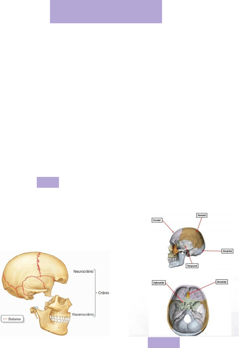 Osteologia da Cabeça · O crânio forma uma caixa óssea que tem a função primordial de abrigar e proteger o encéfalo. Além de possuir cavidades e proteger os órgãos da sensibilidade específica (visão, audição, equilíbrio, olfato e gustação), também apresenta aberturas para a passagem do ar e do alimento e apresenta as maxilas, a mandíbula e os dentes, que são necessários para a mastigação. Divisão O crânio faz parte do esqueleto Axial junto com a coluna e o tórax. É constituído por 28 ossos e dividido em duas partes: Neurocrânio e Viscerocrânio. · Neurocrânio ou crânio neural (crânio) - 14 ossos Arranjam-se de tal forma a constituir uma grande cavidade - cavidade do crânio – na qual se aloja o encéfalo; A porção larga mais alta do neurocrânio é conhecida como calvária. Os ossos que compõem a calvária consistem de duas lâminas de substância compacta – lâminas externa e interna – que encerram uma camada de substância esponjosa, que no crânio é conhecida por díploe; Ímpares: Frontal, Occipital, Etmoide, Esfenoide. Pares: Parietal, Temporal e os ossículos do ouvido (Martelo, Bigorna e Estribo). · Anotações · Viscerocrânio ou crânio visceral (face) - 14 ossos Ímpares: Mandíbula e Vômer Pares: Maxilar, Nasal, Lacrimal, Zigomático, Palatino e Concha Nasal inferior. · O teto do neurocrânio é conhecido como calvaria (calota craniana), enquanto seu assoalho é conhecido como base do crânio. · A base externa do crânio é a parte inferior do neurocrânio e viscerocrânio, menos a mandíbula. · A base interna do crânio possui três depressões importantes que são: as fossas anterior, média e posterior do crânio. · Anotações Calota Craniana Base externa do Crânio Fossas do Crânio Órbita A órbita é uma cavidade óssea situada no viscerocrânio Os ossos que formam a órbita são: frontal, lacrimal, esfenoide, etmoide, zigomático, palatino e maxila. Acidentes Ósseos da órbita Faces ou Processos Orbitais São as partes dos ossos: Frontal, Lacrimal, Maxilar, Etmóide, Esfenóide, Palatino e Zigomáticos que compõem a órbita. Osso Lacrimal Localizado próximo ao osso nasal, compõe a parede medial da órbita. Canal Óptico Dá passagem ao nervo Óptico. Fissura Orbital Superior Localizada entre as asas maiores e menores do osso esfenóide, dá passagem aos nervos motores do olho e ao nervo e veia oftálmicos. Fissura Orbital Inferior Abaixo da fissura Orbital Superior, dá passagem a porção maxilar do nervo trigêmeo. · Anotações Paredes da Órbita Parede superior: é formada pelos ossos: frontal e esfenóide Parede medial: etmóide, esfenóide, lacrimal e frontal; Parede inferior ou assoalho: maxila, zigomático e palatino; Parede lateral: processo frontal do zigomático e asa maior do esfenóide. O ápice da órbita: O canal óptico, formado pela asa menor do esfenóide Margens da Órbita margem superior: osso frontal margem inferior: ossos maxilar e zigomático margem medial: ossos frontal, lacrimal e maxilar margem lateral: ossos zigomático e frontal Abertura piriforme É a abertura óssea do nariz formada pelos ossos maxilares e nasais. Ossículos do Ouvido São três pequenos ossos situados no interior da cavidade da orelha média na parte petrosa de cada osso temporal. De fora para dentro, estes ossos são: martelo, bigorna e estribo. Seus movimentos transmitem impulsos sonoros através da cavidade da orelha média. Acidente Ósseos do osso Frontal O frontal é um osso ímpar que forma a Região ântero-superior do crânio. Desenvolve-se em duas metades que crescem conjuntamente e, de modo geral, estão completamente fundidas em torno dos 5 ou 6 anos de idade. Uma sutura, às vezes, persiste entre essas duas partes além da idade de seis anos e chama-se sutura metópica. Glabela Localizada acima do nariz entre os supercílios (sobrancelhas). Processo Zigomático Continuação da Margem Supra-Orbital lateralmente, articula-se com o osso zigomático Forame Supra-Orbital Se localiza na parte superior da órbita. É uma abertura para vasos sanguíneos e nervos. incisura Supra-Orbital Também se localiza na parte superior da órbita. É uma abertura para vasos sanguíneos e nervos. Face Orbital Parte nasal que compõe a órbita. Arco Superciliar Elevações arqueadas que se estendem lateralmente, a partir da glabela. Seio Frontal Cavidade na qual há a passagem do ar, próximos a órbita. Margem Supra-Orbital Contorno superior da órbita. Dividindo o Osso Frontal do Parietal se encontra a Sutura Coronal. · Anotações Acidentes Ósseos do Parietal Linha mediana, formando a maior parte da calota craniana. É Dividido pela sutura interparietal ou sagital. A sutura Lambdóide separa os ossos parietais do occipital e a sutura coronal que divide o osso frontal dos dois parietais. Margem Frontal Ponto de articulação com o osso frontal. Margem Sagital Ponto de articulação entre os dois parietais. Margem Escamosa Ponto de articulação com os ossos temporais. Margem occipital Ponto de articulação com o osso occipital. Sulcos Arteriais Na face medial do ossos, sendo predominante a artéria meníngea média. Forame Parietal por onde passam as veias emissárias. Linhas Temporais superior e inferior Acima da margem escamosa. Ângulos do osso parietal · Ângulo Frontal · Ângulo Esfenoidal · Ângulo Mastoideo · Ângulo Occipital Visão Interna Visão externa Acidentes Ósseos do temporal Forma a fossa média do crânio. Meato Acústico Externo Abertura que comunica o exterior com o ouvido médio. Parte escamosa Se localiza ântero-superior (na frente e em cima). Parte Timpânica Forma e envolve o meato acústico externo. Parte Petrosa Forma o assoalho da fossa média do crânio e aloja o ouvido médio e interno. Meato Acústico Interno Abertura na parte petrosa. Processo Mastóideo Proeminente projeção inferior, atrás do meato acústico externo. Forame estilomastóideo ou Forame Mastóideo é um forame localiz