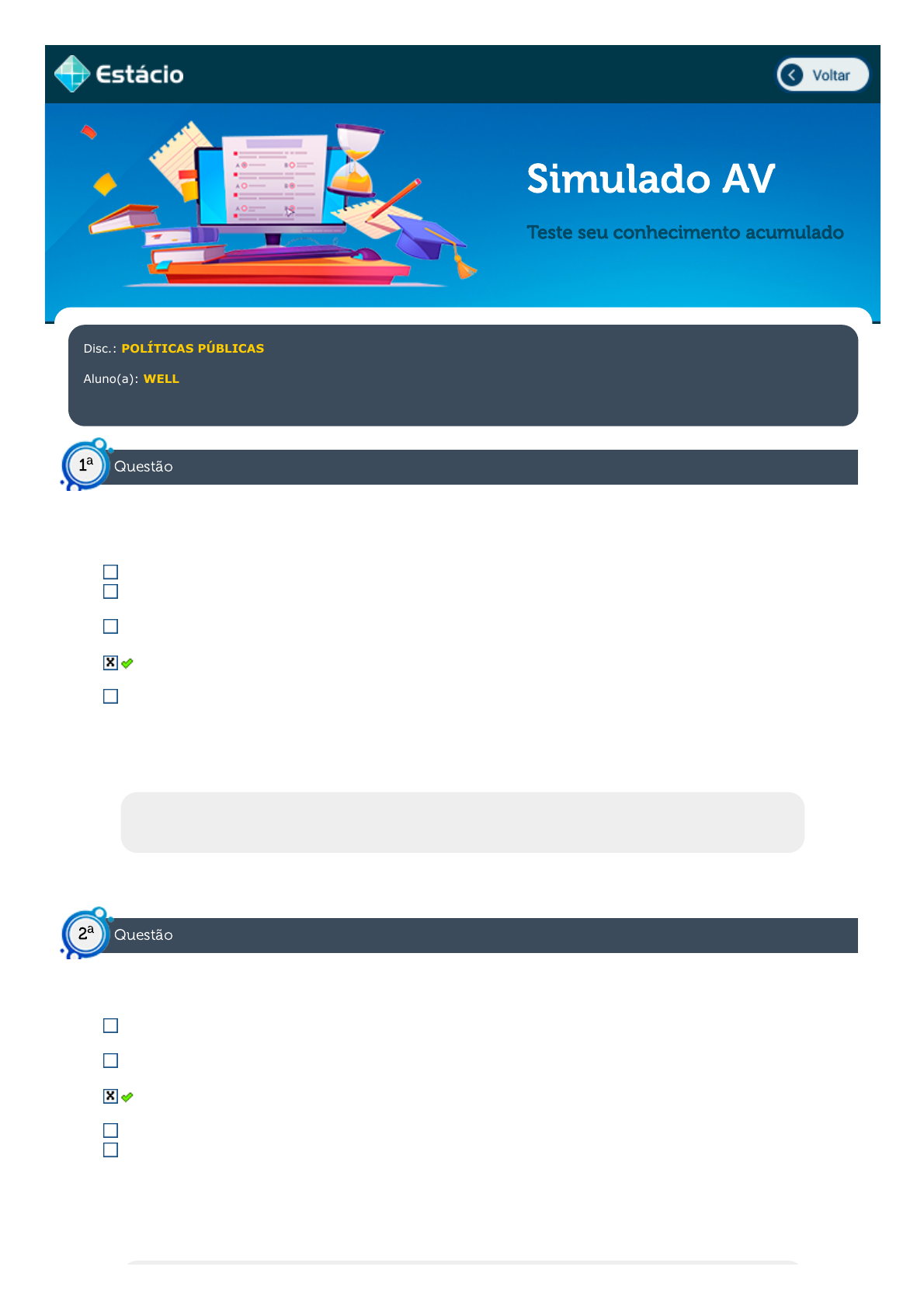 02/07/2021 Estácio: Alunos https://simulado.estacio.br/alunos/ 1/5 Simulado AV Teste seu conhecimento acumulado Disc.: POLÍTICAS PÚBLICAS Aluno(a): WELLINGTON BONIFACIO THOME 202004285921 Acertos: 10,0 de 10,0 03/07/2021 Acerto: 1,0 / 1,0 A vacina é um bem que, sem a intervenção governamental, fica com uma quantidade abaixo da socialmente ótima. Que tipo de falha de mercado temos aqui? Crowd out Tragédia dos Comuns Consumidor carona Externalidade positiva Externalidade negativa Respondido em 03/07/2021 14:22:47 Explicação: Acerto: 1,0 / 1,0 Dentre as afirmações abaixo, selecione a alternativa correta a respeito do modelo de Lindahl: As pessoas sempre têm conhecimento sobre a precificação do bem público As pessoas possuem incentivos para revelar sua disposição a pagar pelo bem público O modelo de Lindahl segue o princípio do benefício para cobrar impostos Não existem consumidores caronas nesse modelo O modelo de Lindahl prevê a taxa paga pelo consumidor igual ao custo marginal dividido pelo número de pessoas beneficiadas pelo bem público Respondido em 03/07/2021 14:23:41 Questão1 a Questão2 a https://simulado.estacio.br/alunos/inicio.asp javascript:voltar(); 02/07/2021 Estácio: Alunos https://simulado.estacio.br/alunos/ 2/5 Explicação: Acerto: 1,0 / 1,0 Dentre as afirmações abaixo, selecione a alternativa incorreta sobre os mecanismos de controle do governo: A Polícia Federal tem como uma de suas funções punir irregularidades praticadas por funcionários públicos O chefe do CGU é indicado pelo presidente da república O TCU tem ministros escolhidos pelo Congresso Nacional e pelo presidente da república O procurador-geral da república é o responsável pelo MPF e pelo MPU TCU é responsável por fiscalizar se o governo está cumprindo a LRF Respondido em 03/07/2021 14:23:59 Explicação: Acerto: 1,0 / 1,0 Leia atentamente o texto: A utilidade de um indivíduo é _______ se ele adquire um seguro, mesmo que tenha certeza de que pagará um prêmio para não utilizar. Selecione a alternativa que preencha a lacuna e explique o motivo dessa afirmação. Baixa. Somente com um prêmio justo, os indivíduos aceitarão contratar o seguro. Baixa. A aversão ao risco determina que a utilidade da pessoa sempre será baixa, independentemente de estar assegurado. Baixa. O indivíduo deseja que o seguro forneça o consumo suavizado dado o princípio da utilidade marginal decrescente. Alta. A aversão ao risco determina que a utilidade da pessoa sempre será baixa, independentemente de estar assegurado. Alta. O indivíduo deseja que o seguro forneça o consumo suavizado, dado o princípio da utilidade marginal decrescente. Respondido em 03/07/2021 14:24:41 Explicação: Acerto: 1,0 / 1,0 (Fernando Rezende. Finanças públicas. 2. ed. SP: Atlas, 2001, p. 17, com adaptações). As funções do governo expandiram-se de forma considerável nos últimos anos, refletindo a necessidade de Questão3 a Questão4 a Questão5 a 02/07/2021 Estácio: Alunos https://simulado.estacio.br/alunos/ 3/5 intervenção governamental no sistema econômico, assim como as modificações nas preferências da coletividade quanto à intervenção do governo em atividades relacionadas à distribuição de renda. Tendo como referência o texto acima, assinale a opção correta. A chamada função estabilizadora exercida pelo governo visa o provimento de bens públicos para todos os consumidores, em face das imperfeições inerentes à própria lógica de mercado, que determina o tipo e a quantidade de bens públicos a serem ofertados à população. A oferta do serviço público de justiça eleitoral é um exemplo de um bem semipúblico, inerente à função estabilizadora exercida pelo governo de assegurar condições democráticas no país e estabilidade política. A atividade do Estado na alocação de recursos justifica-se naquelas situações em que são utilizadas as receitas orçamentárias para provisão de bens que tenham as características de bens privados, mas que momentaneamente não estão sendo produzidos pelo mercado. O orçamento público é um importante instrumento da política de estabilização econômica. Por isso, não se recomenda a realização de mudanças nas receitas e nas despesas públicas, visando o controle da inflação e do crescimento econômico. O governo pode realizar ajustamento na redistribuição da renda e da riqueza do país utilizando instrumentos como transferências, impostos e subsídios. Por exemplo, o Estado pode tributar indivíduos de alta renda e utilizar os recursos captados para o financiamento de programas para a parcela de baixa renda da população. Respondido em 03/07/2021 14:26:07 Explicação: Acerto: 1,0 / 1,0 Leia o texto atentamente. Muitas crianças em situações de extrema pobreza não podem contar com uma alimentação diária rica em nutrientes. Em diversos casos, observou-se que a merenda oferecida pela escola era a única refeição do dia. Mas e os casos das crianças que ainda não tinham idade para frequentar a escola, aquelas menores de 6 anos? Essas crianças, que estão na faixa etária de 6 meses até os 6 anos de idade, possuíam muitos déficits nutricionais, como a anemia ferro priva (falta de ferro no sangue). Vendo essa realidade, o governador resolveu que, para lidar com os déficits nutricionais (em especial, a anemia ferro priva), seriam distribuídos mensalmente 20 litros de leite enriquecidos com ferro, para que essas crianças pudessem ter um desenvolvimento saudável apesar da situação de pobreza. Após a leitura atenciosa do texto, escolha a alternativa que descreve o desenho do programa fictício: i) a definição do problema, ii) a intervenção, iii) o público-alvo e iv) o impacto potencial. i) Crianças que não estavam na escola; ii) Distribuição de 20 litros de leite enriquecidos com ferro; iii) Crianças de 6 meses a 6 anos de idade; e iv) Déficit nutricional, em especial, anemia ferro priva. i) D