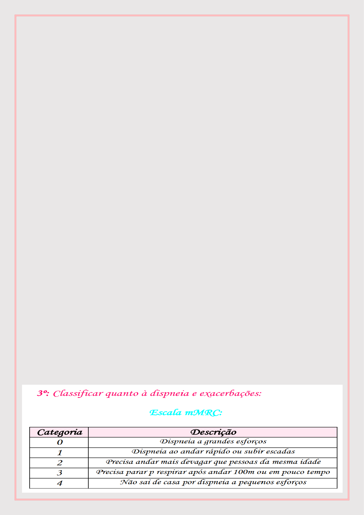 OSCE – dpoc Queixa: tosse a 5 anos Perguntas: Qual a característica da tosse (seca/expectoração)? Coloração da expectoração (caso haja). Qual tempo de surgimento e como está a progressão (tem aumentado)? Tosse é intermitente ou contínua na maior parte do dia? Tem fator de melhora ou piora? (Decúbito, exercício, etc) Sintomas associados? Febre, calafrios, sudorese, vômitos/náuseas, dispneia. Faz uso de algum medicamento? Tem alguma comorbidade (HAS, diabetes, hiperlipidemia, etc)? É tabagista? Se sim, a quanto tempo e quantos maços ao dia? Trabalha com oq? Fogão a lenha, exposto a agentes tóxicos, etc) Alguém na família de 1° grau tem doenças pulmonares como tumor, bronquite, etc? Hipóteses Diagnósticas: DPOC Exame Físico: Sinais vitais Exame físico pulmonar [redução na expansibilidade, queda do murmúrio vesicular, hipersonoridade, aumento de diâmetro (tórax em barril) ]. Baqueteamento digital Exames solicitados: Radiografia de tórax (retificação do diafragma, hiperinsuflação, aumento da distância entre arcos intercostais) Espirometria com broncodilatador (vef1/cvf <0,7) Classificação de Gold: Leve VEF1 >ou= a 80% do previsto; Moderada VEF1 de 50-79% do previsto; Grave VEF1 de 30-49% do previsto; Muito grave VEF1 <30% do previsto. Avaliação para ajudar na escolha do tratamento: Escolha do tratamento: LAMA: tiatrópio, flicopirrônio (antimuscaríneo) LABA: formoterol, salmeterol, indacaterol (beta agonistas) Esquema de tratamento duplo: Indacaterol 300 mcg 1x/dia inalatório e tiatrópio 5 mcg 1x/dia