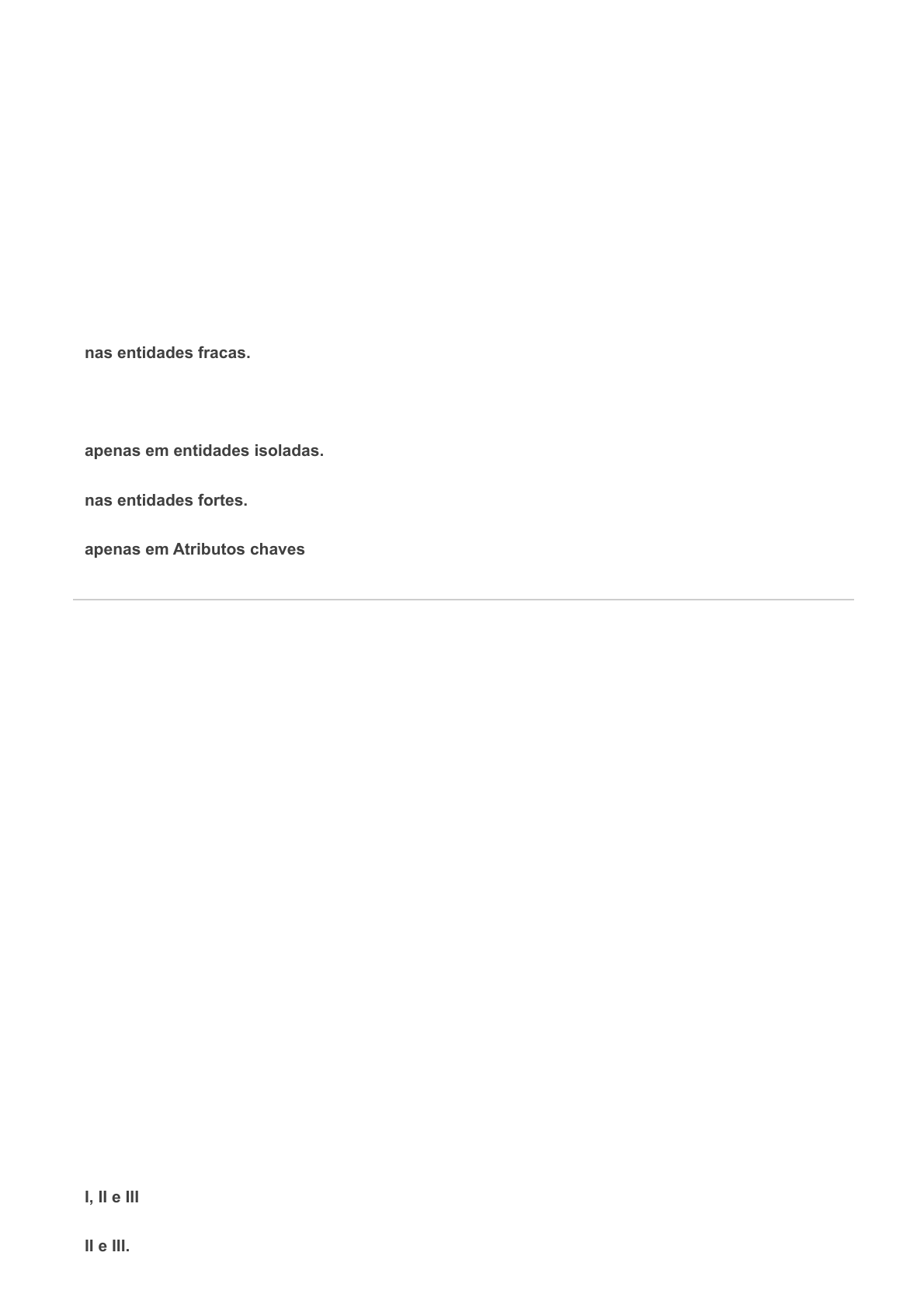 06/07/2021 Comentários https://sereduc.blackboard.com/ultra/courses/_54650_1/outline/assessment/_3634318_1/overview/attempt/_13299278_1/review/inline-feedback?… 1/7 Ocultar opções de resposta Ocultar opções de resposta Pergunta 1 -- /1 O relacionamento entre entidades é um recurso importante na modelagem de banco de dados e afeta os elementos diretamente envolvidos em diferentes níveis. Por intermédio dos relacionamentos, é possível estabelecer restrições de integridade dos dados manipulados. De acordo com o texto, podemos afirmar que a cardinalidade poderia interferir nos seguintes elementos da modelagem: nas entidades fracas. Resposta corretagrau de relacionamento. apenas em entidades isoladas. nas entidades fortes. apenas em Atributos chaves Pergunta 2 -- /1 Um atributo do tipo chave, além de permitir a unicidade dos dados, é importante na organização geral dos dados, podendo inclusive determinar a ordem em que os dados serão acessados, independente da ordem de inserção no banco de dados. A partir da leitura do texto sobre atributo-chave e dos conteúdos estudados, analise as afirmativas a seguir sobre os as possíveis composições de um campo-chave. I. Desde que o conteúdo não seja nulo, é permitido um atributo-chave receber até o máximo de dois conteúdos repetidos. II. Um atributo chave pode ser composto por mais de um atributo. III. As chaves devem ser numéricas. IV. As chaves ordenarão todos os registros de acordo com sua natureza. Está correto apenas o que se afirma em: I, II e III II e III. 06/07/2021 Comentários https://sereduc.blackboard.com/ultra/courses/_54650_1/outline/assessment/_3634318_1/overview/attempt/_13299278_1/review/inline-feedback?… 2/7 Ocultar opções de resposta Resposta corretaII e IV. I e II. III e IV. Pergunta 3 -- /1 Em um banco de dados, as Entidades são estruturas estabelecidas e pré-definidas visando o agrupamento e organização das informações a serem inseridas. Caso não haja um campo chave definido, os dados seguiram uma ordenação padrão. Considerando essas informações e o conteúdo estudado sobre a ordenação dos dados nas Entidades, é correto afirmar que: a ordenação padrão a que o texto se refere é uma sequência numérica. as Entidades sem campos chaves serão ordenadas pelo primeiro atributo definido. Resposta correta as Entidades sem campos chaves serão ordenadas na sequência da inserção dos dados. as Entidades sem campos chaves seguiram uma ordenação aleatória. toda Entidade sempre terá seus dados ordenados de acordo com a inserção dos dados, independente do campo chave. Pergunta 4 -- /1 06/07/2021 Comentários https://sereduc.blackboard.com/ultra/courses/_54650_1/outline/assessment/_3634318_1/overview/attempt/_13299278_1/review/inline-feedback?… 3/7 Ocultar opções de resposta Ocultar opções de resposta Durante a modelagem do banco de dados, pode ser necessário decidir qual tipo de atributo adotar em casos mais específicos. Uma decisão equivocada pode impactar na organização e eficiência de alguns dados armazenados. Considerando essas informações e o conteúdo estudado sobre modelagem de dados, pode-se afirmar que quando esta aponta para um elemento que deve receber vários valores, isso diz respeito ao tipo de Atributo: Polivalorado. Resposta corretaMultivalorado Não Valorado. Monovalorado. Uni-Valorado. Pergunta 5 -- /1 Analise o diagrama Entidade-Relacionamento a seguir sobre devolução de livros em uma biblioteca. Baseado no diagrama e no conteúdo estudado sobre entidade-relacionamento e suas cardinalidades, é correto afirmar que: bq_01_questao_20.PNG.png o diagrama indica que um aluno poderá requisitar no máximo um livro. o livro poderá pertencer a mais de uma sessão na biblioteca. em uma requisição só poderá haver um livro solicitado. Resposta corretao diagrama indica que um aluno poderá requisitar entre um e N livros. analisando apenas o diagrama, é impossível determinar quantos livros o aluno poderá solicitar. 06/07/2021 Comentários https://sereduc.blackboard.com/ultra/courses/_54650_1/outline/assessment/_3634318_1/overview/attempt/_13299278_1/review/inline-feedback?… 4/7 Ocultar opções de resposta Ocultar opções de resposta Pergunta 6 -- /1 O conceito de Abstração é adotado para reduzir o nível de detalhes desnecessários e que não dizem respeito ao usuário ou cliente do projeto de Banco de Dados, ou seja, para o usuário, as informações recebidas são livres de detalhes mais técnicos do banco de dados. De acordo com o texto acima e o conteúdo estudado, podemos afirmar que a abstração do projeto é maior em qual ou quais fases: Projeto Conceitual e Lógico. Resposta corretaProjeto Conceitual. Projeto Físico. Projeto Lógico. Projeto Físico e Lógico. Pergunta 7 -- /1 Peter Chen, em 1976, idealizou um modelo Entidade-Relacionamento que ainda hoje é muito utilizado. Esse modelo sofreu ajustes mínimos, mas permanece essencialmente o mesmo. A modelagem proposta por Chen contempla um diagrama para representá-la. Considerando o modelo proposto por Chen mencionado no texto, escolha a alternativa que identifica o diagrama correto: MER. Resposta corretaDER. 06/07/2021 Comentários https://sereduc.blackboard.com/ultra/courses/_54650_1/outline/assessment/_3634318_1/overview/attempt/_13299278_1/review/inline-feedback?… 5/7 Ocultar opções de resposta ME. RE. RUB. Pergunta 8 -- /1 Analise o diagrama Entidade-Relacionamento abaixo. A partir da análise do diagrama Entidade-Relacionamento apresentado e dos conteúdos estudados sobre relacionamentos, é correto o que se afirma em: bq_01_questao_15.PNG.png O elemento D é a cardinalidade imposta para a entidade A e o elemento E é a cardinalidade do elemento B. A entidade A é a entidade forte da relação apresentada e B é a entidade fraca. O elemento C determina o grau de relacionamento entre as entidades A e B. A entidade B é a entidade forte da relação apresentada e A é a entid