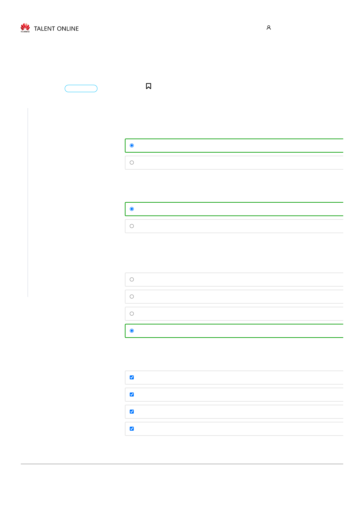 18/06/2021 Quiz | Quiz | EBGTC00000410 Courseware | Huawei iLearningX https://talent.huaweiuniversity.com/courses/course-v1:HuaweiX+EBGTC00000410+202103003t/courseware/de7164a53de84d9bb770e9dc01822… 1/2 Home > Learning > C2 - HCIA 5G Learned 98%Catalog Introduction of HCIA-5G 1. 5G Motivation and Industry Progress 2. 5G Network Architecture and Key… Introduction 2.1 5G Business Scenarios and Key Capabilities 2.2 5G Network Architecture and Key Technologies Quiz Quiz 3. 5G Use Case 4. Typical Industry Application Solutions of… Training Materials Final Exam Satisfaction Survey Quiz Quiz 25/25 points (graded) 1. (Ture or False) uRLLC cannot be supported by NSA mode. 2. (Ture or False) Sub6G Hz includes sub3G Hz and C-band. 3. (Single choice) In current eMBB scenario, what channel coding method is adopted on control c interface? 4. (Multiple choices) What gains can be realized by massive MIMO of 5G? 5. (Multiple choices) Which ones of the below techniques can be used to solve the uplink and dow problem of 5G radio network? Bookmark this page Ture False Ture False LDPC Turbo Convolutional code Polar Beam forming UL MU-MIMO DL MU-MIMO SU-MIMO 2. 5G Network Architecture and Key Techn… > Quiz > Quiz Learning Certification Enterprise 中 ENPartner jorgeflm Contact Us https://e.huawei.com/en/talent/#/ https://e.huawei.com/en/talent/#/search?productTags=&productName=&navType=learningNavKey https://talent.huaweiuniversity.com/portal/courses/course-v1:HuaweiX+EBGTC00000410+202103003t/about https://talent.huaweiuniversity.com/courses/course-v1:HuaweiX+EBGTC00000410+202103003t/courseware/de7164a53de84d9bb770e9dc0182281b/bbea704fcd5d4038a9a6de7fb31486b9/ https://talent.huaweiuniversity.com/courses/course-v1:HuaweiX+EBGTC00000410+202103003t/courseware/de7164a53de84d9bb770e9dc0182281b/6821e2ea36df40af978a2d0f58b4a921/ https://talent.huaweiuniversity.com/courses/course-v1:HuaweiX+EBGTC00000410+202103003t/courseware/de7164a53de84d9bb770e9dc0182281b/b63d673ddef14b818886346161edc513/ https://talent.huaweiuniversity.com/courses/course-v1:HuaweiX+EBGTC00000410+202103003t/courseware/de7164a53de84d9bb770e9dc0182281b/dda164a9b5134fa0aaac5e6bc51b5652/ https://talent.huaweiuniversity.com/courses/course-v1:HuaweiX+EBGTC00000410+202103003t/courseware/de7164a53de84d9bb770e9dc0182281b/dda164a9b5134fa0aaac5e6bc51b5652/ https://e.huawei.com/en/talent/#/search?productTags=&productName=&navType=learningNavKey https://e.huawei.com/en/talent/#/cert?navType=authNavKey https://e.huawei.com/en/talent/#/corporate/home?navType=enterpriseCustomer https://e.huawei.com/en/talent/#/ https://support.huawei.com/iknow/?source=SupportE 18/06/2021 Quiz | Quiz | EBGTC00000410 Courseware | Huawei iLearningX https://talent.huaweiuniversity.com/courses/course-v1:HuaweiX+EBGTC00000410+202103003t/courseware/de7164a53de84d9bb770e9dc01822… 2/2 About Us Huawei Certification Huawei ICT Academy Huawei Authorized Learning Partner Information Center Resources Documentation Center Partner (HALP) Download Zone ICT Academy Download Zone Quick Links Corporate Huawei Enterprise Huawe Partner University Huawei Recruitment Huawei Certification Forum Huawei Cloud Contact Us For questions about certifications, contact certification@huawei.com Huawei Certification Facebook Huawei Certification Twitter Huawei ICT Academy Facebook Copyright © 2020 Huawei Technologies Co., Ltd. All rights reserved. Contact Us Pr Show Answer You have used 3 of 3 attempts Uplink and downlink decoupling (SUL) Dual connection CU and DU separation LDPC coding Submit Learning Certification Enterprise 中 ENPartner jorgeflm Contact Us https://e.huawei.com/en/talent/#/cert https://e.huawei.com/en/talent/#/ict-academy/home https://e.huawei.com/en/talent/#/halp/home https://e.huawei.com/en/talent/#/news/home https://open.edx.org/ https://e.huawei.com/en/talent/#/resources https://e.huawei.com/en/talent/#/resources?type=halp https://e.huawei.com/en/talent/#/resources?type=ict https://www.huawei.com/en/ https://e.huawei.com/en/ https://partner.huawei.com/university/weben/home/home.html http://career.huawei.com/reccampportal/campus4_index.html#campus4/content.html https://forum.huawei.com/enterprise/en/forum-100113.html https://intl.huaweicloud.com/?locale=en-us mailto:certification@huawei.com https://www.facebook.com/huawei.certifications/ https://twitter.com/HWCertification https://www.facebook.com/huaweiictacademy/ https://www.huawei.com/en/contact-us https://e.huawei.com/en/talent/#/privacy https://e.huawei.com/en/talent/#/search?productTags=&productName=&navType=learningNavKey https://e.huawei.com/en/talent/#/cert?navType=authNavKey https://e.huawei.com/en/talent/#/corporate/home?navType=enterpriseCustomer https://e.huawei.com/en/talent/#/ https://support.huawei.com/iknow/?source=SupportE