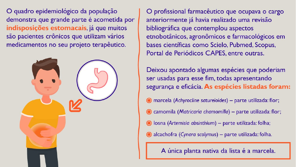 Consideram-se farmácias vivas aquelas instituídas pela Portaria n.º 886, de 20 de abril de 2010, do Ministério da Saúde, que instituiu a farmácia viva no âmbito do Sistema Único de Saúde (SUS). As farmácias vivas realizam as etapas de cultivo, coleta, processamento, armazenamento de plantas medicinais, preparação e dispensação de produtos magistrais e oficinais de plantas medicinais e fitoterápicos. Elas são regidas pela Resolução - RDC n.º 18, de 3 de abril de 2013. Um gestor público de uma pequena cidade do Rio Grande do Sul, sabendo que sua população tem grande apreço por plantas medicinais e faz amplo uso delas, decide oferecer a fitoterapia como opção terapêutica para os usuários do SUS de sua cidade. Então, ele consulta a legislação que rege o tema e descobre que a cidade tem o cenário ideal para implantar uma farmácia viva, já que apresenta no quadro de seus recursos humanos um agrônomo, um farmacêutico e profissionais da saúde que conhecem tecnicamente plantas medicinais. Além disso, apesar de poucos, há alguns agricultores que praticam agricultura orgânica, que ele quer fomentar, completando o quadro favorável para essa implementação. Acompanhe, na imagem a seguir, o quadro epidemiológico da população e o estudo realizado. Logo, o gestor chama você, o novo farmacêutico, e solicita um projeto piloto de implantação de uma farmácia viva, com indicação de uma planta para iniciar o cultivo. a) Você, ao analisar o cenário descrito, qual planta medicinal escolheria? Justifique. b) Qual época indicaria para a colheita e como faria a conservação dessa planta? Justifique. Padrão de resposta esperado a) Considerando que é importante promover um ambiente mais próximo do habitat natural das espécies, é necessário escolher uma espécie nativa da região, que tenha as propriedades farmacológicas bem definidas em estudos científicos para atender à demanda de saúde apresentada. Como isso, a Achyrocline satureioides, popularmente conhecida como "marcela", por ser a única espécie nativa da lista, e por ser amplamente utilizada pela população para tratar problemas de indisposição estomacal na forma de chá medicinal, foi a planta escolhida. Outro fato é que a marcela vegeta espontaneamente em diversas áreas do Estado e se adapta muito bem em terrenos cultivados. b) Como a parte utilizada para a finalidade terapêuitca é a flor, a colheita deverá ser feita na época de floração, que, no caso da marcela, acontece no outono. O material fresco, recém-colhido e limpo, deverá ser encaminhado à secagem natural — já que será uma pequena quantidade — em uma sala arejada, sem exposição de luz, com portas e janelas teladas. As flores devem ser bem espalhadas em bandejas e, após mais ou menos cinco dias, serão classificadas e embaladas em papel pardo, devidamente identificadas. Os pacotes deverão ser armazenados na sala de armazenamento da farmácia, que é um ambiente seco, escuro e arejado, pronto para serem distribuídos para a população preparar o chá medicinal.