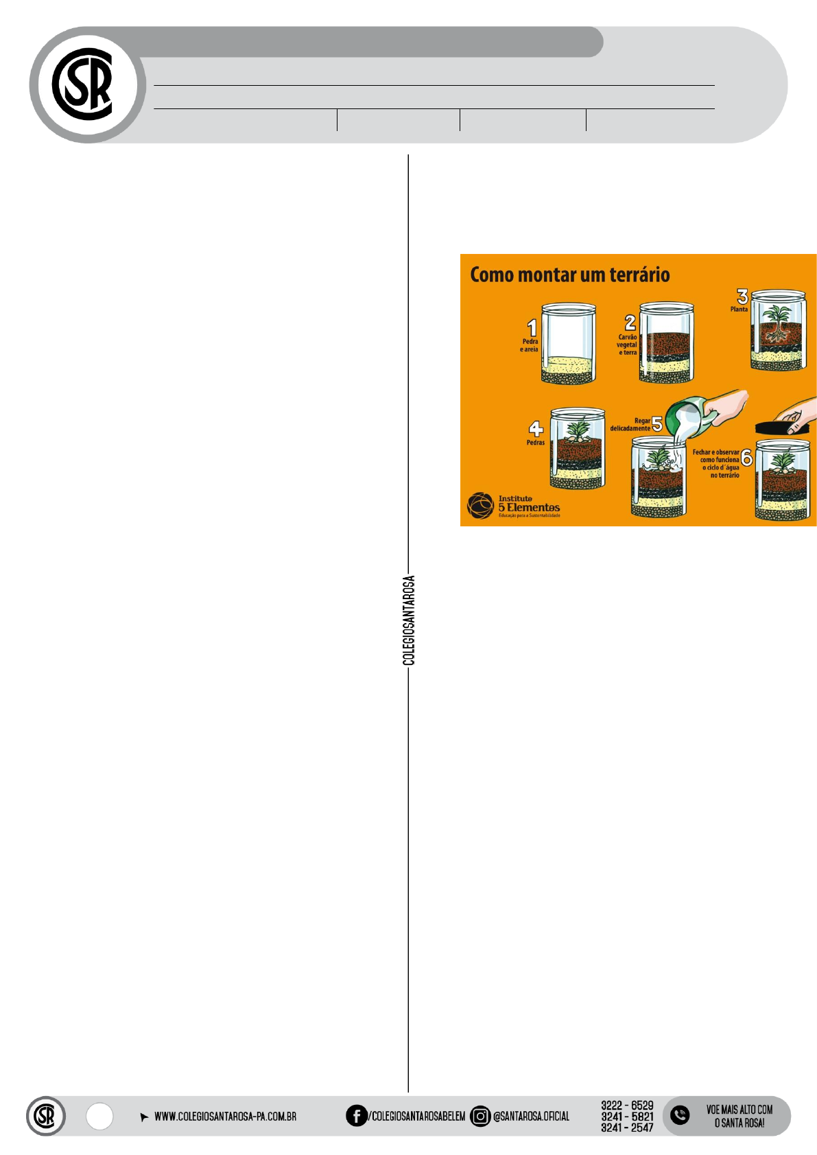 1 PROFESSOR(A): KLICIA REGATEIRO ALUNO(A): Nº SÉRIE: 6º ANO TURMA: TURNO: ______/______/2020 ENSINO FUNDAMENTAL II – QUÍMICA AULA 01 – PRÁTICA I: Confecção de um terrário. 1. Material • 1 recipiente plástico ou acrílico transparente (grande) com tampa (garrafa PET ou garrafa de água de 5L); • Cascalho ou pedrinhas de jardim; • 3 ou 4 Xícaras de terra adubada; • Algumas folhas secas (para enfeitar); • 1 saco de sementes • 1 ou 2 mudas pequenas de plantas resistentes à falta de água, como suculentas ou grama de jardim; • 1 Copo descartável; • Fita adesiva transparente. • Um par de luvas. • Pazinha de jardim ou garfo descartável. • 1 Pano (Tipo perflex); • Enfeites de decoração de plantas, como placas, bonequinhos, etc. (se preferir). 2. Montagem • Limpar o recipiente com o pano. • No fundo do recipiente, coloque 4 cm de cascalho ou as pedrinhas; • Cubra o cascalho com as folhas secas; • Em seguida, faça uma camada com a terra, o suficiente para cobrir as raízes das plantas; • Faça pequenas covas na camada de terra e plante as plantinhas; • Acrescente alguns enfeites de decoração; • Com o copo, deixe que a água escorra pelas paredes internas do aquário até o fundo; • Depois que colocar a água, tampe o recipiente e lacre- o com a fita; • O ecossistema está pronto. Depois de pronto, coloque o terrário em algum lugar que seja de fácil acesso para os alunos, pois eles terão de checar as suas condições diariamente. É necessário que toda e qualquer alteração dentro do terrário seja anotada no caderno. 3. Manutenção A cada 15 dias devemos abrir o terrário para colocar um pouco de água, deixando-o sempre úmido. Ele não deve ficar encharcado (se estiver, não se deve adicionar água) (http://5elementos.org.br/site/wp- content/uploads/2013/09/terrario.jpg) 4. Atividade Faça um registro inicial com a data da montagem e os componentes do terrário. O registro deve ser realizado semanalmente, pode-se fazer desenhos. Após 1 mês de registro, indique quais seres vivos predominaram no terrário e compare a estrutura original. 5. Relatório Ao final de 30 dias, entregue um relatório da atividade prática, contendo os materiais, montagem e respondendo as questões. Obs.: Se o terrário morrer antes de completar 30 dias, faça uma pesquisa para verificar o que pode ter dado errado. 2 Registro do terrário: 1 ª se m an a (_ __ __ / __ __ _/ _ __ _ _) 2 ª se m an a (_ __ __ / __ __ _/ _ __ _ _) 3 ª se m an a (_ __ __ / __ _ __ /_ __ __ ) 4 ª se m an a (_ __ __ / __ __ _/ _ __ _ _) 1. De onde provém a água e os sais minerais que as plantas utilizam? _____________________________________________ _____________________________________________ _____________________________________________ _____________________________________________ _____________________________________________ _____________________________________________ 2. Como a água usada pelas plantas é reposta no terrário? 3. _______________________________________ _______________________________________ _______________________________________ _______________________________________ _______________________________________ _______________________________________ ____________________________________ 4. De onde vem o CO2 que as plantas usam no processo da fotossíntese? _____________________________________________ _____________________________________________ _____________________________________________ _____________________________________________ _____________________________________________ _____________________________________________ 5. De onde vem o O2 que as plantas usam em sua respiração? _____________________________________________ _____________________________________________ _____________________________________________ _____________________________________________ _____________________________________________ _____________________________________________ 6. Como ocorre o ciclo da água nesse ecossistema? _____________________________________________ _____________________________________________ _____________________________________________ _____________________________________________ _____________________________________________ _____________________________________________ 7. Coloque uma imagem do seu terrário após a observação.
