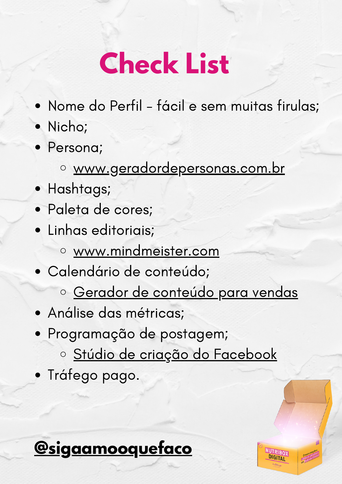 Nome do Perfil - fácil e sem muitas firulas; Nicho; Persona; www.geradordepersonas.com.br Hashtags; Paleta de cores; Linhas editoriais; www.mindmeister.com Calendário de conteúdo; Gerador de conteúdo para vendas Análise das métricas; Programação de postagem; Stúdio de criação do Facebook Tráfego pago. Check List @sigaamooquefaco https://geradordepersonas.com.br/ https://www.mindmeister.com/pt?gclid=Cj0KCQjw24qHBhCnARIsAPbdtlLEdUdBzA2RoGULl8N5lGSaZS6QBzDYS9yAbsO-zSrQmTdbEem46M4aAvPyEALw_wcB&r=517770 https://ferramentas.resultadosdigitais.com.br/ferramenta-jornada/resultado.html?utm_campaign=br-inb-rdsm-automacao-ty_email-gerador-jornada-de-compra-finalizado&utm_medium=email&utm_source=RD+Station&uuid=7eaa1bc1-acb5-4ce4-98bb-237560113834 https://www.facebook.com/formedia/solutions/creator-studio https://www.instagram.com/sigaamooquefaco/