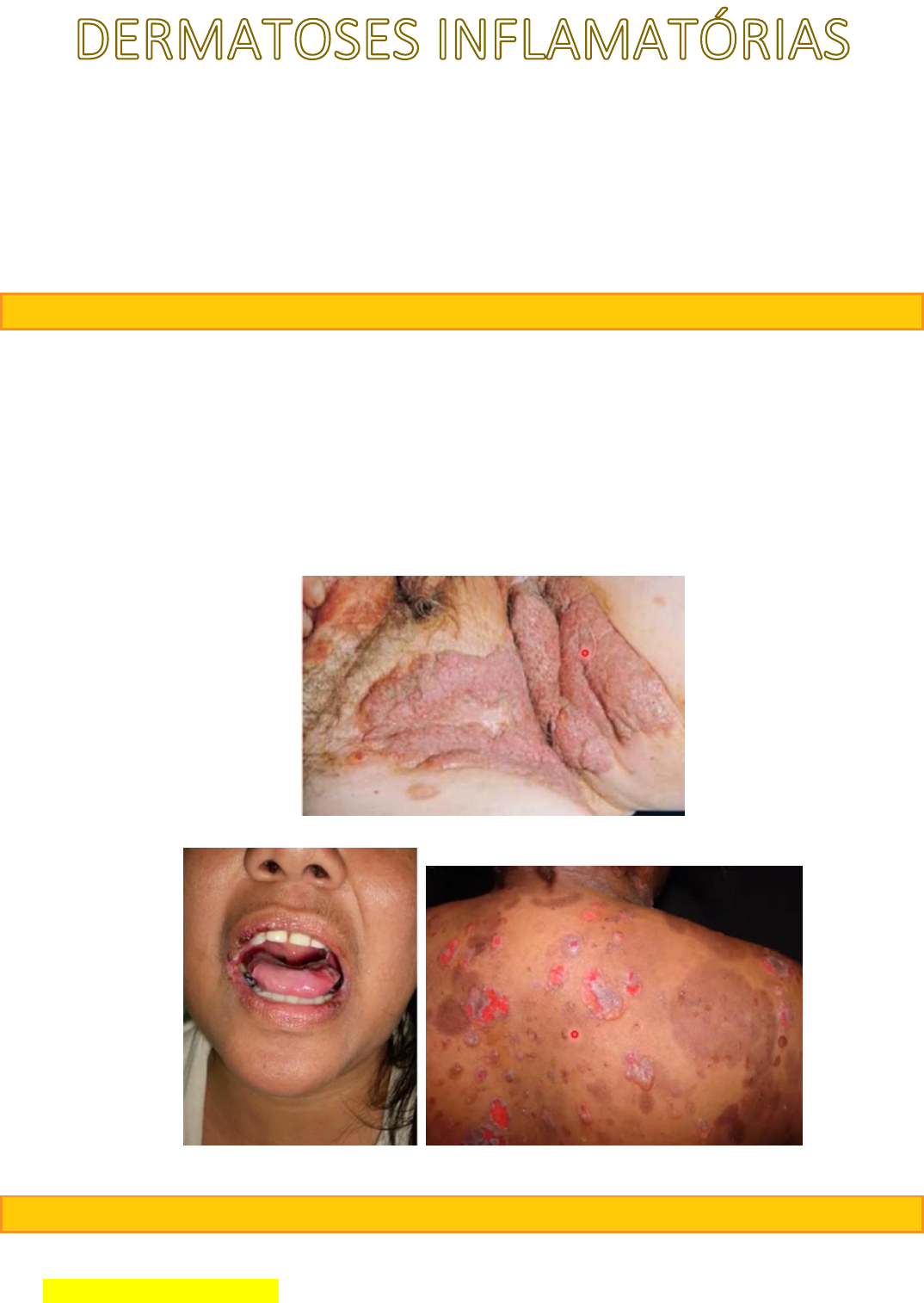 PENFIGOS VULGAR E FOLIACEO DERMATITE SEBORREICA PSORIASE DERMATITE ATOPICA LÚPUS Diferenciar doenças autoimunes PÊNFIGO VULGAR Doença bolhosa, Autoimune com anticorpos anti-desmogleinas 1 e 3 (expressas nos desmossomos – união dos queratinocitos) Lesões bolhosas nas mucosas em cerca de 50% dos casos (pp oral) Bolhas pouco tensas ou erosadas, deixando aspecto de “carne viva, conteúdo amarelo-citrino ou hemorrágico Odor peculiar – ninho de rato Localização: mucosas, c. cabeludo, face, tronco, genital e MMSS Induzido por drogas: D-penicilamina, IECA, penicilina, b-bloqueadores, rifampicina PENFIGO VEGETANTE – cresce para fora, muito em área de dobras Diagnostico vulgar: clínico + histopatológico-clivagem supra basal; IFD (imunoflurorescencia direta). PÊNFIGO FOLIÁCEO / FOGO SELVAGEM Doença bolhosa autoimune (anti-desmogleina 1). As lesões se rompem logo Dor e ardência/queimação Lesões originadas de bolhas efêmeras, que rapidamente se rompem dando origem à exulcerações / erosão / crostas (eritematobuloescamosas) “Queimadura por cigarro” Predileção por áreas seborreicas – coro cabeludo e etc. Fotossensibilidade - UV pode agravar Forma crônica: lesões verrucosas – “salpico de lama” (Simulium pruinosum) – mosquito borrachudo ou piúm (norte); a picada pode desencadear uma resposta autoimune cruzada, que pode precipitar ou causar DIFERENÇAS: esse não tem lesão de mucosa!!! Raramente formam bolha: clivagem muito alta ao nível da camada granulosa, quase na camada córnea, apenas um restinho de epiderme Diagnostico clinico + histopatológico DERMATITE SEBORREICA Dermatite crônica de caráter constitucional, ocorre em, pelo menos, 5% da população geral Hiperproliferação epidérmica Participação do Malassezia spp (tipo de fungo) Incidência aumentada em algumas doenças: AVE, Parkinson e HIV Apresentação clínica: lesões maculopapulosas, eritematosas ou amareladas, sem brilho, delimitadas e recobertas por escamas de aspecto gorduroso, que se distribuem pelas áreas seborreicas (Couro cabeludo, face, regiões pré-esternal, interescapular, flexura, axilares e anogenitais), retroauriculares Caspa – descamação couro cabeludo; Curvinha da asa do nariz (Descamação fufurácea – fininha). Pseudotinea Amiantácea – descamação do couro cabeludo, hiperproliferação da epiderme que descama; Crosta láctea – crostas aderidas ao couro cabeludo; HIV muita lesão do couro cabeludo. Mais comumente infantil. PSORÍASE Placa eritemato-descamativa. Doença imunoinflamatória, cutaneoarticular, crônica e recorrente que se caracteriza por hiperplasia epidérmica, ciclo evolutivo acelerado dos queratinócitos e ativação imune inapropriada (começa produzir citocinas inflamatórias inapropriadamente) 1 a 3% população mundial Pode ocorrer em qualquer faixa etária. Mais frequente na terceira década (75%) Risco aumentado para infarto agudo de miocárdio Causa desconhecida Base hereditária, multifatorial, o que significa dizer que é de herança poligênica e requer fatores ambientais para sua expressão. Participação de céls T e de células dendriticas já está bem delineada. Há predomínio da resposta Th1 e Th17 na patogênese da doença. Mais comum em joelhos e cotovelos. FATORES AGRAVANTES: - Infecções, HIV - Trauma, estresse, depressão - Síndrome plurimetabolica - Drogas: lítio, beta-bloqueadore, IECA, AINES, corticoide sistêmico, análogo dos receptores tipo II da angiotensina (losartana, valsartana) - Álcool, tabagismo - Koebner – reprodução de novas lesões da doença de base, da doença de trauma. Cirurgia no braço, onde o médico fez a sutura, pode desenvolver a psoríase Coça bastante Formas clínicas: PSORIASE VULGAR: - Placas eritematô-descamativas, bem delimitadas, em áreas de extensão - alo de boronofe: era uma placa maior, com o tratamento ela diminuiu. PSORIASE GUTTATA: - Lesões tipo gotas, pequenas - Jovens após infecção estreptocócica - As lesões eritematopapulosas são pequenas e lembram gotas, com escamas finas, disseminadas, principalmente no tronco PSORÍASE INVERTIDA: - Lesões nas áreas de dobras como axila, regiões inframamária, inguinal e genital - Devido localização, há menos ressecamento e escamas - Lembrar de HIV PSORIASE UNGUEAL: - Acomete o leito ungueal – com descolamento hiperceratose subungueal e manchas amarronzadas, mancha de óleo, quando acomete matris ungueal – resulta em pittings ou depressões cupuliformes e estrias transversais - Artrite psoriasica: 6 a 48% dos casos - Pode ser: mono, poli, simétrica, assimétrica, peq e grandes - Hiperproliferacao epidérmica - Se acomete leito ungueal, pode levantar a unha, forma aspecto de unha de gavião - paroníquea – inflamação ao redor das unhas PSORÍASE ERITRODÉRMICA: - Forma inflamatória com placas eritema e descamação intensa e generalizada (mais de 80% da superfície corporal) - Intenso catabolismo com perda hidroeletrolítica, proteínas e alta chance de sepse/ choque hipovolêmico / leak síndrome – paciente todo edemacionado, perda do liquido, do intra vascular p extra ERITRODERMIA ESFOLIATIVA – perde toda integridade da epiderme, perde liquido, eletrólitos, proteínas, aminoácidos PSORÍASE PUSTULOSA: - Pode aparecer do nada, ou pode surgir a partir da psoríase vulgar em placas ou ainda como resultado da suspensão abrupta de corticoterapia sistêmica (efeito rebote) - Quando ocorre na gravidez é denominada impetigo herpetiforme ou psoríase pustulosa da gestação. VITILIGO Dermatose autoimune, provocada por distúrbio da pigmentação da epiderme Aumento das céls de Langerhans Diminuição melanócitos 1% população mundial Maculas acrômicas, geralmente de crescimento centrifugo, simétrica e pode atingir pelos = poliose (branquear os pelos) Fenômeno de Koebner Universalis = + 80% Não tem proteção nenhum contra radiação solar, deve se proteger Doença autoimune, limitada a pele Asso