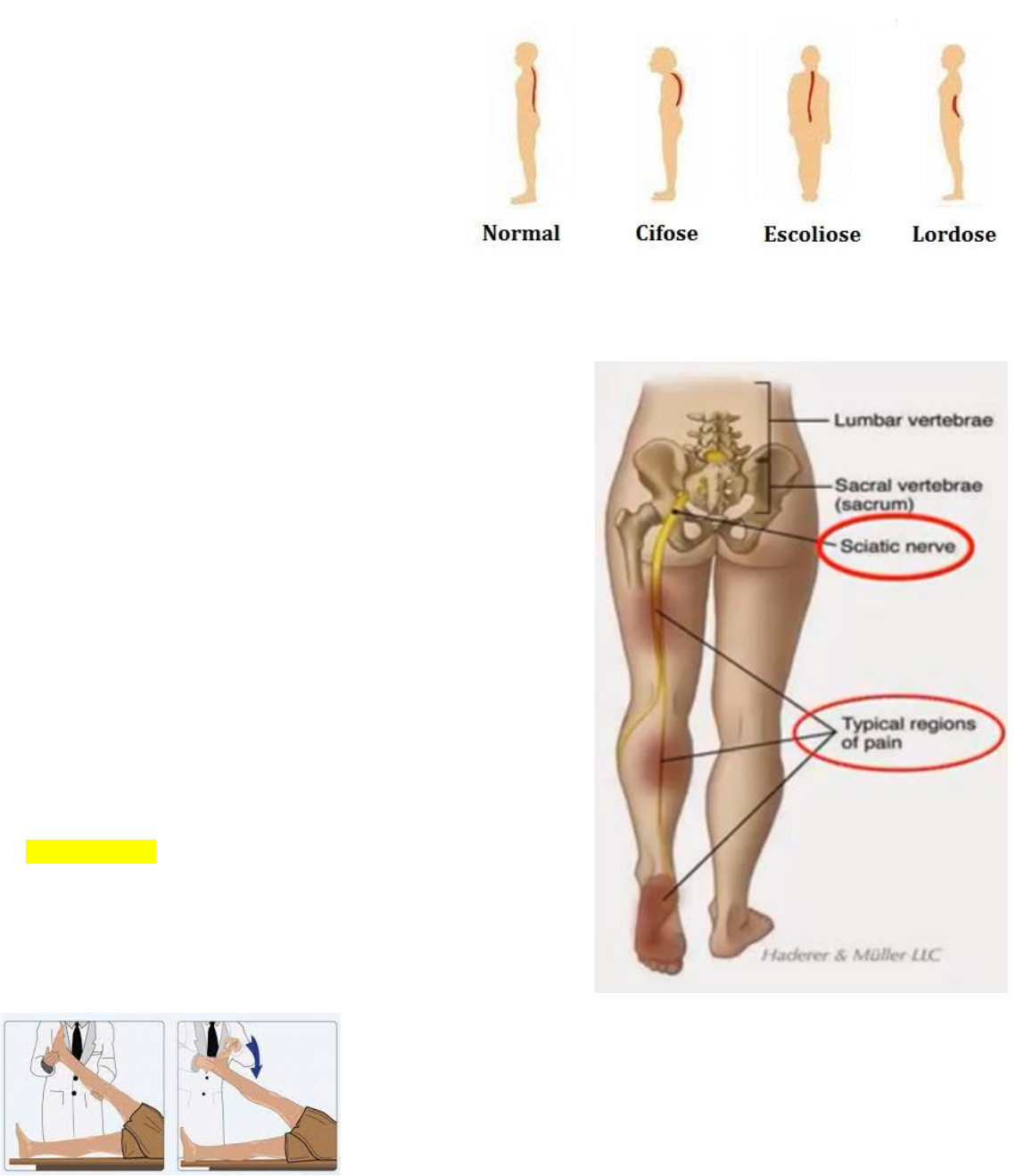 ESPONDILOARTROSE – MEDICINA UFCSPA Espondilo refere-se a coluna vertebral. Espondiloartrose, então, é uma artrose de coluna. A doença é importante pela sua incidência, se configurando como um dos mais importantes motivos de afastamento preventivo. O quadro clínico mais comum é uma pessoa acima de 50 anos que sente dor aguda após erguer peso. A dor é mecânica e a rigidez protocinética também é comum. São os discos cartilaginosos vertebrais que amortecem a carga exercida no eixo vertical do corpo. Na doença, então, gera-se, uma cascata degenerativa (redução do volume e fissuras no anel fibroso), fazendo com que o amortecimento seja prejudicado e haja um impacto maior entre as estruturas ósseas. A causa é desconhecida e a degeneração pode começar já aos 20 anos de idade. TODOS seres humanos terão a doença, em mais ou menos grau. Deformações da coluna, como pode ser checado na figura 1, aceleram o processo de espondiloartrose. Outros fatores que aceleram o processo fazem parte do nosso cotidiano, como postura errada ao sentar-se, dobrar o pescoço ao ficar horas no celular e até sentar em cima de objetos (carteira), pois acomoda a coluna em uma anatomia diferente da correta. Levando em consideração o curso da doença, a degradação da cartilagem, além de encurtar o espaço entre os ossos, permite a saída do núcleo pulposo, ocorrendo herniação nuclear (hérnia de disco). Esse núcleo frequentemente pressiona os nervos, ou até a medula. Outro caso típico é dor difusa em queimação, que corre pela perna (comprometimento da raiz nervosa – isquiático – que viaja ao longo dos MI’s). Na figura 2 temos a representação disso. Já quando a compressão é pra dentro do canal medular, há uma dor em queimação irradiando para os MI’s e paresia bilateral. Esse tipo de dor costuma aliviar com flexão anterior de tronco. •Exame físico: Inspeção: curvaturas e posturas. É importante analisar a postura para identificar um possível evento desencadeante da espondiloartrose no paciente. Inspeção dinâmica: com o tronco fletido, os defeitos tornam-se mais visíveis. Manobras de Lasègue e de Bragard devem ser feitas (figura 3) em casos de suspeita de compressão medular – observar se a dor neuropática se reproduz. Figura 1 Figura 2 Figura 3 Caso as duas manobras acima não tenham positivado, e o examinar ainda suspeira de compressão nervosa, usar o Sinal de Cecin. Basta pedir que o paciente fique de pé e flexione a coluna até um ângulo que suporte a dor. Assim que a dor irradiar da coluna para os membro inferiores, pedir que o paciente tussa. Se a dor exacerbar com a tosse, o sinal é positivo. As raizes geralmente mais comprometidas são L4 e L5. Para testar as raizes nervosas, usamos os reflexos, sensibilidade e mecanismo motor. O reflexo patelar recruta L2, L3 e L4; já o aquileu recruta L5, S1 e S2. É fundamental conhecer a área de cobertura dos nervos no corpo para fazer os testes corretos, inclusive os neurológicos. Se houver dor referida (associada a dermátomos) o diagnóstico pode ser mais complicado (dor facetária). Síndrome vertebrobasilar → quando a artéria basilar é comprometida na altura da coluna cervical. Tonturas ao rotacionar o pescoço é um sintoma típico. Já nos membros superiores, pode ocorrer cerviocobraquialgia. Dor irradiada aos membros por acomentimento dos plexos. A namobra de Spurling, figura 4, é útil aqui. Para ser positiva, o paciente deve refirir dor no mesmo lado para o qual o examinador está pressionndo a cabeça. Se houver dor do lado oposto, deve ser a miofacial (distensão muscular, ou até torcicolo em caso de rompimento de fibra). Caso o paciente não aguente a dor no Spurling, apenas pedir para lateralizar a cabeça em direção ao ombro e observar se há dor ipsilateral. •Fatores de risco: cigarro, obesidade, posturas erradas. A postura do canivete, na qual as pernas estão 0º, o corpo 45º e a cabeça 90º (geralmente a postura das pessoas deitadas em cadeiras de praia) é uma das piores para sua coluna! •Exames: No Raio-X, observa-se redução do espaço discal, osteófitos (bicos de papagaio) e esclerose óssea subcondral. A ressonância só é necessário quando for para confirmar compressão nervosa, em caso de suspeita forte suspeita. •Tratamento: durante as crises de cor, o repouso é fundamental. A medicação é basicamente analgésica com AINE’s. Caso haja comprovação de lesões neurológicas, administrar corticoide, gabapentina ou pregabalina. Métodos como termoterapia e acupuntura podem auxiliar. Quando paciente não responde ao tratamento, há dois recursos: bloqueio (anestésico ou corticoide) ou cirurgia. O tratamento integral (pós- crise) se resume à fisioterapia (alongamento, reforço muscular, educação postural, relaxante muscular, etc). Figura 4 Espondiloartrose com compressão do canal medular. Os achados bilaterais (dor difusa em queimação e dormência nas duas pernas) sugerem um acometimento anterior às raízes nervosas – compressão do canal medular. O alívio com flexão anterior do tronco também é um indicativo disso.