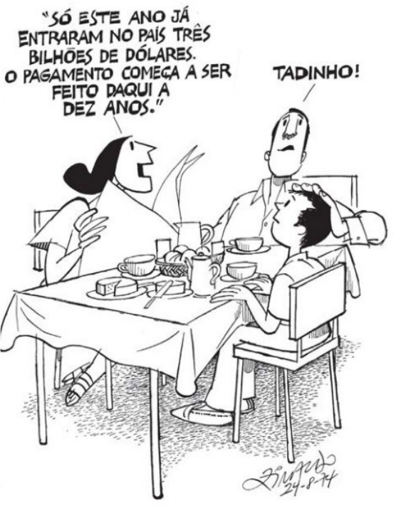 QUESTÃO 19 ZIRALDO. 20 anos de prontidão. In: LEMOS, R. (Org.). Uma história do Brasil através da caricatura (1840-2001). Rio de Janeiro: Letras & Expressões, 2001. No período de 1964 a 1985, a estratégia do Regime Militar abordada na charge foi caracterizada pela · priorização da segurança nacional. · captação de financiamentos estrangeiros. · execução de cortes nos gastos públicos. · nacionalização de empresas multinacionais. · promoção de políticas de distribuição de renda. Comentário da questão O período militar no Brasil é marcado pela grande captação de financiamentos estrangeiros, feita pelo governo. Supostamente, os juros seriam baixos e o pagamento só começaria em 10 anos, por isso a charge trabalha a ideia da criança ficando adulta e sofrendo com este cenário futuro. Na prática, sabemos que tudo foi bem pior, pois a primeira crise do petróleo desestabiliza o mundo em 1973 e o Brasil sofre com os juros flutuantes e a cobrança antecipada das dívidas. Equipe Descomplica A melhor equipe de professores do Brasil ;) Gabarito da questão Opção B