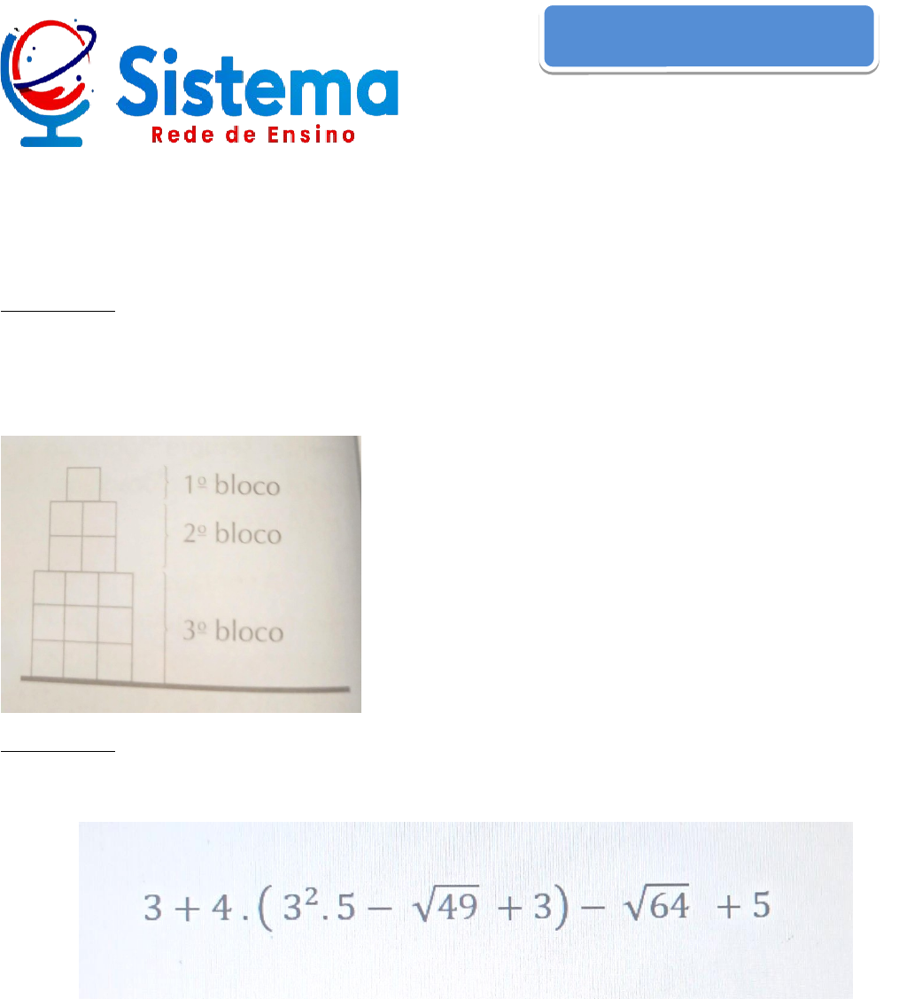 Aluno (a): ___________________________________________________ Data: __/___/2021 Prof._________________________________ Turma:__________________________________ Avaliação Parcial de Matemática 6° Ano JC Questão 01 Seguindo o mesmo padrão de construção do prédio abaixo, foi construído um outro com 8 blocos, também numerados de cima para baixo como o da figura, na qual cada quadradinho representa uma janela. Nesse novo prédio, o número de janelas do 8° bloco ( o mais próximo do chão) é : A) 24 B) 32 C) 48 D) 64 E) 128 Questão 02 O valor da expressão abaixo é: Cálculo : _________________________________. Questão 03 Seu João deseja cercar um terreno quadrado de área de 484 m², sem porteira e pretende colocar 6 voltas de arame farpado e precisa saber quantos metros de arame vai usar, ajude-o a encontrar: A) 345 metros de arame. B) 528 metros de arame. C) 243 metros de arame. D) 322 metros de arame. E) 123 metros de arame. Questão 04 Observe os relógios abaixo: Qual a sequência que indica os menores ângulos formados pelos ponteiros dos relógios A, B, C e D, nessa ordem? A) 180°, 60°, 90° e 120°. B) 120°, 90°, 180° e 60°. C) 90°, 120°, 60° e 180°. D) 9°, 12°, 6° e 18°. E) 90°, 60°, 120° e 180°. Questão 05 Roberto estava descobrindo como desenhar formas geométricas em um programa de computador. Ele desenhou um triângulo com todos os lados iguais (I); Em seguida, diminuiu um dos lados em 1 cm (II); Depois diminuiu outro lado em 3 cm (III). Assinale a alternativa que contenha, na ordem correta, a classificação dos triângulos desenhados por Roberto em I, II e III, respectivamente: A) Escaleno, equilátero e Isósceles B) Acutângulo, retângulo e obtusângulo C) Equilátero, isósceles e escaleno D) Equilátero, escaleno e isósceles Questão 06 Uma professora propôs aos seus alunos um jogo chamado “Que polígono é esse?”. Na primeira rodada foram dadas as seguintes informações: Esse polígono é um quadrilátero. Esse polígono possui quatro lados com as mesmas medidas. Esse polígono não possui os quatro ângulos retos. Esse polígono é o: _______________________________________________. Questão 07 Até no Balonismo, o brasileiro é pioneiro. Em abril de 1709, em Portugal, o padre paulista Bartolomeu Lourenço de Gusmão, aos vinte e três anos , maravilhou seus contemporâneos quando elevou pela primeira vez com sucesso aos ares um balão não tripulado,movido a ar quente, o qual foi denominado passarola. O número 23 é primo. Sendo assim, identifique a alternativa em que a quantidade de lados de um polígono é o sucessor do número encontrado quando do primeiro número primo formado por dois algarismos diferentes, subtrai-se o segundo número primo ímpar. A) heptágono. B) octógono. C) eneágono. D) decágono. E) icoságono. Questão 08 Qual das formas abaixo não pode ser obtida a partir de um único corte em linha reta feito em um quadrado de papel? ____________________________. Questão 09 Observe os triângulos apresentados na malha quadriculada abaixo. Qual desses triângulos é isósceles? ________________________. Questão 10 Observe as retas que aparecem na figura abaixo e localize nelas: a) Duas retas paralelas ___________. b) Duas retas concorrentes e perpendiculares. ___________. c) Duas retas concorrentes obliquas. ________________. Profª Kátia Medeiros.