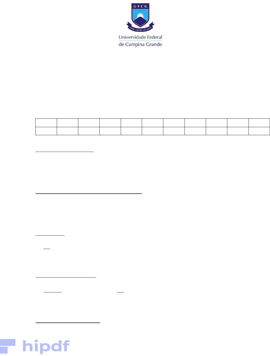 UNIVERSIDADE FEDERAL DE CAMPINA GRANDE ALUNO: Matrícula: PROFESSOR: Alexandre Gama b) Faça o tratamento estatístico das tangentes de Ө. Atenção: faça este item você mesmo. 1 2 3 4 5 6 7 8 9 10 15,0 18,0 17,5 16,0 19,0 19,5 17,0 20,0 16,5 17,0 Somatório das Tangentes: ¿∑ 1 10 tg (15 ° )+tg (18 ° )+ tg (17,5° )+tg (16 ° )+tg (19 ° )+ tg (19,5° )+tg (17 ° )+tg (20° )+tg (16,5° )+tg (17 ° )=3,166547073 Somatório das Tangentes elevada ao quadrado: ¿∑ 1 10 tg (15 ° )2+tg (18 ° )2+tg (17,5 ° )2+tg (16 ° )2+tg (19° )2+tg (19,5 °)2+tg (17 ° )2+tg (20 ° )2+tg (16,5 ° )2+ tg (17 ° )2=1,0109556826 Valor Médio: θ= 1 10 ∑ 1 10 0,3165004341=0,0316500434 Desvio padrão das leituras: θ= 1 (10−1) [∑i=1 10 (1,0109556826)2− 1 10(∑i=1 10 (0,0316500434)) 2]=0,1 Valor Verdadeiro da Medida: θ= 0,1 √10 =0,0316227766 Para as séries de leituras abaixo, escreva uma leitura qualquer e também o valor verdadeiro. 1) I) ¿ ∑ 1 N '=4 8+15+17+7=47 II) ∑ i=1 47 V i=∑ 1 N '=4 N iV i=[(8∗31,38)+(15∗31,39)+(17∗31,40)+(7∗31,41)]=¿1.475,56 ¿ III) ∑ i=1 47 V i 2=∑ 1 N '=4 V i 2=¿¿ Valor Médio: V= 1 47 ∑ i=1 47 V i=V= 1507,9 47 =0,82 V i=(31,39±0,82) Desvio Padrão das Leituras: σ v√ 147−1 [∑i=147 V i2− 147(∑i=147 V i)2]⇒ √ 147 [47.325,06− 147 1507,92]=0,87 2) I N i V i 1 8 31,38 2 15 31,39 3 17 31,40 N’ =4 7 31,41 I N i V i 1 6 49,8 2 18 49,9 3 14 50,0 N=4 8 50,1 I) ∑ i=1 N=4 N i=6+18+14+8=46 II) ∑ i=1 46 V i=¿∑ i=1 N=4 N iV i=[(6∗49,8)+(18∗49,9)+(14∗50)+(8∗50,1)]=2297,8¿ III) ∑ i=1 46 V i=∑ i=1 N=4 V i 2=¿¿¿ Valor Médio: V= 1 46 ∑ i=1 N=4 V i=V= 2297,8 46 =49,9 Desvio Padrão das Leituras: σ V=√ 146−1 [∑i=1 46 V 1 2− 1 46 (∑i=1 46 V i) 2]⇒ √ 145 [114780,5− 146 2297,82]=0,008 V i=(49,9±0,008) 3) Valores V i : 11,30; 11,33; 11,29; 11,31; 11,32; 11,30; 11,31; Valor Média: V=1 7 ∑ i=1 N= 4 V i=V= 79,16 7 =11,31 4) ValoresV i : 13,20; 13,23; 13,25; 13,24; 13,18; ∑ i=1 5 V i=13,20+13,23+13,25+13,24+13,18=66,1 ∑ i=1 5 V i 2=¿¿ Valor Médio: V=1 5 ∑ i=1 5 V i=V= 66,1 5 =13,22 Desvio Padrão das Leituras: σ V=√ 15−1 [∑i=1 5 V 1 2−1 5 (∑i=1 5 V i) 2]⇒ √ 14 [114780,5−15 2297,82]=0,0291548 σ Vm= σv √N =0,0291548 √5 =0,0130384229 Leitura:V i=(13,22±0,02 ) Leitura:V v=(13,22±0,01) 5) Em três séries de leituras de uma grandeza V, foram obtidos os seguintes resultados para o valor verdadeiro de V: V 1 = (35,30 ± 0,34); V 2 = (36,0 ± 0,8); V 3 = (34,90 ± 0,26); Determine o melhor valor para a grandeza V. X= 35,30 1 0,342 +36 1 0,82 +34,90 1 0,262 √ 10,342+ 10,82+ 10,262 =305,3633217993+56,25+516,272123491 8,6505190311+1,5625+14,79289940283 =877,8855152903 20,0059194336 =35,1071094478 σ Vm 1 √ 10,342+ 10,82 10,262 = 1 5,00059 =0,199976 Leitura: V = (35,11 ±0,20 ¿