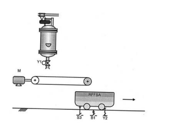 1. Sistema de Carregamento de Vagões Com a chave de partida acionada (PTD), ao chegar um novo vagão (sensor S3 acionado) liga-se o motor da esteira. a eletroválvula Y1 que libera o minério contido no silo, e desliga-se o solenoide Y2 que impede que o vagão se mova. O Sensor B1 é um sensor de pesagem que aciona quando o vagão se encontrar carregado. Quando isso ocorrer, a eletroválvula Y1 deve desligar e aguarda-se 7 segundos para que todo o minério presente na esteira possa ir para o vagão. Após este tempo, aciona-se o solenoide Y2 possibilitando o movimento do vagão. A partir deste instante se em 15 segundos não houver chegado um novo vagão, o da esteira desliga-se, caso contrário, dá-se início ao processo de enchimento do vagão. A lâmpada liga quando o ciclo estiver em funcionamento. 2. Controle de 3 Esteiras Com monitoramento dos motores Três esteiras que transportam amendoins devem ser inicializadas ao mesmo tempo e devem desligar em diferentes tempos para garantir um transporte seguro e sem interrupções. Quando o botão de início for pressionado. as esteiras devem ligar sequencialmente em intervalos de 5 segundos sendo a esteira 3 a primeira a ligar. Quando o botão de parada for pressionado, esteiras desligam também sequencialmente em 5 segundos, porém a primeira a desligar deve ser a esteira 1. Cada motor possui um sensor de corrente que uma vez acionado indica que o respectivo motor está sobrecarregado. Quando qualquer dos três motores estiver nessas condições, todos devem imediatamente ser desligados e um painel com três lâmpadas deve informar qual motor está com defeito. 3. Processo de mistura e aquecimento O sistema deve ser habilitado quando o start for pressionado e desabilitado quando o stop for pressionado. Encha o tanque com o ingrediente 1 até low level. Termine de encher o tanque com o ingrediente 2. Quando o tanque estiver cheio comece a misturar os ingredientes e aquecer por 10 Segundos. Após a mistura e aquecimento, drene o tanque da mistura através do acionamento da válvula "Drain Valve”(válvula de drenagem ) e do motor "Drain Pump"( bomba de drenagem ). A lâmpada liga quando o ciclo estiver em funcionamento. 4. Cortador de chapas A máquina é uma cortadora de chapas e sua programação funciona da seguinte forma: Ao pressionar o botão de START dois processos acontecem simultaneamente: A esteira das chapas liga até que a chapa chegue no sensor S2, e depois desliga, e a esteira das caixas liga até que o sensor S3 perceba a presença de uma caixa, e depois desliga. Então a chapa é cortada pelo cilindro C1, o cilindro recua e a esteira das caixas liga até que o sensor S3 não perceba mais caixas, finalizando o ciclo e dando condição para um novo ciclo. A lâmpada liga quando o ciclo estiver em funcionamento e o botão STOP encerra o funcionamento. Se demorar 10 segundos e a caixa não for detectada pelo S3 deverá parar o processo e acionar um alarme. 5. Separador de peças Ao pressionar o de start a esteira M1 liga e o cilindro C1 avança, a peça que se desloca pela esteira é testada pelos sensores que verificam sua altura. Peças grandes que são detectadas pelos sensores S3 e S2 seguem até o final da esteira e caem na caixa das peças grandes. Peças pequenas são detectadas por S3, então o cilindro C2 avança, conduzindo a para a caixa das pequenas. Ambos os tipos de peças ao passarem pelo sensor em suas caixas encerram o ciclo, desligando a esteira e recuando os cilindros, dando condição para um novo ciclo. Se demorar 10 segundos e a peça não for detectada pelo S3 deverá parar o processo e acionar um alarme. A lâmpada liga quando o ciclo estiver em funcionamento e o botão STOP desabilita o funcionamento. 6. Seletor de peças Ao pressionar o botão de START a esteira liga desde que exista uma peça no sensor S1 e transfere a até o final da esteira onde é feita a análise do tipo de material (S2 metal e S3 não metal). As peças devem ser alocadas conforme seu material pelos cilindros C1 e C2. Após algum dos cilindros conduzir a peça para sua determinada rampa a esteira para e o cilindro em questão recua, finalizando o ciclo e dando condição para um novo ciclo. Se a esteira estiver ligada por 10 segundos e a peça não for detectada pelos sensores de material, o processo deve parar. A lâmpada liga quando o estiver em funcionamento e o STOP finaliza o processamento. 7. Encaixotador de laranjas Ao sinal de ON, a esteira das caixas entra em funcionamento. O sensor das caixas (SB) ao detectar uma caixa desliga a esteira das caixas e aciona a esteira das laranjas. O sensor das laranjas (SA) detecta as laranjas que entram na caixa. Após a caixa receber 6 laranjas a esteira das laranjas desliga e a das caixas entra em funcionamento. Se o processo ficar 10 segundos sem receber caixas ou laranjas, um alarme deve ser acionado e o processo deve parar. O sinal de OFF desliga todo o processo.