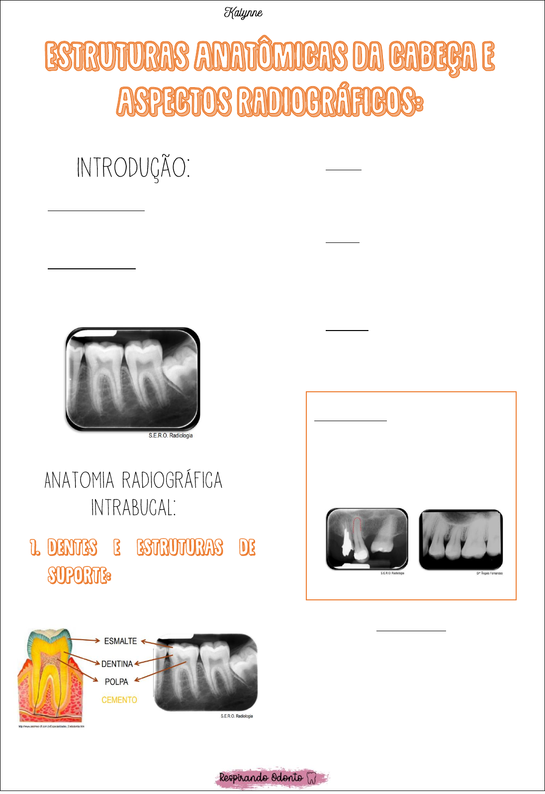 P4 – ODONTOLOGIA UNINASSAU RN - @respirando_odonto [Diagnóstico|em|Odontologia] • Imagens radiolúcidas: estruturas que não oferecem resistência aos raios X (ESCURAS). – Tecido mole. • Imagens radiopacas: estruturas que oferecem resistência aos raios X (CLARAS). - Estruturas mineralizadas (dificuldade dos raios X ultrapassarem). • Esmalte: É o tecido de maior minerali1.ação do dente, apresentando radíograficamente a imagem mais radiopaca dos tecidos dentários, recobrindo toda a coroa. • Dentina: Possui menor grau de mineralização e por isso radiograficamente aparece menos radiopaca do que a estrutura do esmalte, pelo qual é recoberta e protegida na porção coronária. • Cemento: Linha branca que recobre a dentina radicular. Sua composição mineral é semelhante a da dentina – por isso, não é radiograficamente aparente, não dá para diferenciá-lo da dentina. Burnout cervical Presença de imagens radiolúcidas na cervical dos molares que são sugestivas de cárie. Na verdade, é uma ilusão óptica, causada pela anatomia normal do dente afetado, o que resulta na diminuição da absorção dos raios X nas áreas em questão. Para diferenciar de uma cárie, deve- se realizar o exame clínico. Hipercementose: é uma alteração de desenvolvimento que caracteriza-se pelo aumento na produção do cemento. Visualiza- se o ápice do dente “mais gordinho”, que configura a deposição exagerada de cemento – nesse caso, dá para observar na radiografia. P4 – ODONTOLOGIA UNINASSAU RN - @respirando_odonto • Polpa: A polpa dos dentes normais é composta de tecido mole e, consequentemente, aparece como radiolúcida. Se estende da porção coronária, onde simula o formato da coroa, adquirindo uma forma afilada nas raízes, representada pelos condutos radiculares. • Lâmina dura: É a cortical óssea que envolve a porção radicular. Na radiografia aparece como uma linha radiopaca contínua, contornando o espaço pericementário, de extrema importância, pois a sua descontinuidade representa o primeiro sinal radiográfico das alterações periapicais (vista somente na radiografia). Lâmina dura ao redor do alvéolo do dente extraído – ela irá desaparecer com o tempo (reabsorvida).. • Espaço do ligamento periodontal: está entre a lâmina dura e o dente (espaço radiolúcido). Se o ligamento periodontal existe, o dente está saudável. Ele é mais estreito em pessoas mais velhas. Esse espaço inicia-se na crista alveolar, estende-se em volta da porção das raízes do dente dentro do alvéolo e retorna à crista alveolar do lado oposto do dente. • Crista Alveolar: É a margem gengival do processo alveolar que se estende entre os dentes, se apresenta na radiografia como uma linha radiopaca. A crista alveolar pode retroceder apicalmente com a idade e apresentar evidente reabsorção com doença periodontal. A forma da crista é importante para o diagnóstico de doença periodontal. Reabsorção da crista (se torna radiolúcida) é um sinal de periodontite. • Osso alveolar: O osso medular (também chamado de osso trabecular ou osso esponjoso) fica no meio das placas corticais em ambos os maxilares. É composto de finas trabéculas radiopacas que circundam diversas e pequenas bolsas medulares radiotransparentes. - Na maxila: um osso mais delicado com espaços medulares menores. P4 – ODONTOLOGIA UNINASSAU RN - @respirando_odonto - Na mandíbula: espaços medulares maiores, resultando num padrão mais grosseiro. Região de Incisivos centrais: • Sutura Intermaxilar / Mediana – linha radiolúcida: Corresponde à junção das maxilas, sendo representada radiograficamente por uma linha radiolúcida, com contorno irregular, localizada entre os incisivos centrais superiores, muitas vezes sobreposta ao forame incisivo. É melhor evidenciada nas radiografias periapicais de indivíduos jovens. • Forame incisivo/ nasopalatino/ palatino anterior: Encontrado radiograficamente entre as raízes dos incisivos centrais superiores, como uma imagem radiolúcida com formato ovalado ou acredondado, podendo variar de tamanho e de radiolucidez e, muitas vezes, de difícil identificação. Este forame representa a abertura do canal incisivo para a cavidade bucal. • Espinha nasal anterior: Este espaço anatômico, correspondente a uma saliência óssea localizada na região mediana da borda inferior da cavidade nasal, também poderá ser observado nas radiografias periapicais de incisivos centrais superiores, acima dos ápices dentários, na região da linha média, como uma imagem radiopaca em forma de V. • Cavidade nasal: As fossas nasais apacecem na radiografia periapical de incisivos centrais superiores, acima dos ápices dentários, como imagens radiolúcidas, separadas por uma faixa radiopaca, que se estende do assoalho ao teto da cavidade nasal, correspondendo ao septo nasal ósseo. P4 – ODONTOLOGIA UNINASSAU RN - @respirando_odonto • Cavidade nasal – conchas nasais inferiores: A cavidade nasal contém sombras opacas das conchas inferiores que se estendem das paredes laterais direita e esquerda em distâncias variáveis através do septo. Essas conchas preenchem quantidades variáveis da porção lateral da cavidade. • Septo nasal: • Projeção do nariz: O tecido mole da ponta do nariz é frequentemente visto nas projeções de incisivos laterais e centrais superiores, sobrepondo-se às raízes destes dentes. Ocasionalmente, as projeções radiotransparentes das narinas podem ser identificadas, especialmente quando uma angulação vertical maior for usada. Região de Incisivos Laterais e Caninos: • Fosseta lateral ou Mirtiforme: Corresponde a uma imagem discretamente radiolúcida, situada entre o incisivo lateral e o canino superiores, apresentando-se de forma alongada, que imprime o registro da fosseta ou depressão óssea supraincisal, na qual ocorre a inserção do músculo abaixador do septo (músculo mirtiforme). A imagem não deve ser interpr